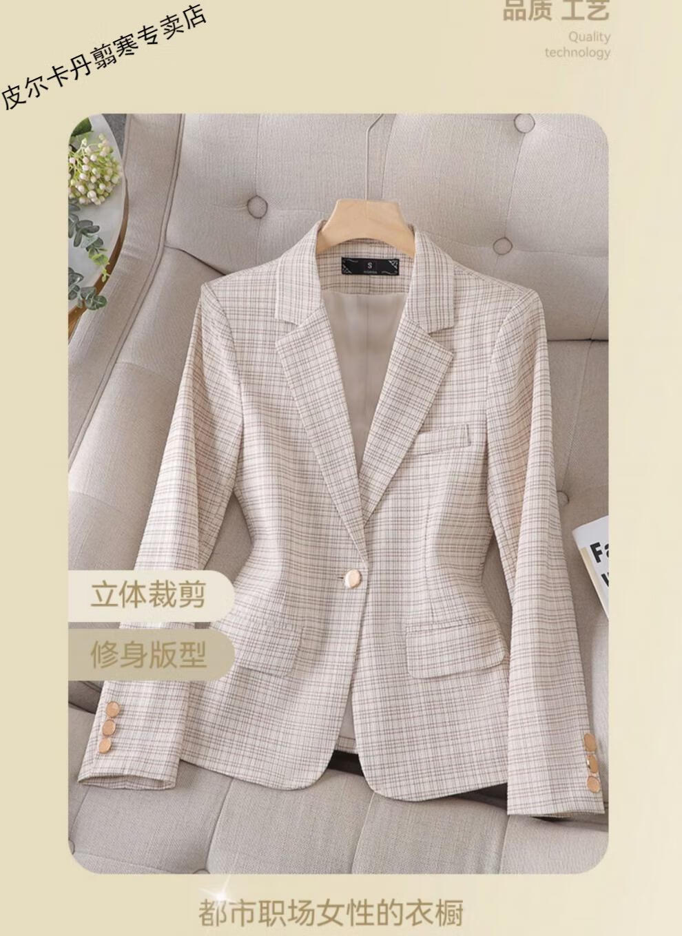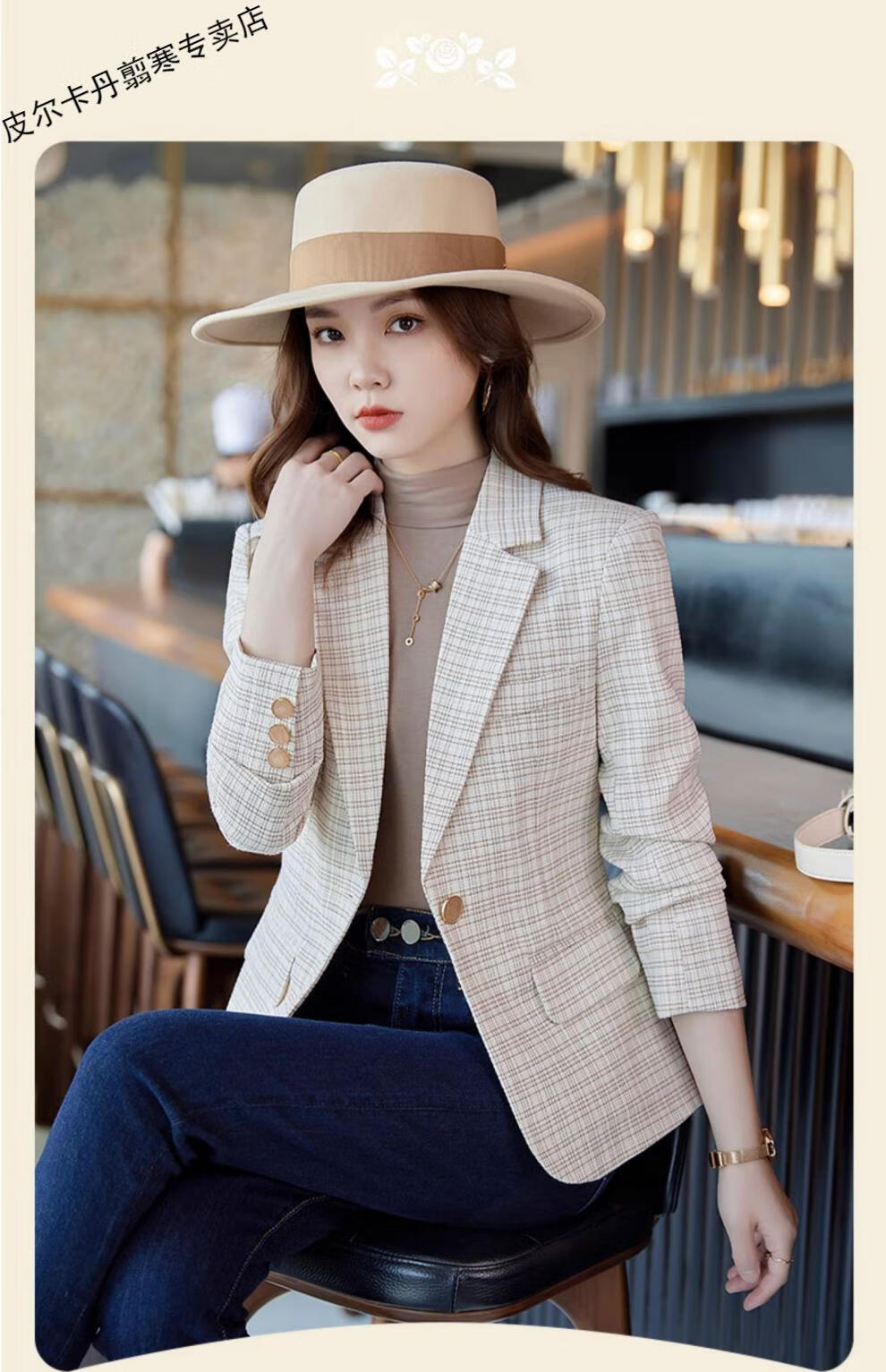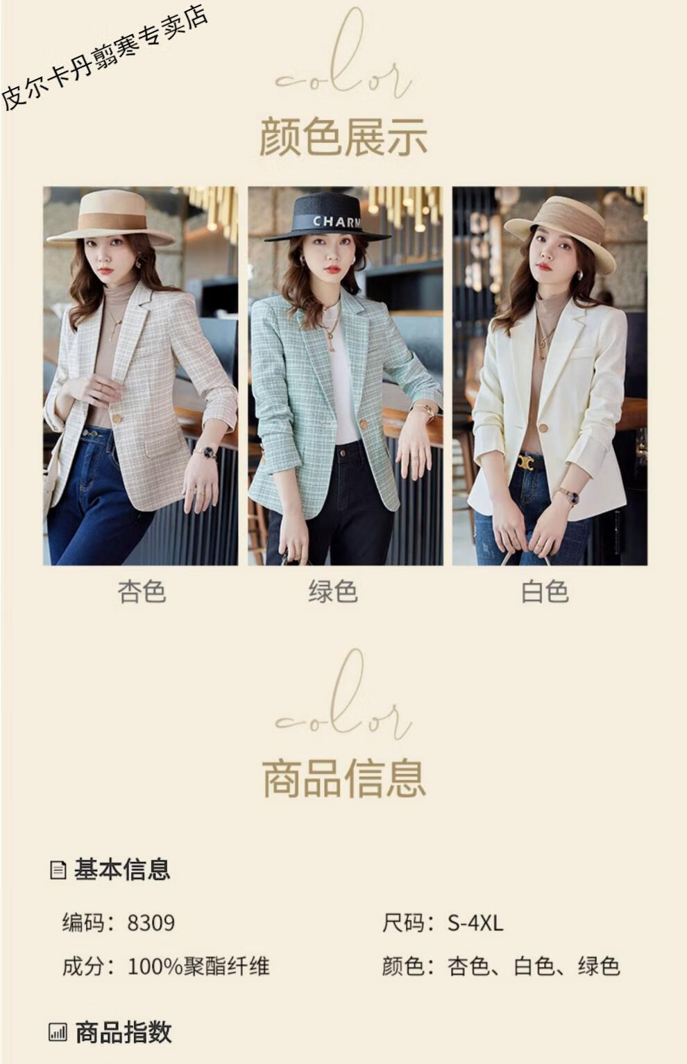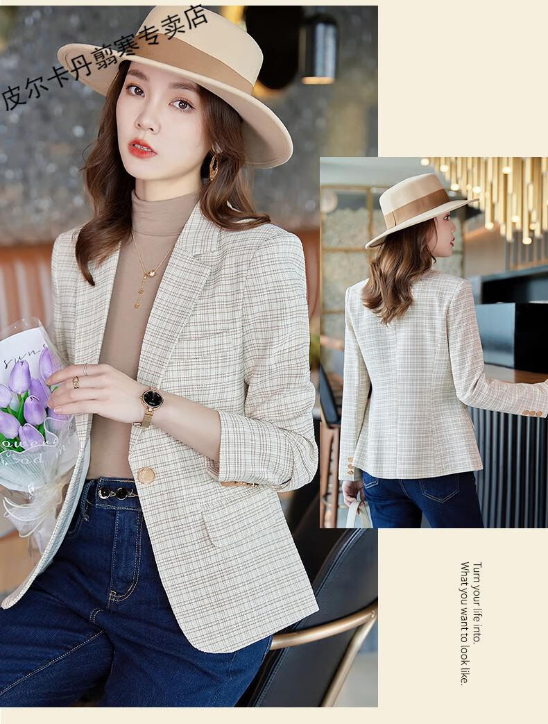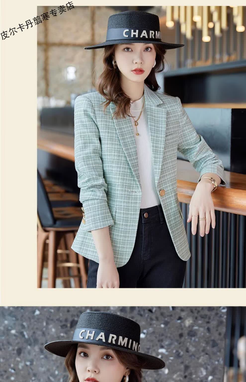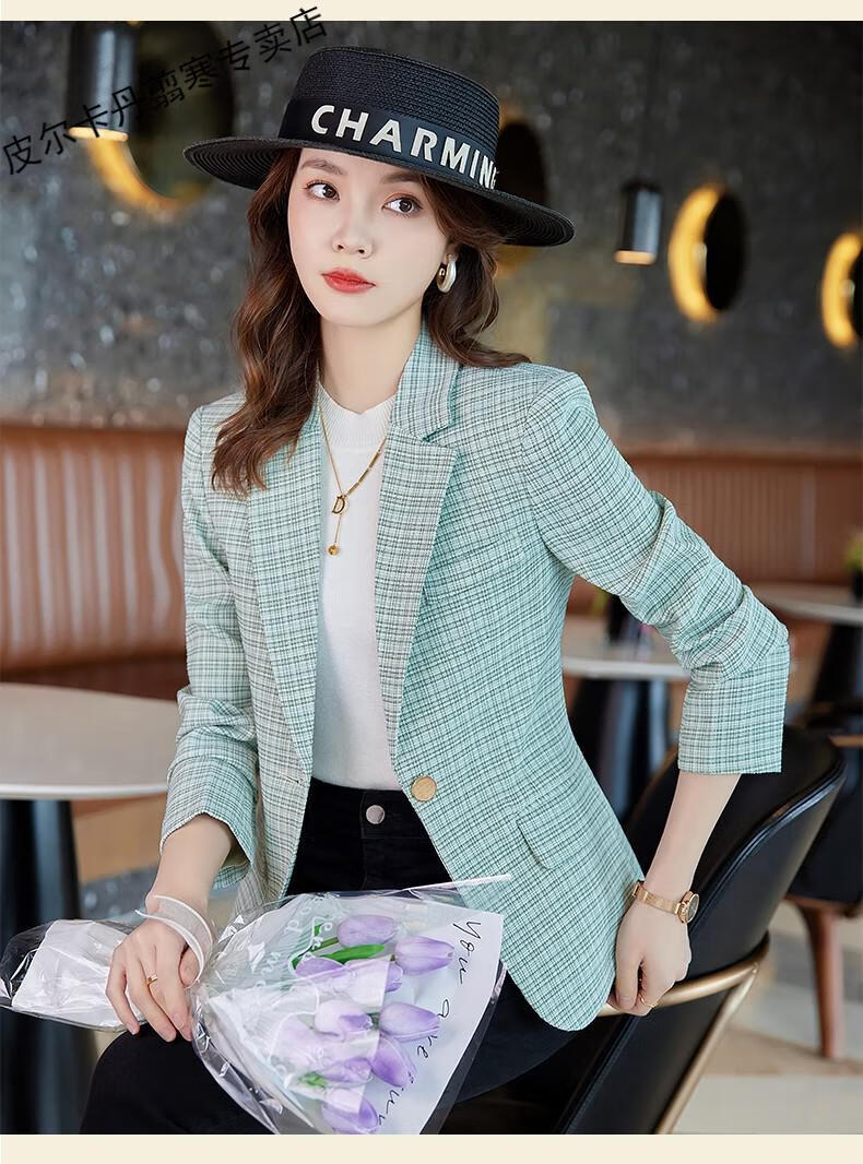 Pierre Cardin Plaid Small Suit Women's Short Fashion Casual Long Sleeve Women's Professional Suit Cardigan Jacket New Temperament Top Green Suit (Coat Women) XL 116-125Jin Jin equals 0.5 kg