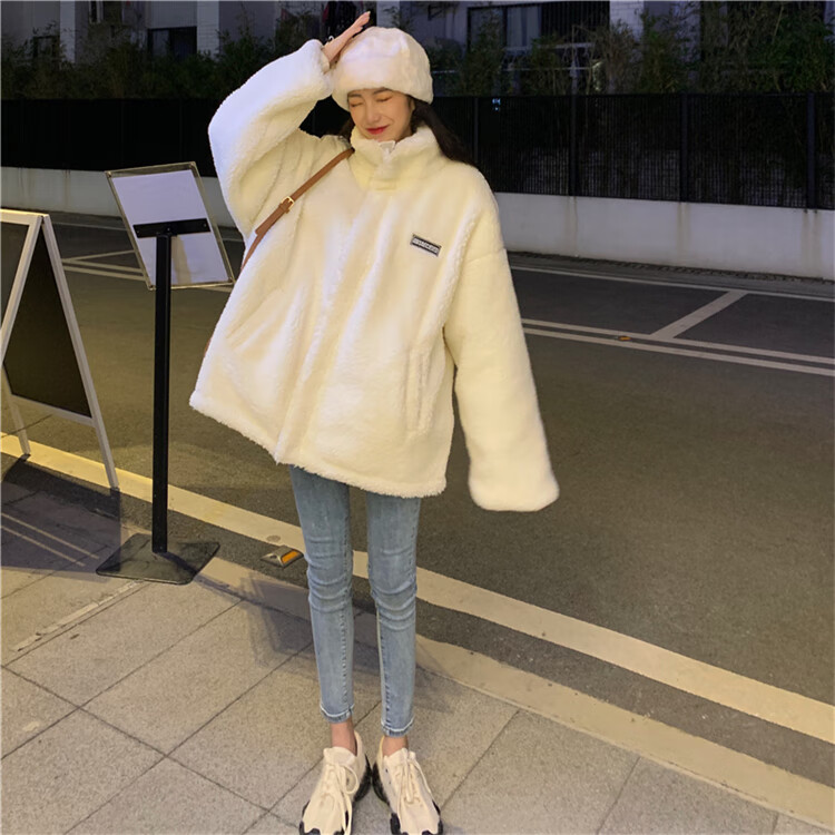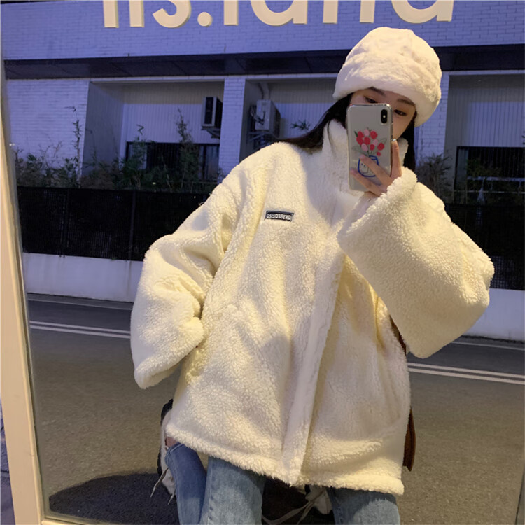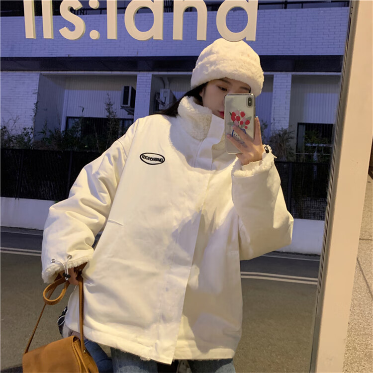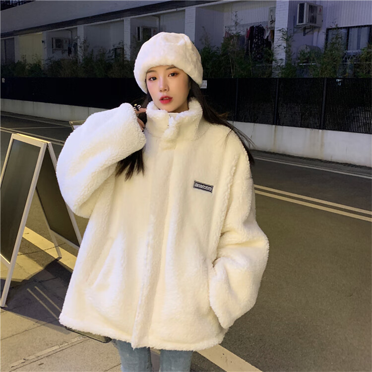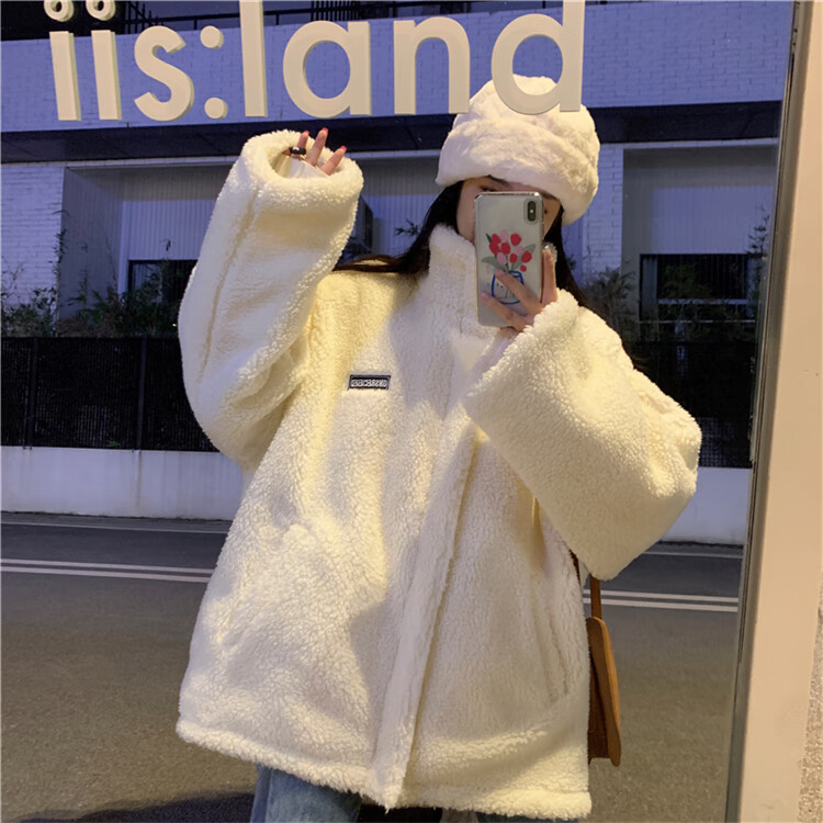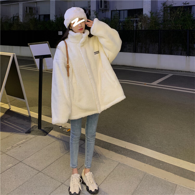 Ai Zhuer reversible lamb wool coat for women autumn and winter new Korean style loose thickened lamb wool cotton clothes for women white one size fits all (recommended 80-140 Jin Jin equals 0.5 kg)