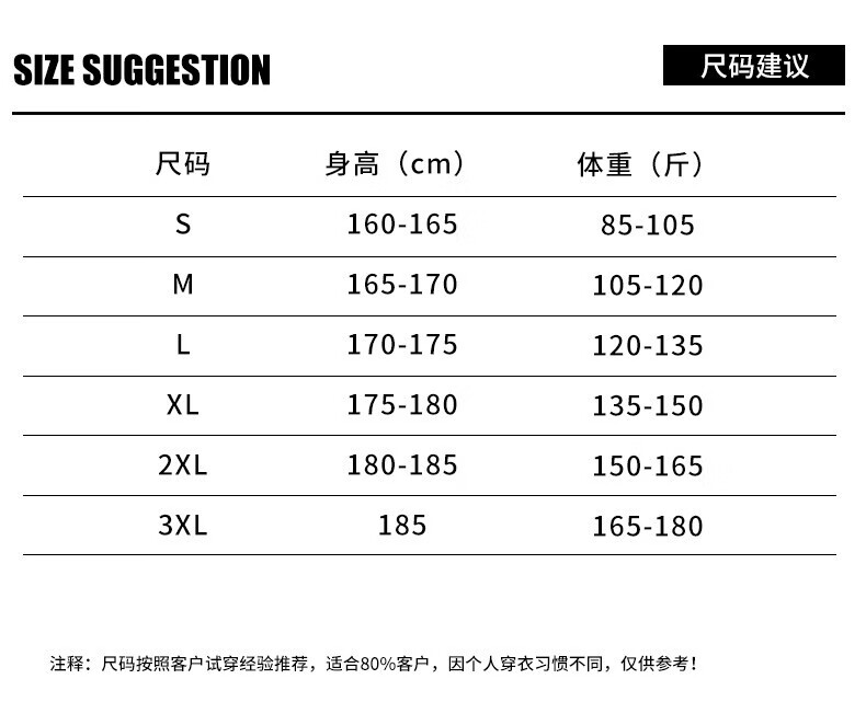China (cm) 165 / 88-90 170 / 96-98 175 / 108-110 180 / 118-122 185 / 126-130
