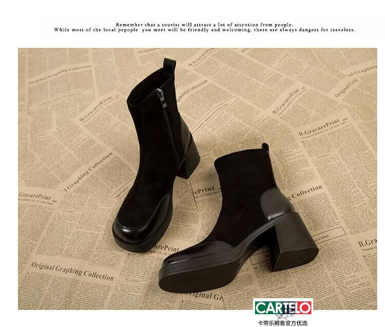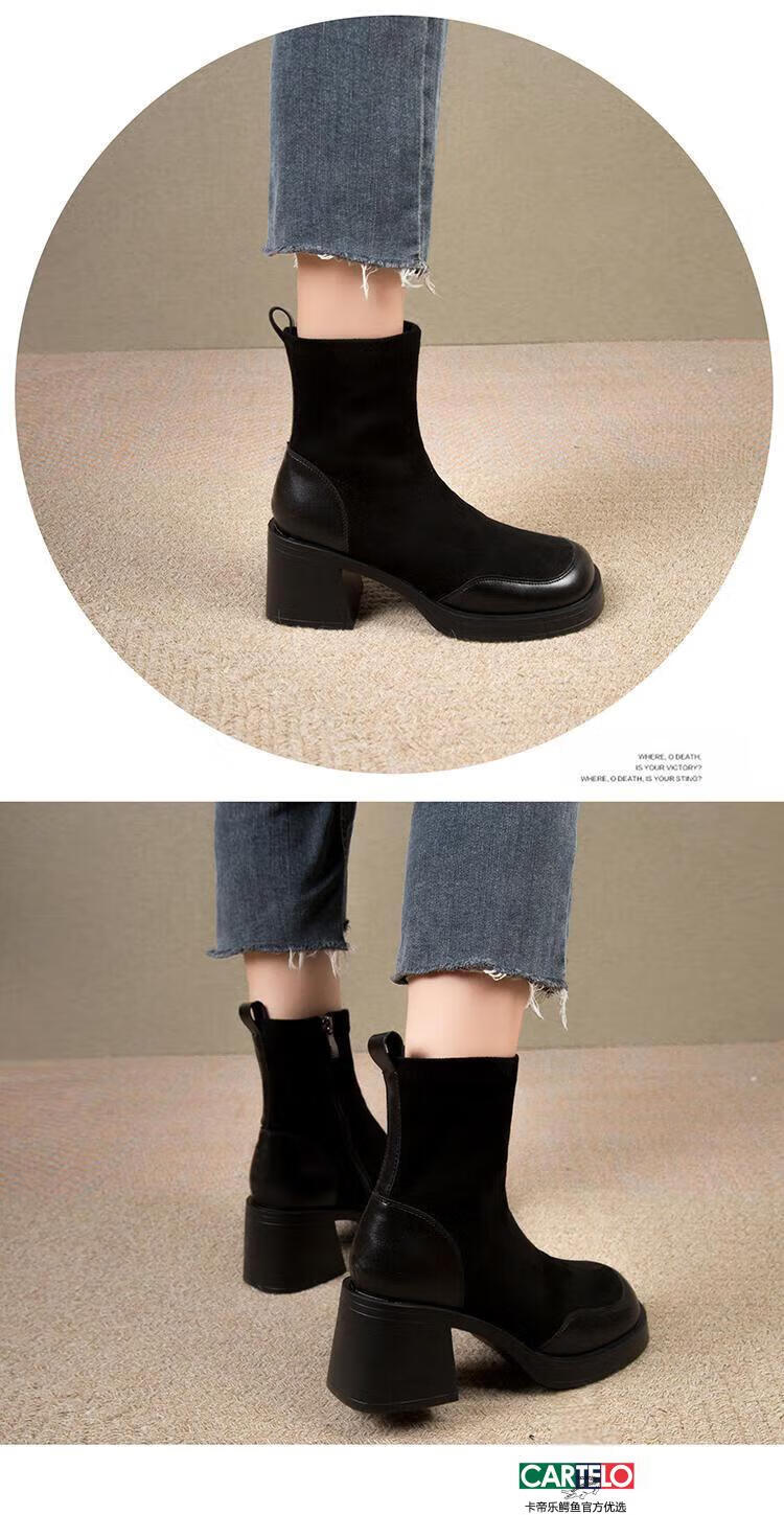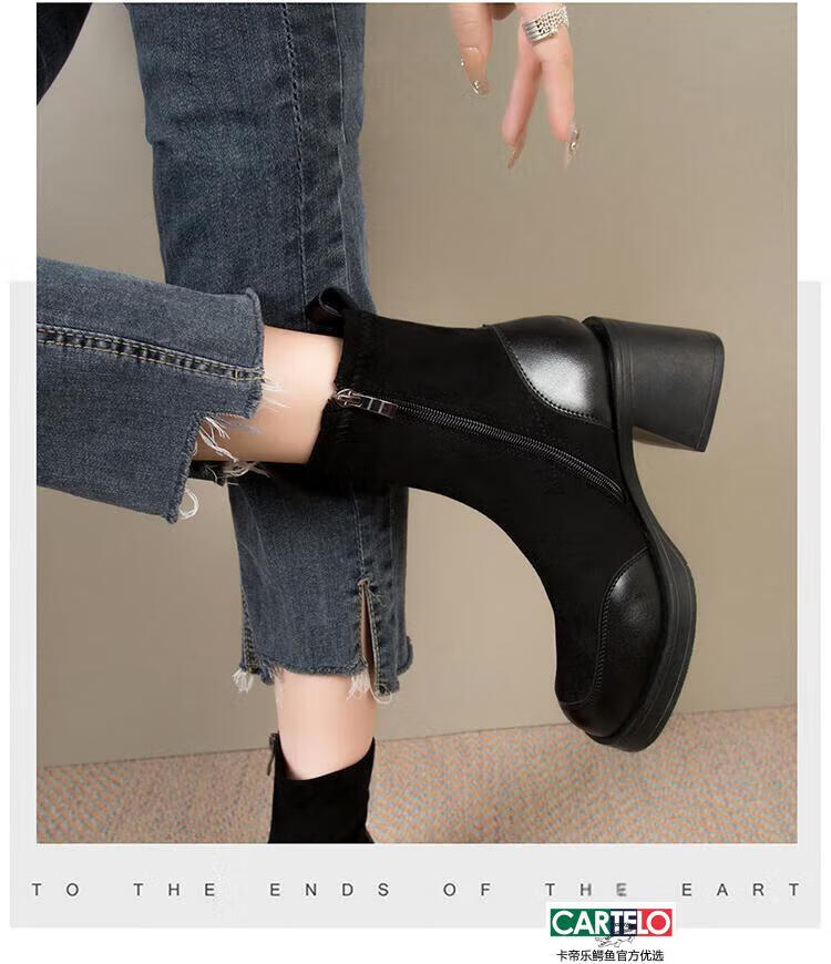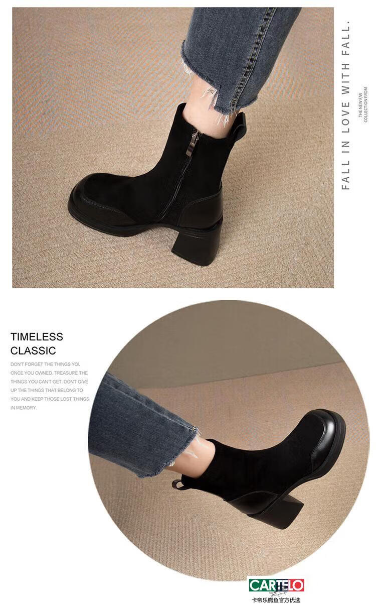CARTELO genuine leather high-heeled boots for women 2025 autumn and winter new Korean style small ankle boots this year's popular small fragrant style thick heel short boots black upgraded version 36