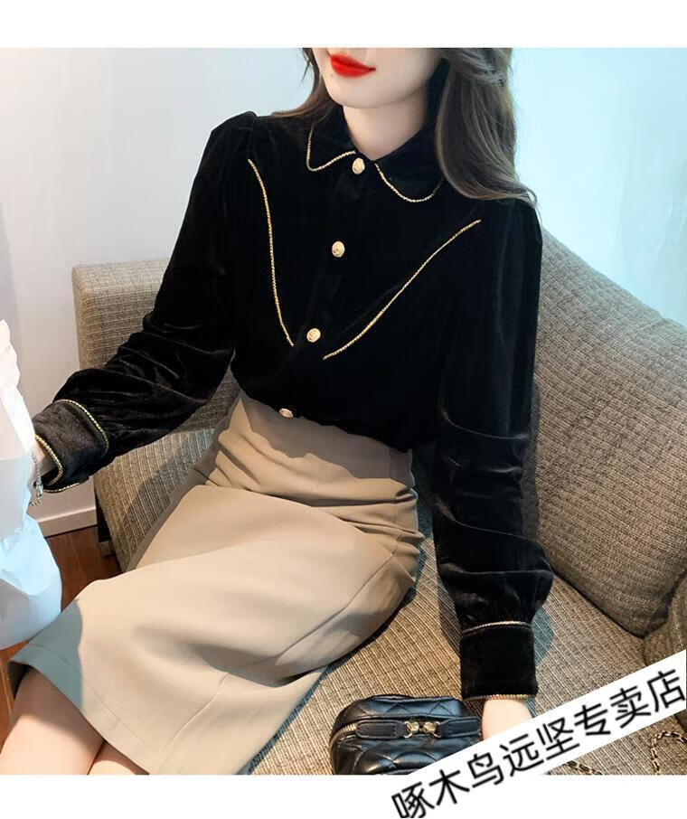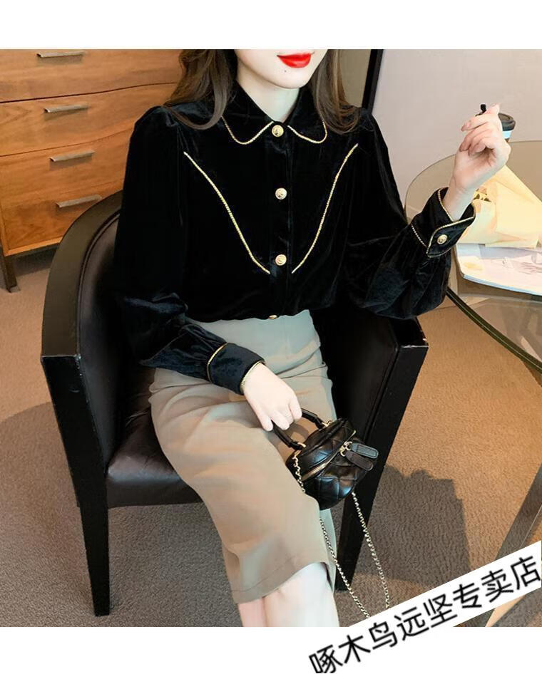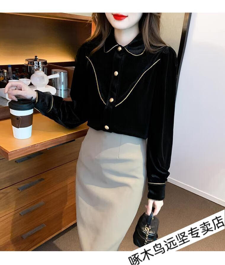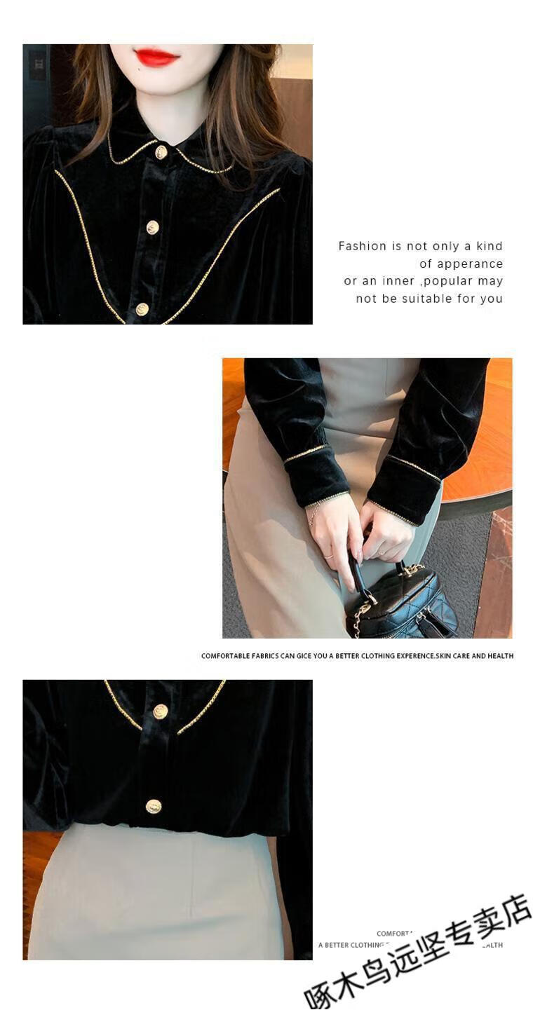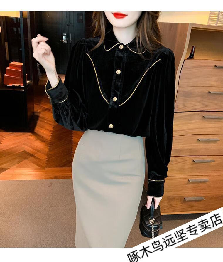 Woodpecker autumn and winter velvet thickened shirt for women 2025 new fashionable gold velvet top winter base layer shirt black plus/velvet XL