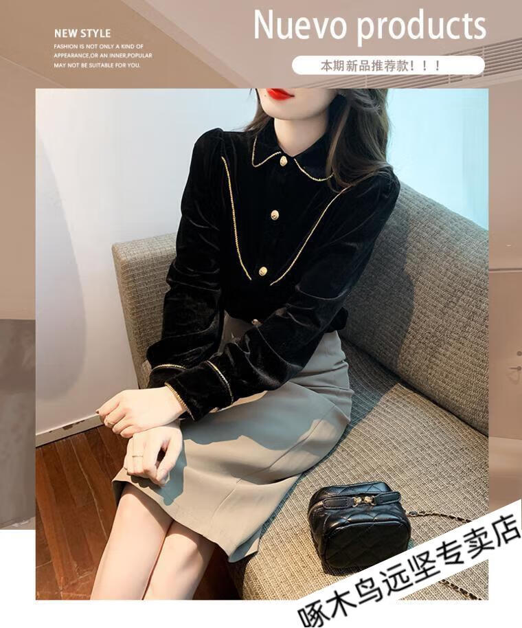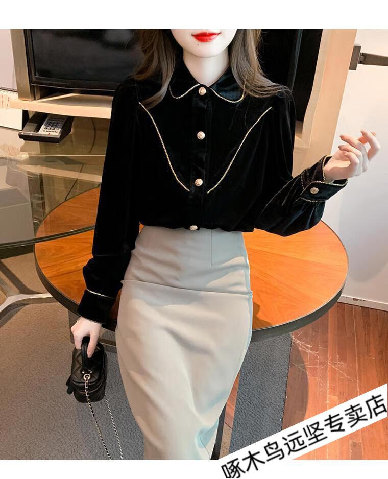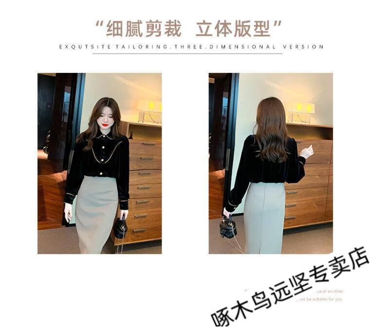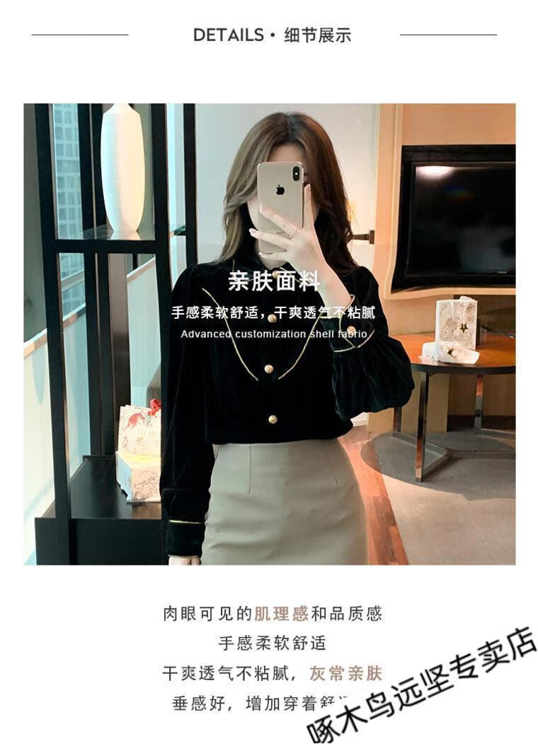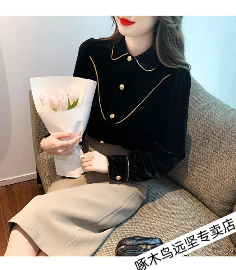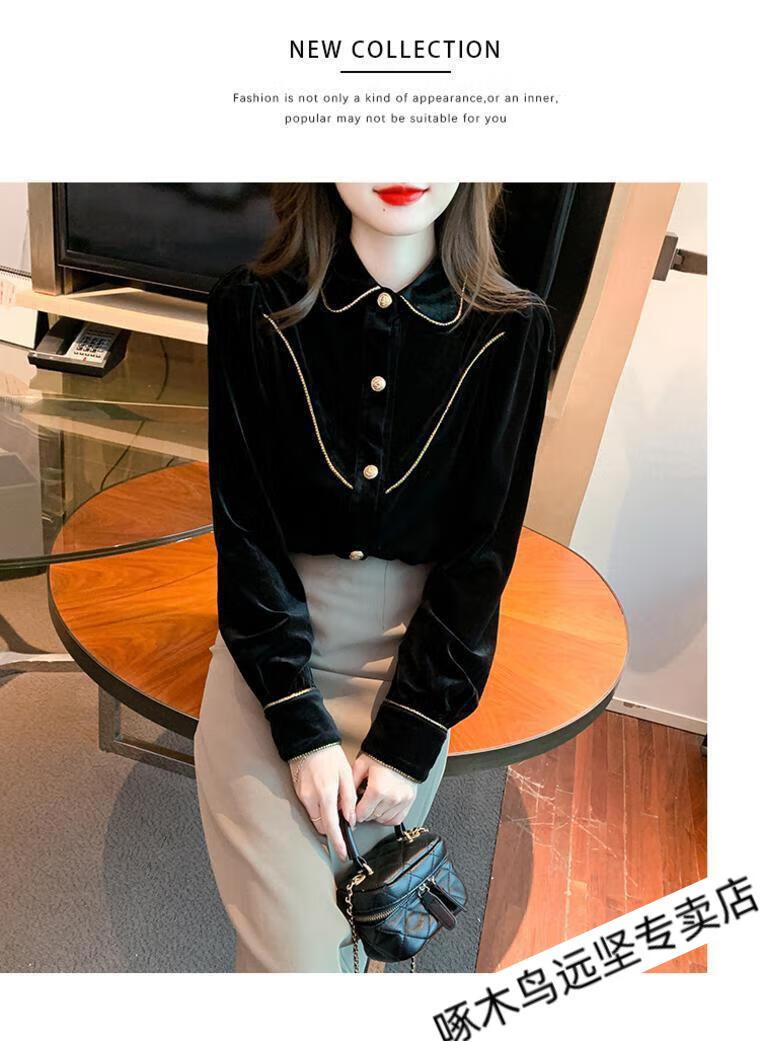 Woodpecker autumn and winter velvet thickened shirt for women 2025 new fashionable gold velvet top winter base layer shirt black plus/velvet XL