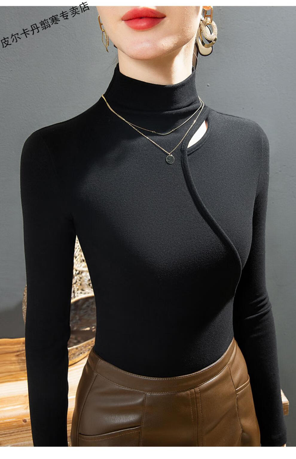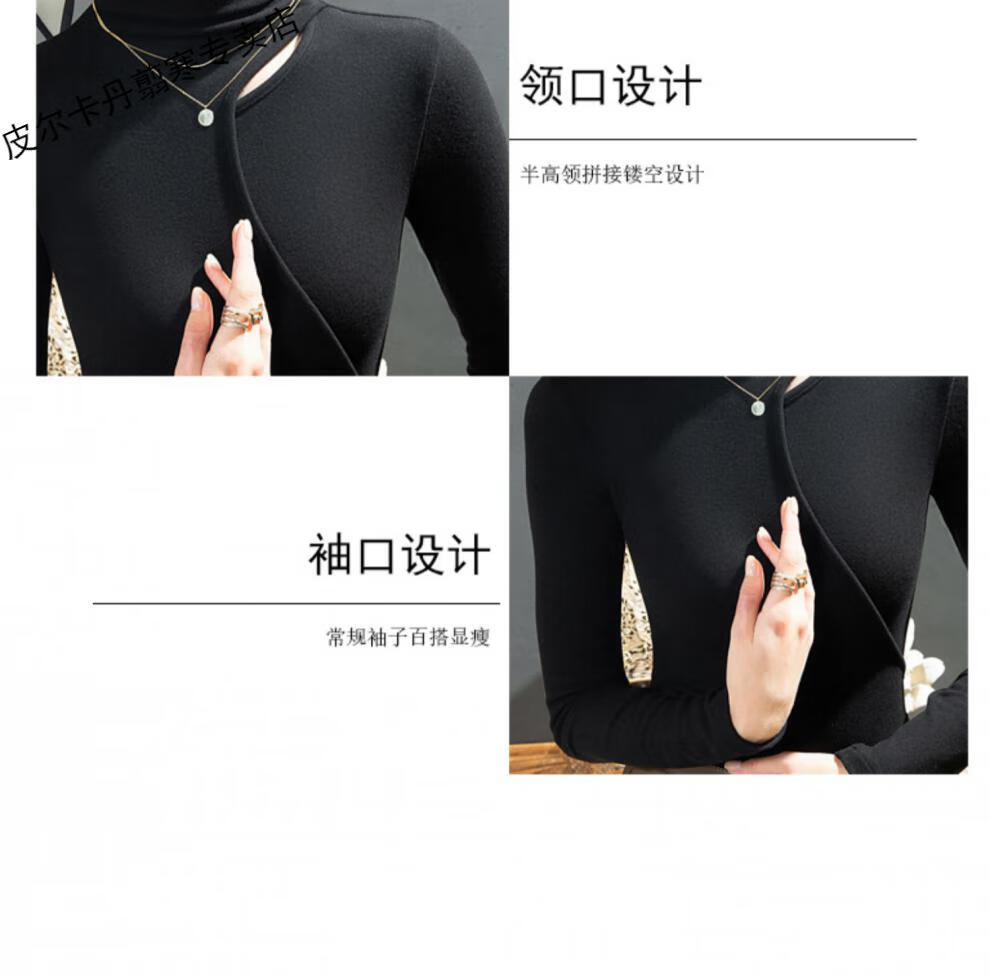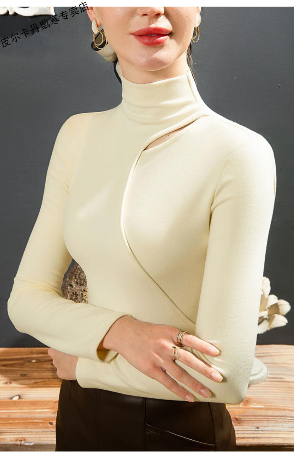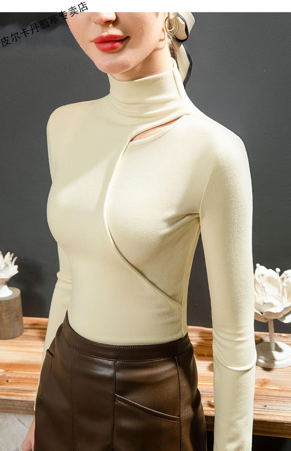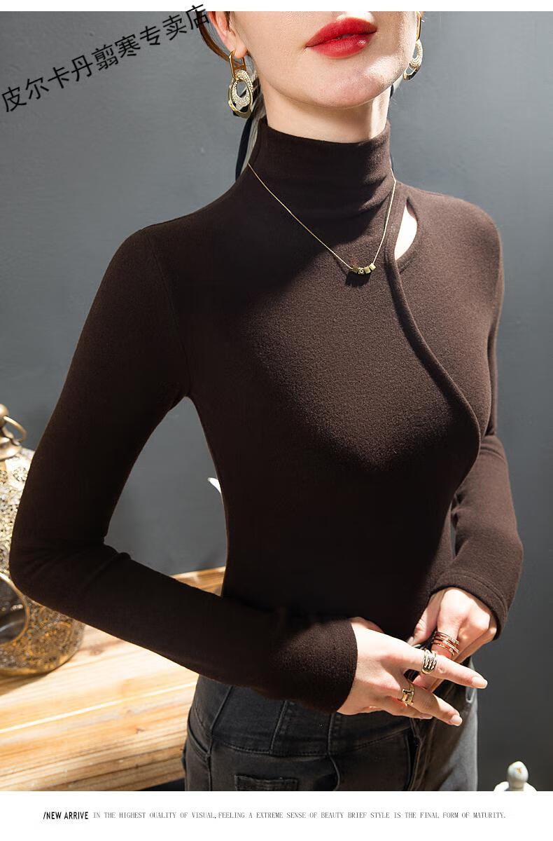 Pierre Cardin Double-sided German Velvet T-shirt Women's Half Turtle Collar Ripped Bottoming Shirt Spring and Autumn Slim-fit Brushed Irregular Splicing Top Brown L