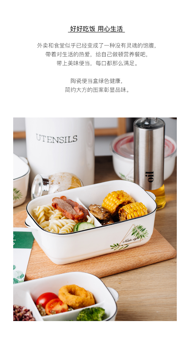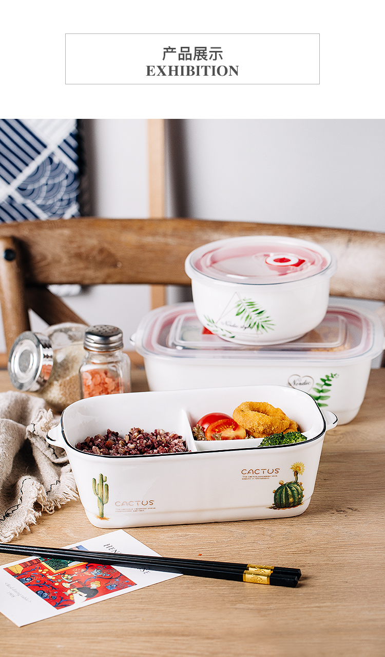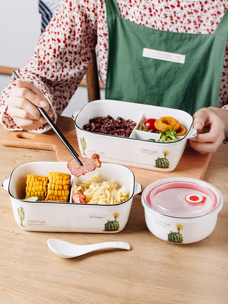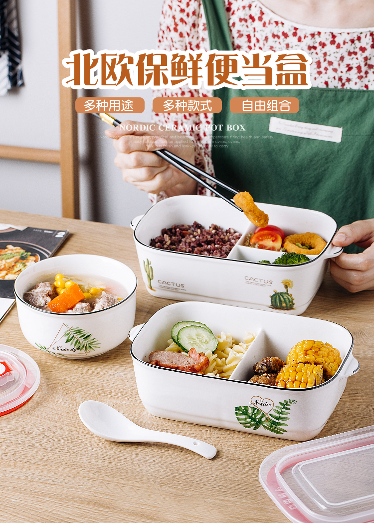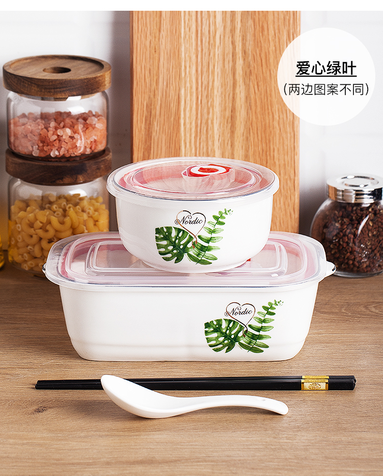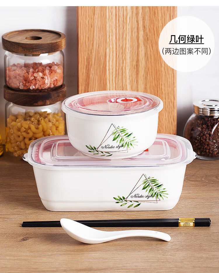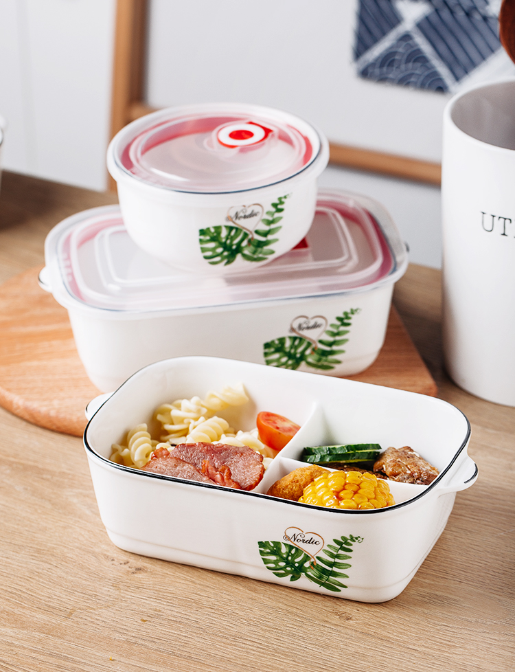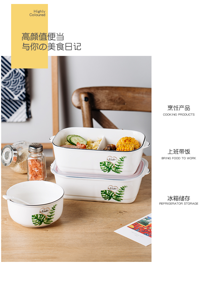 Fuluqi Ceramic Lunch Box Ceramic Compartment Lunch Box Microwave Lunch Box with Lid Sealed Office Worker Belt Geometric Green Leaf Three Compartments Free Spoon and Chopsticks