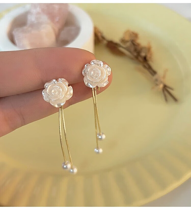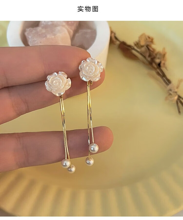Bo Na Ling Camellia Tassel Ear Clip No piercing earrings Painless Light Luxury Earrings Feminine Socialite French Camellia Camellia Tassel Ear Clip