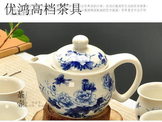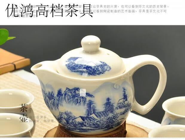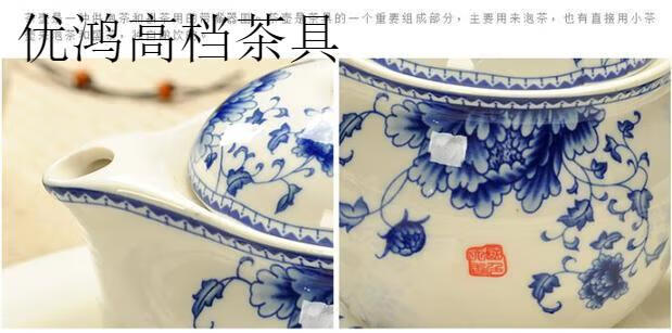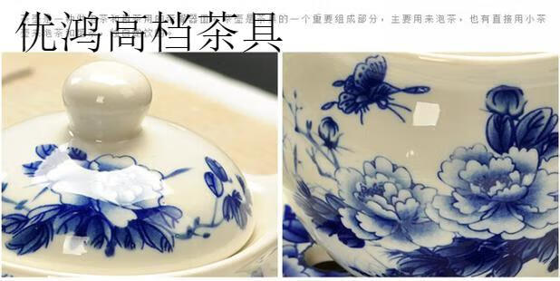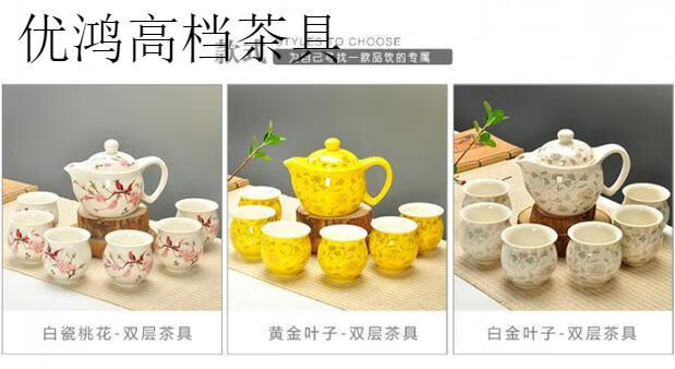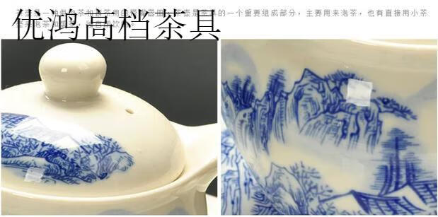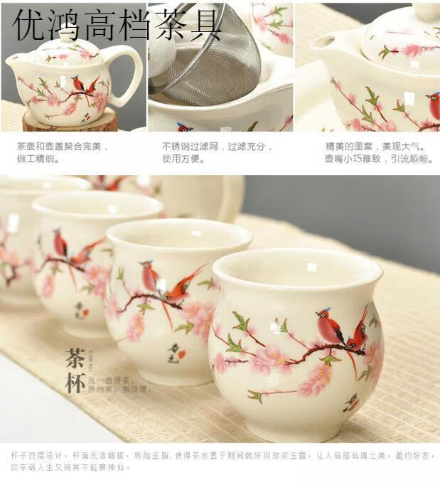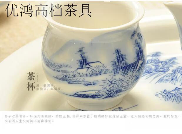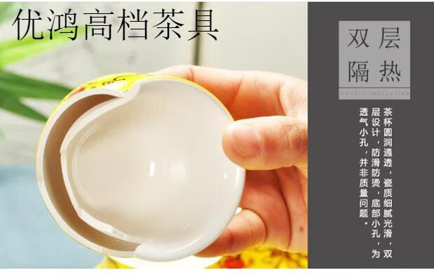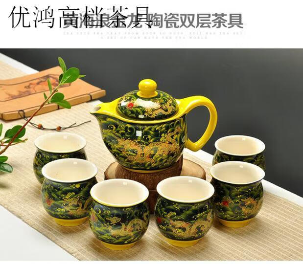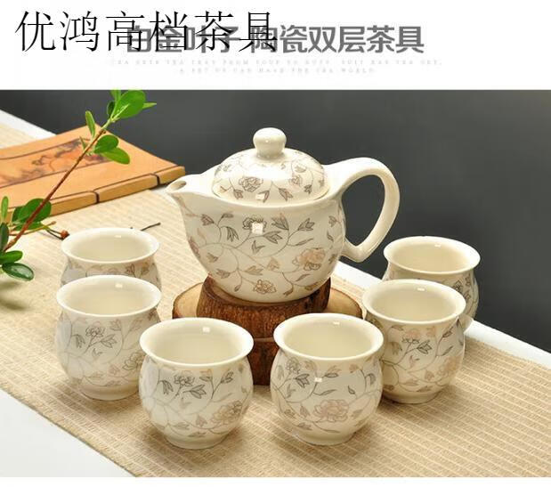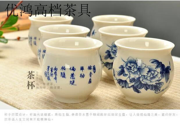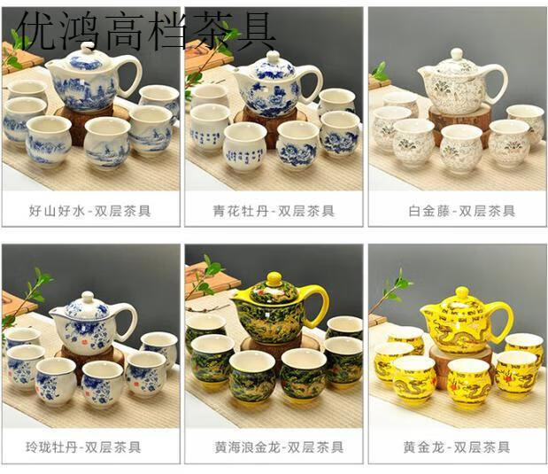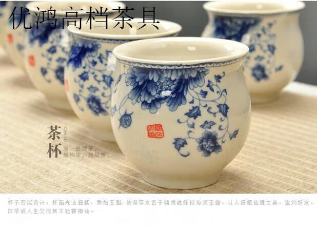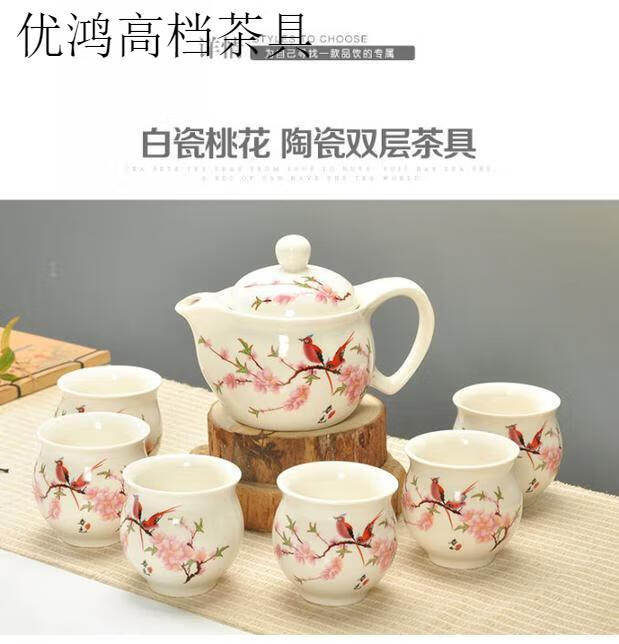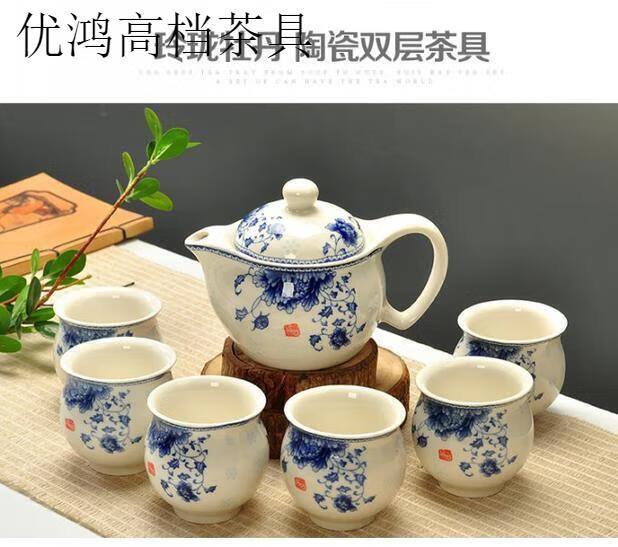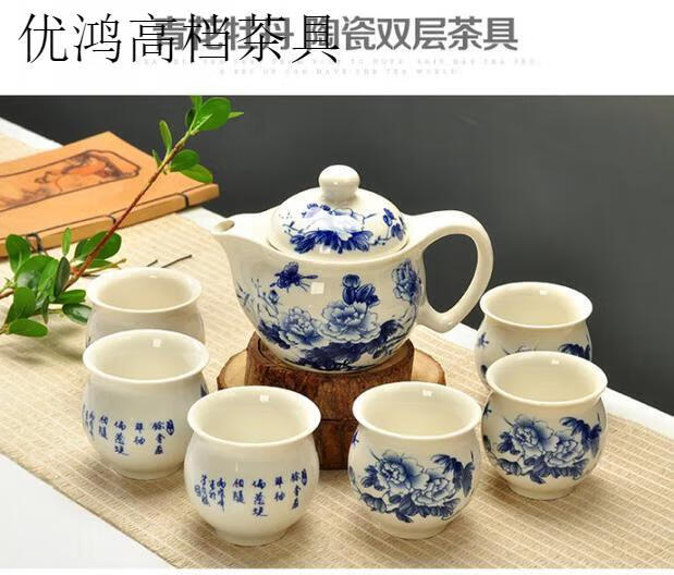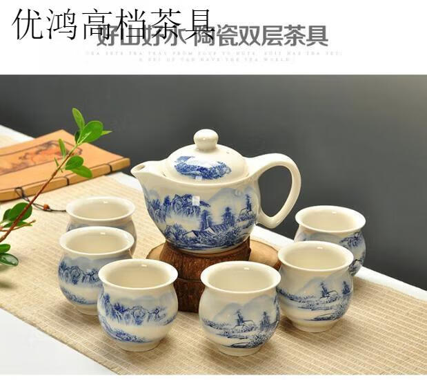 Jingdezhen high-end double-layer tea cup Kung Fu blue and white ceramic teapot with filter Double-layer tea cup Kung Fu tea set Peach Blossom-Double-layer tea set 7 pieces