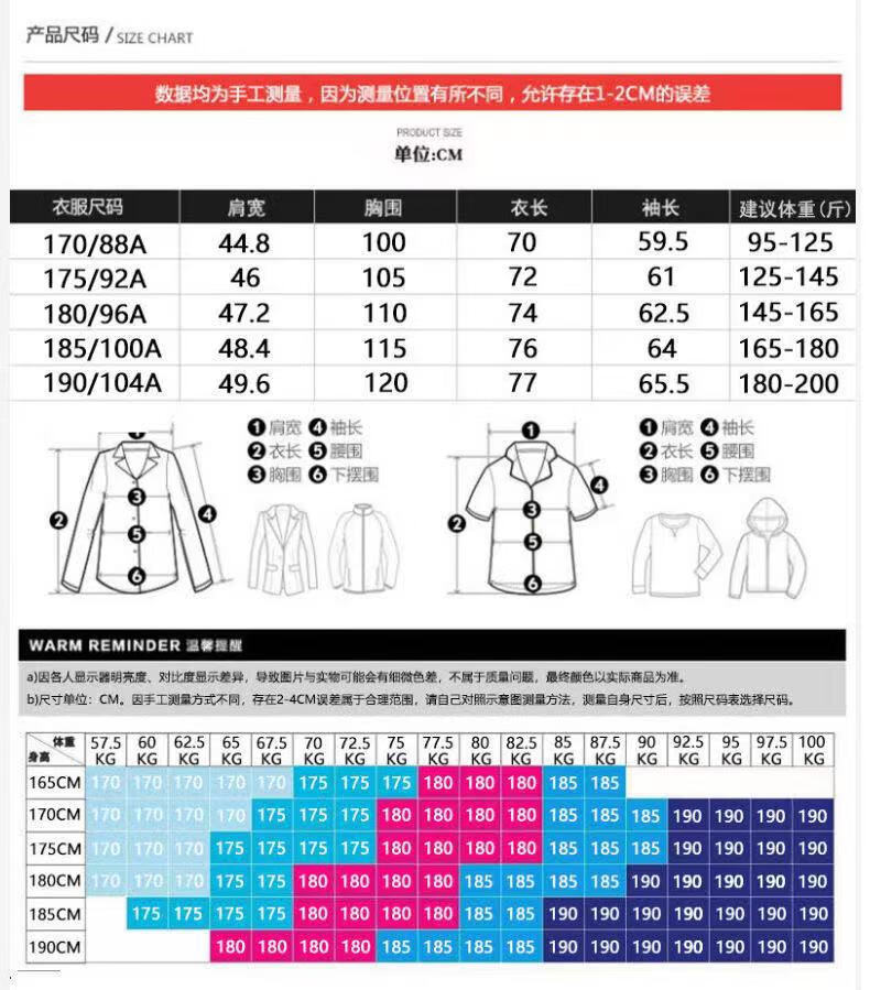 China (cm) 165 / 88-90 170 / 96-98 175 / 108-110 180 / 118-122 185 / 126-130