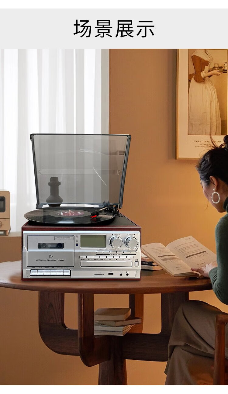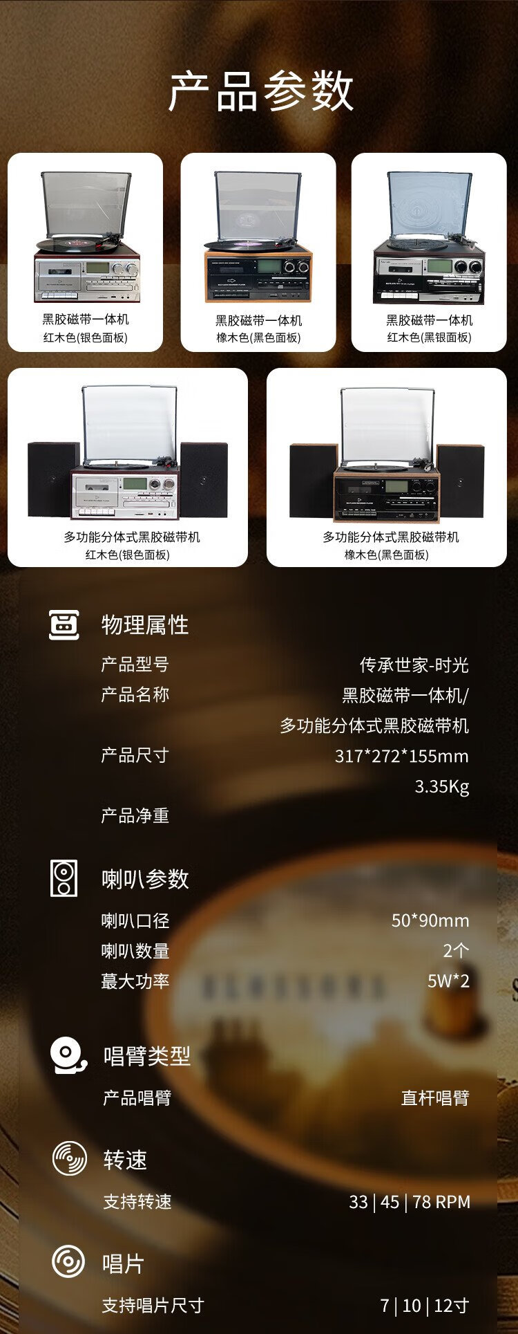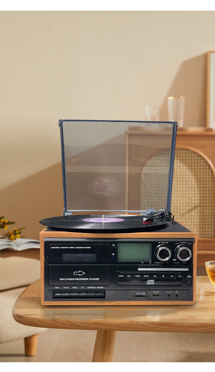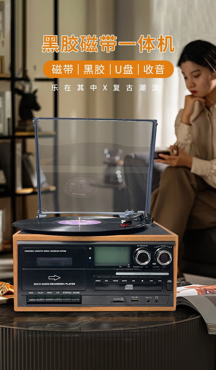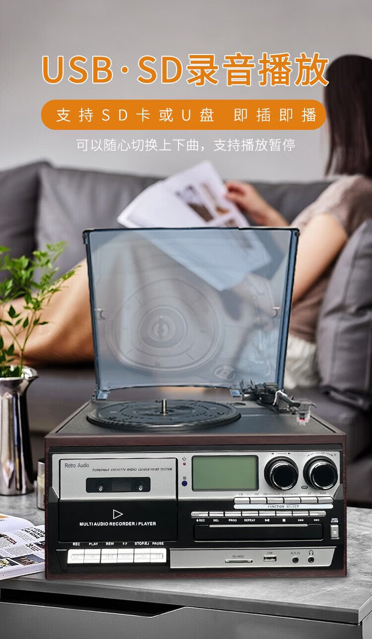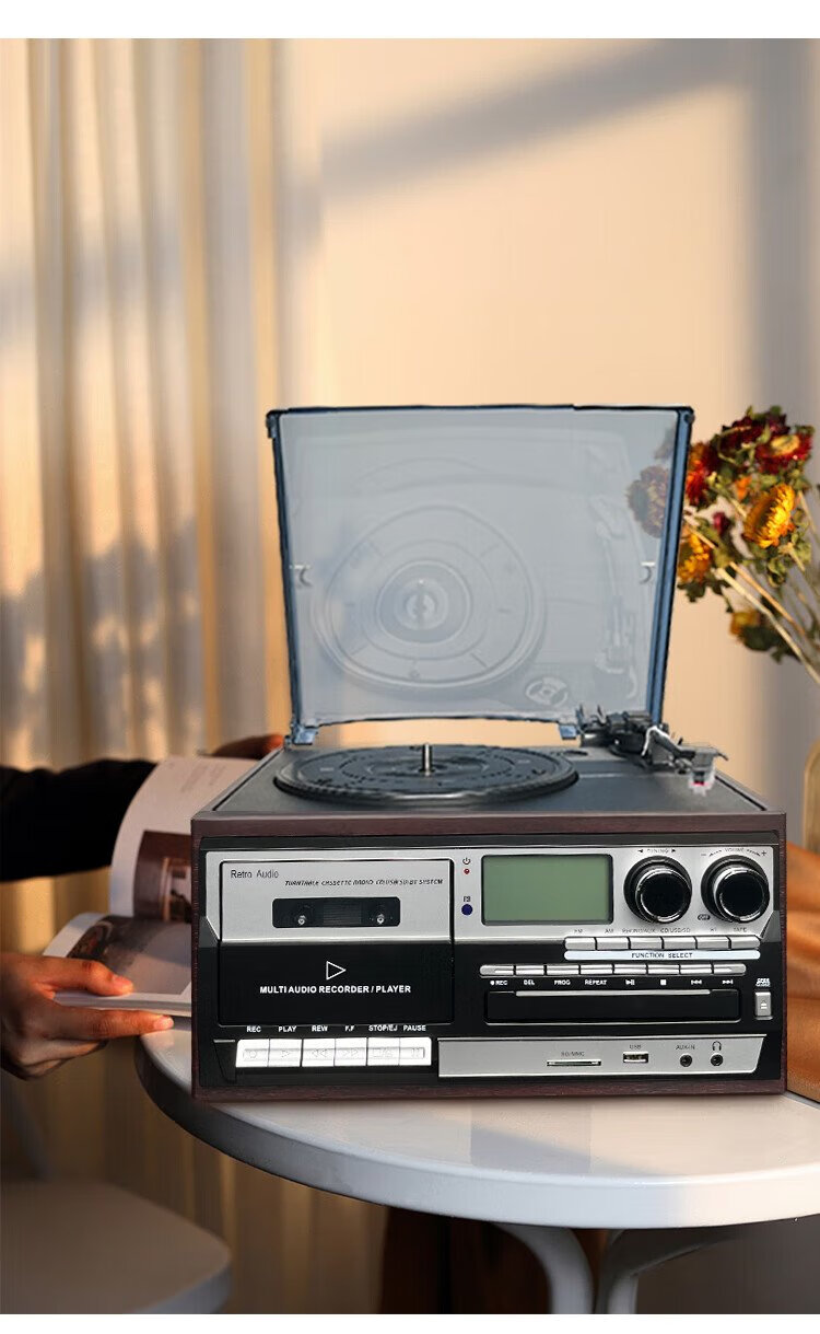 Heritage family tape player, vinyl CD all-in-one multi-functional antique tape player, vinyl record player, retro gramophone, Bluetooth audio, home living room ornaments, vinyl tape all-in-one machine, mahogany color (silver panel)