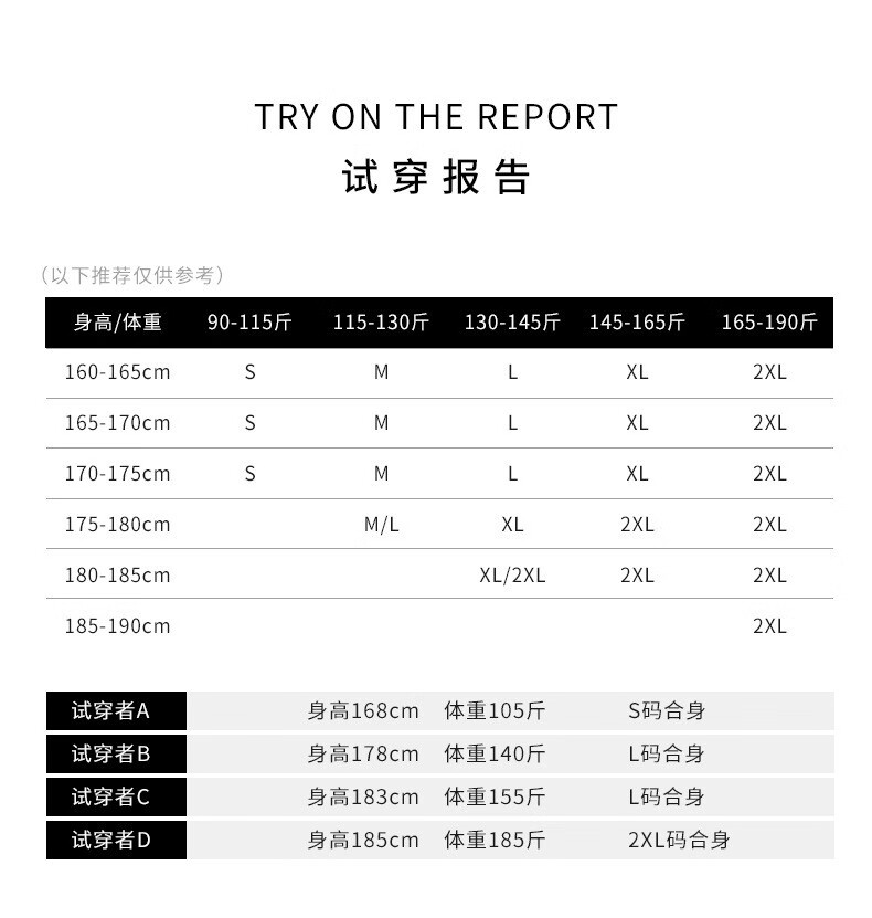 China (cm) 165 / 88-90 170 / 96-98 175 / 108-110 180 / 118-122 185 / 126-130