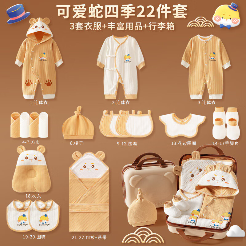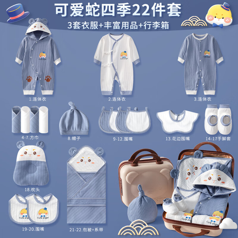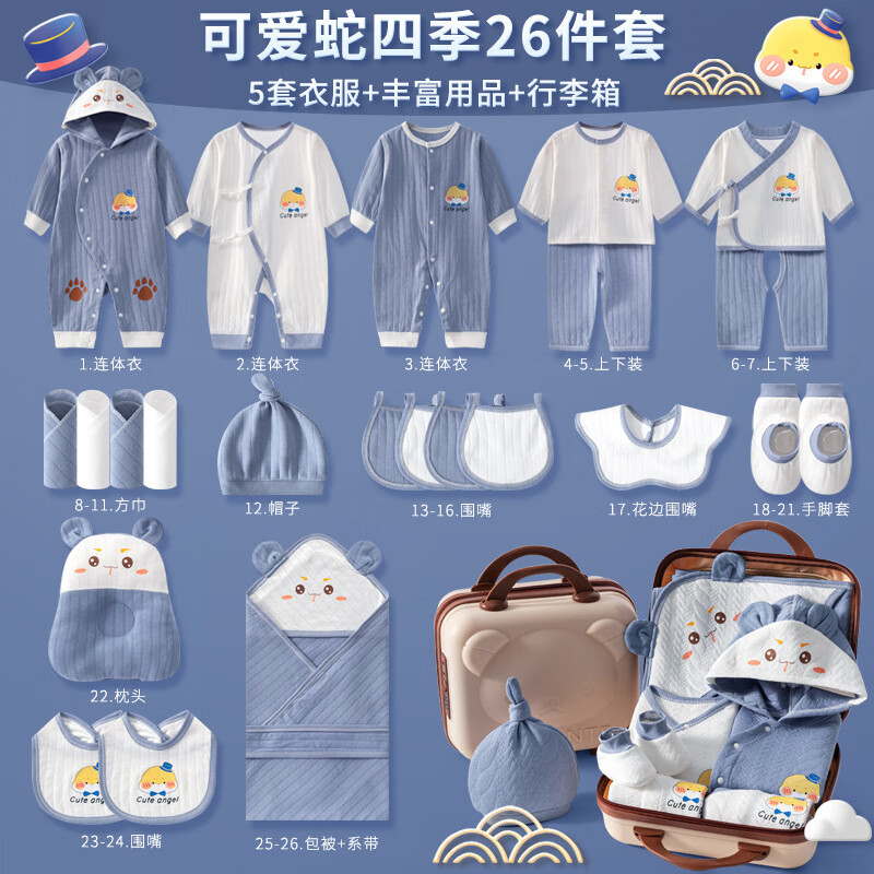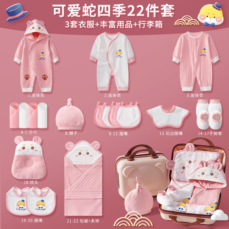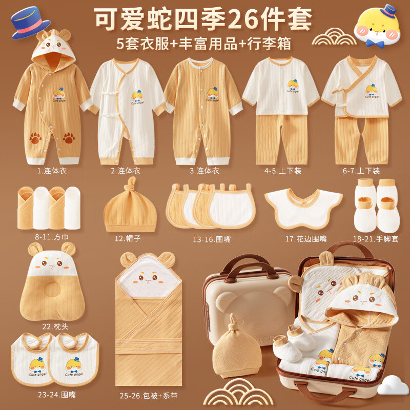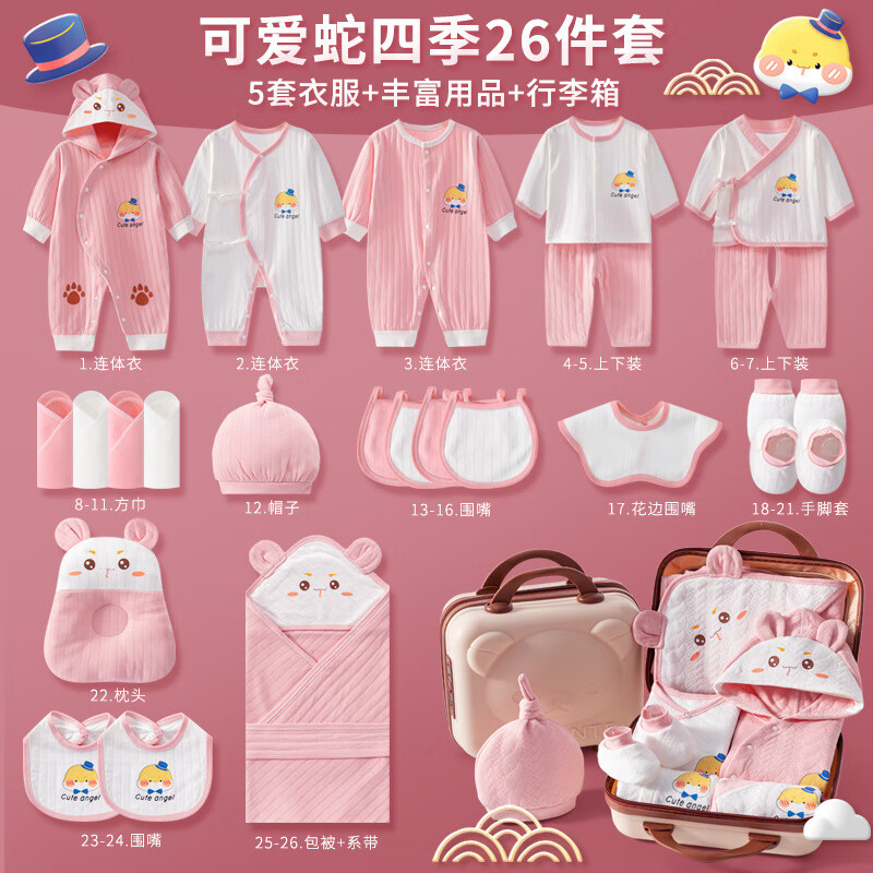 Disney Newborn Clothes, Baby Gifts, Newborn Pure Cotton Complete Set, Newborn Gift Box, Meeting Gift, Maternity Bag, Snake Style 26-piece Set, Four Seasons Powder, Password Box, 59cm (about 0-3 months)