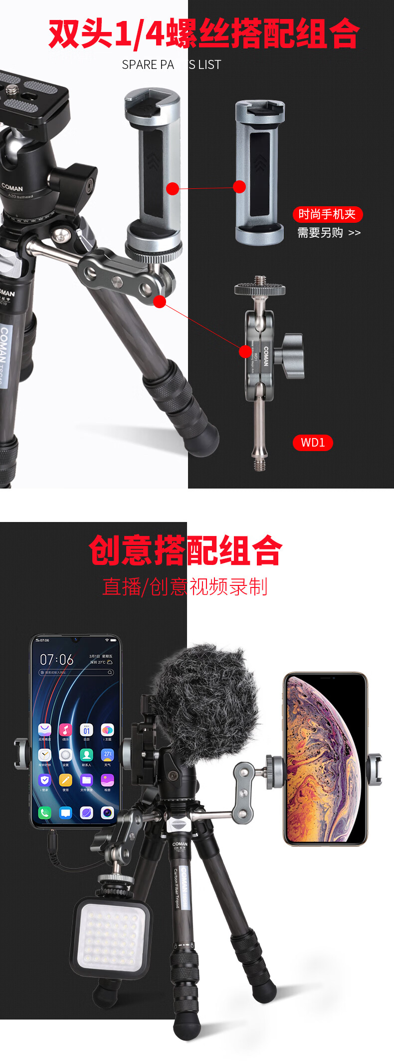 COMAN Magic Hand Universal Stand Universal 1/4 Interface 3/8 Interface Connection Tripod Mobile Phone Stand Photography Lightweight Portable Expansion Arm WD1 WD2 Magic Hand