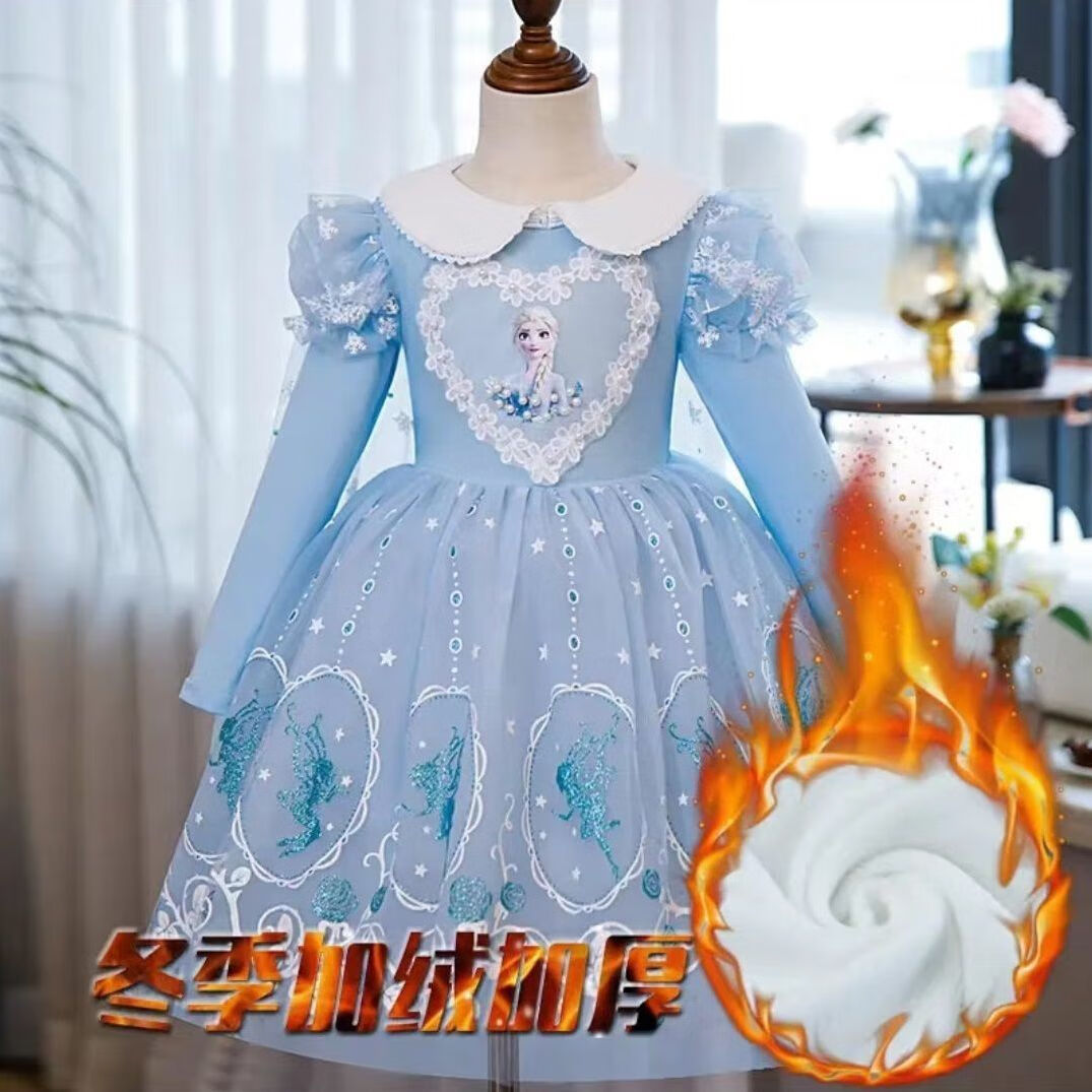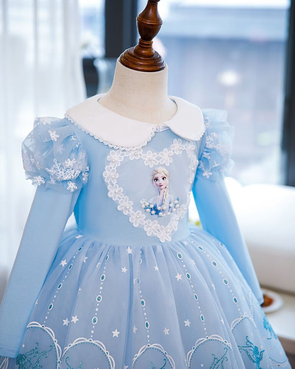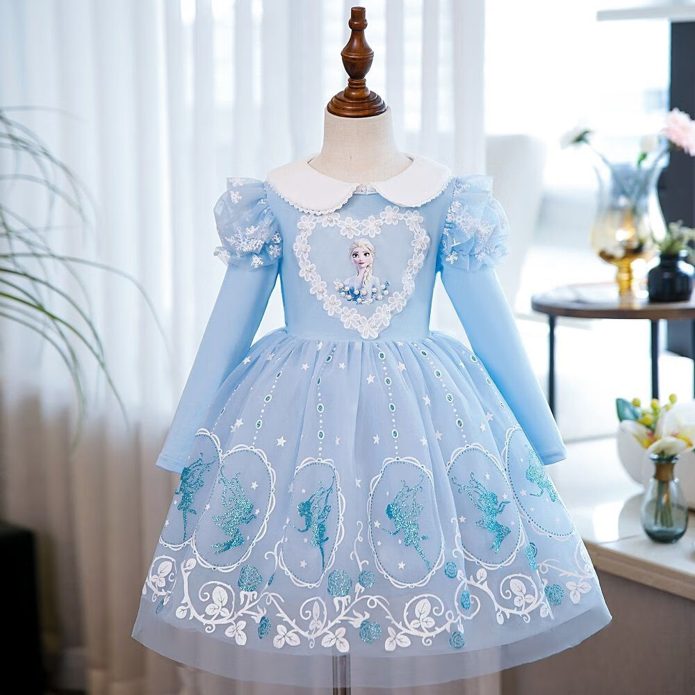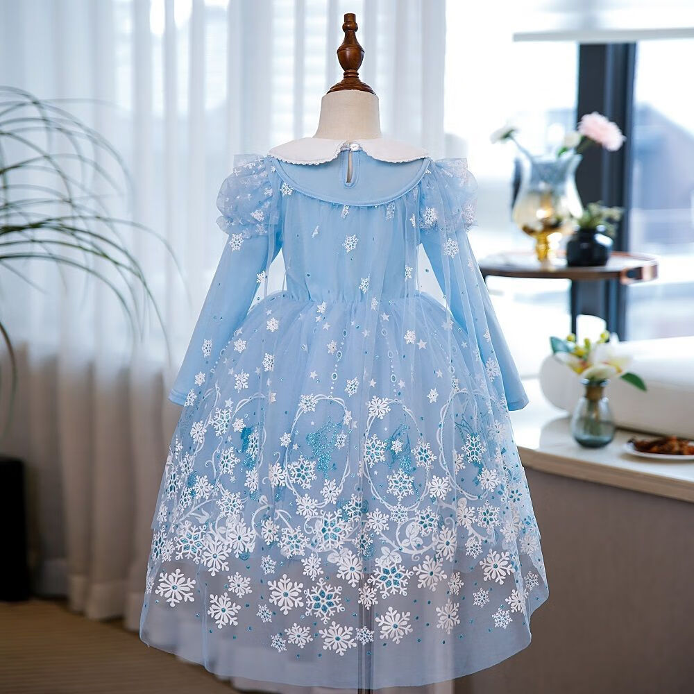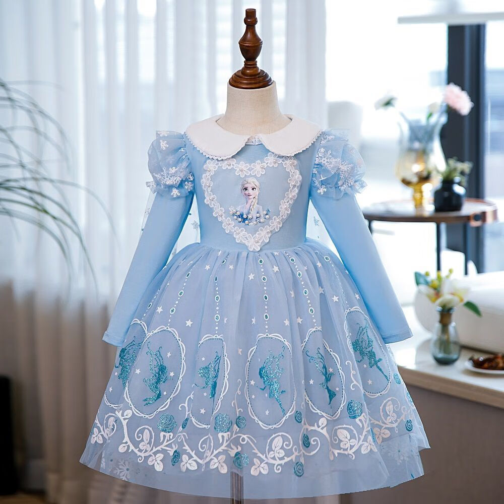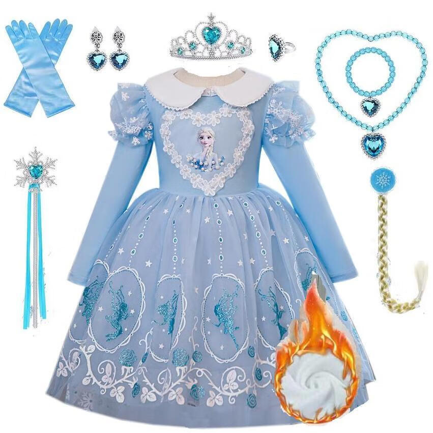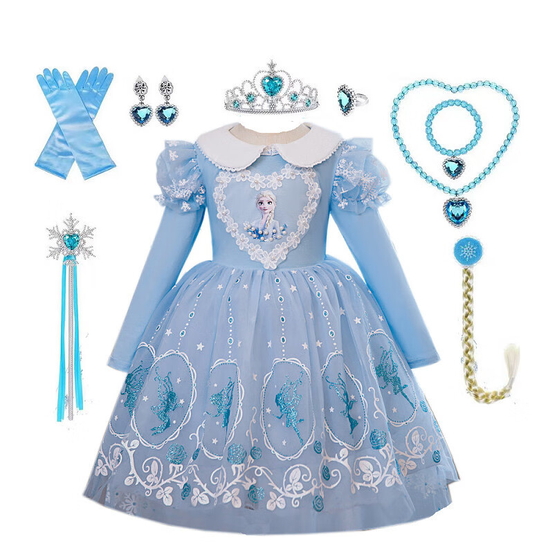 G.duck Elsa Princess Dress Girls Spring and Autumn Frozen Puff Dress Autumn and Winter Children's Elsa Dress Dress Skirt Long Sleeve Blue (with Veil) + Eight-piece Set 120 Suitable for heights around 110cm