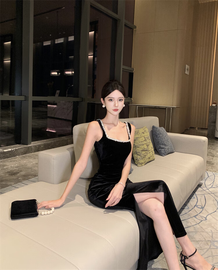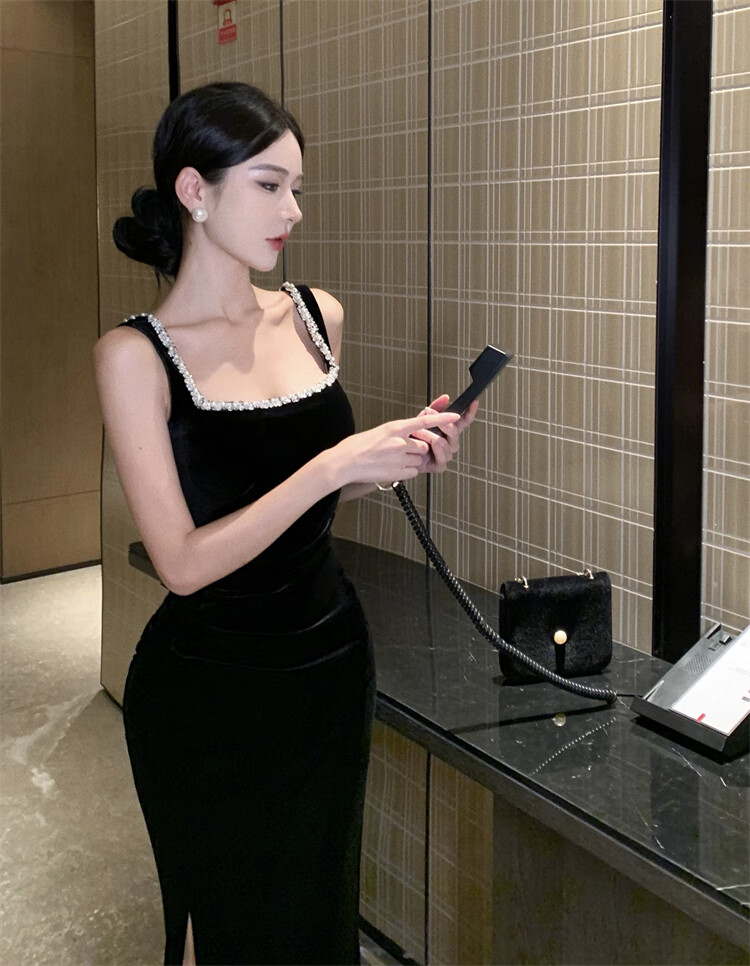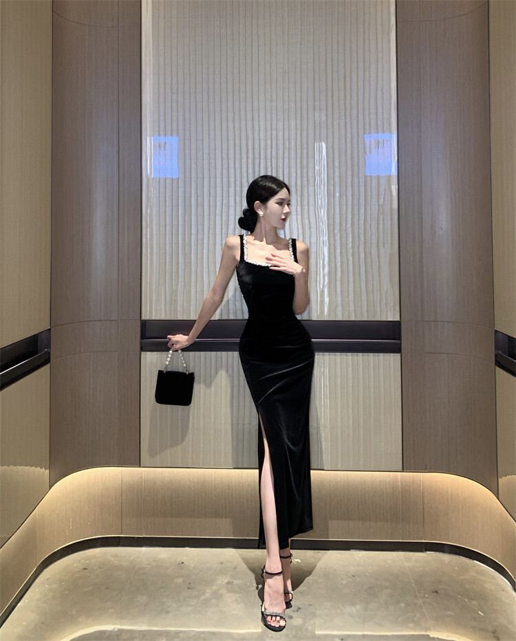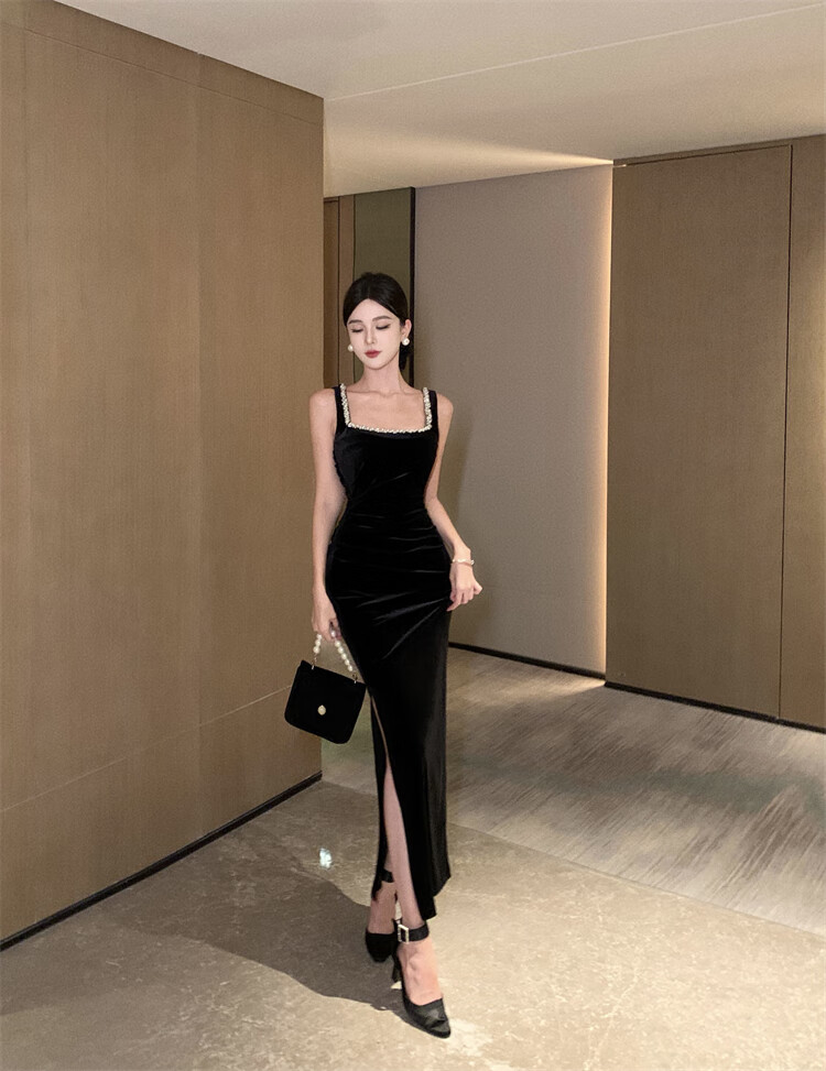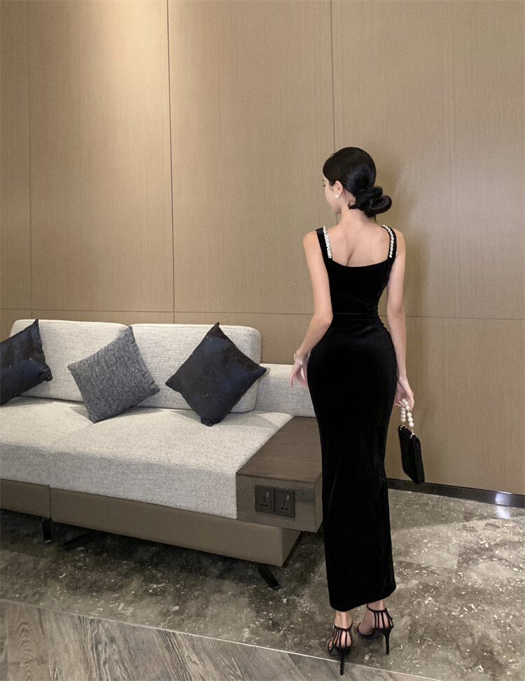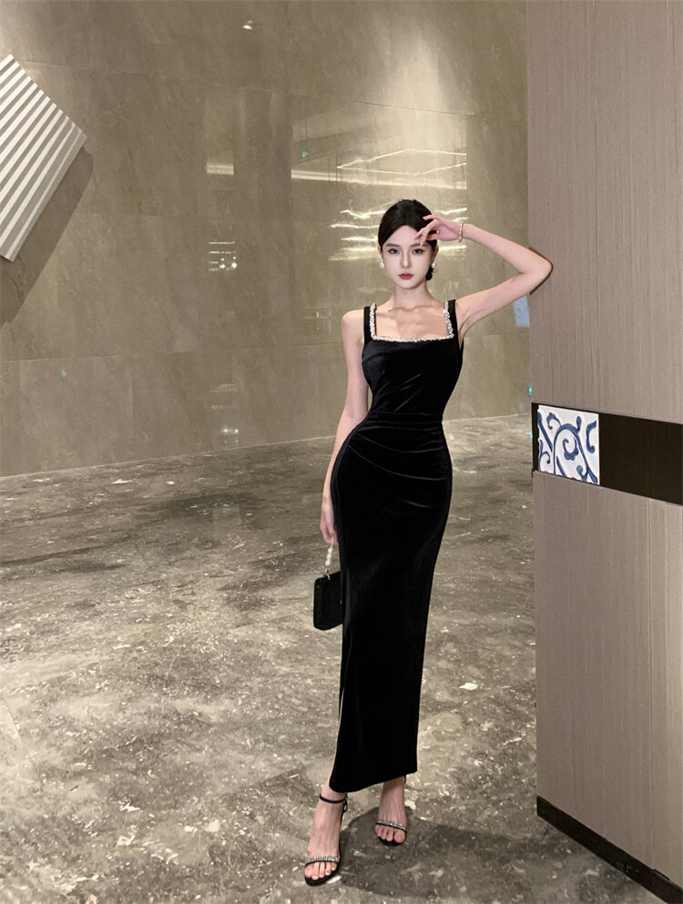 YIOU Sexy Temperament Suspender Dress Celebrity Annual Party Slim Fit Hip-covering Evening Dress Velvet Black Long Skirt 8585 Black M