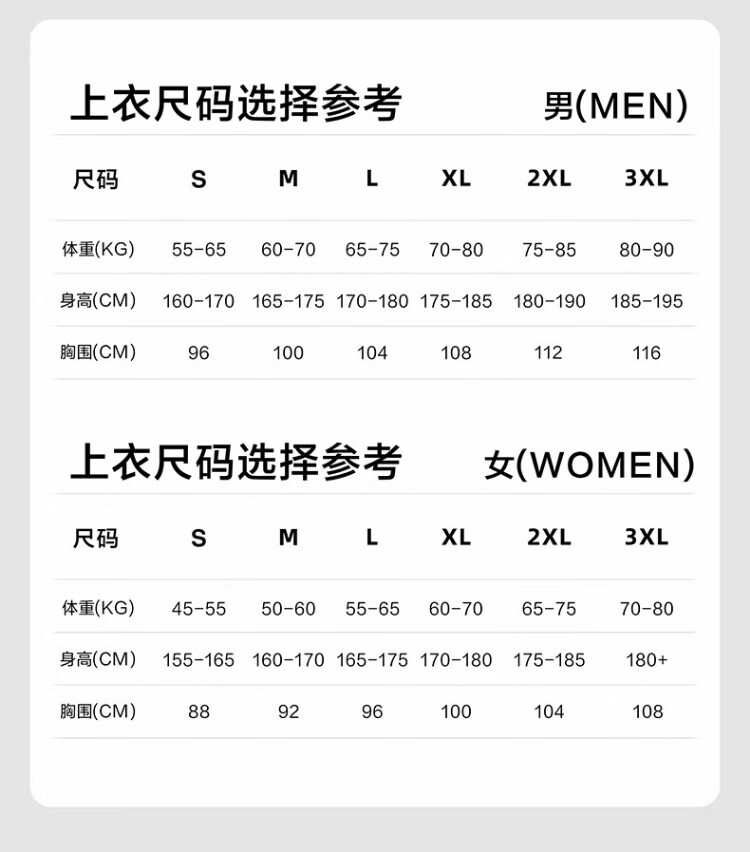 China (cm) 160-165/84-86 165-170 / 88-90 167-172 / 92-96 168-173 / 98-102 170-176 / 106-110