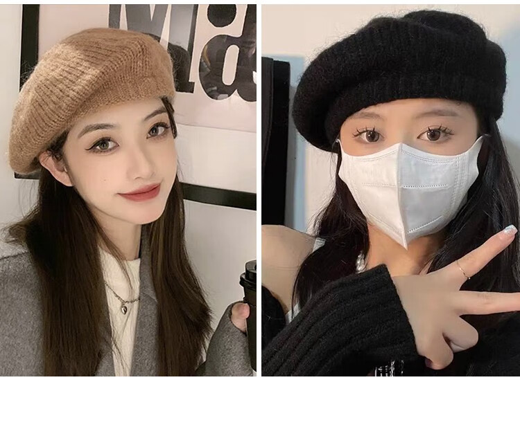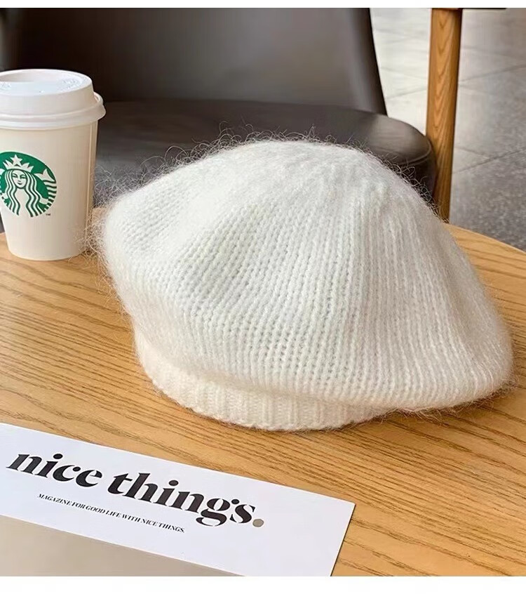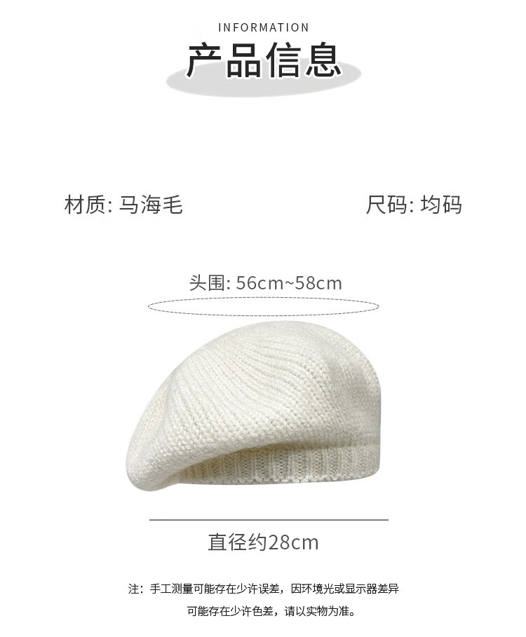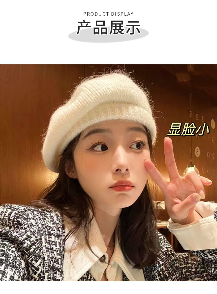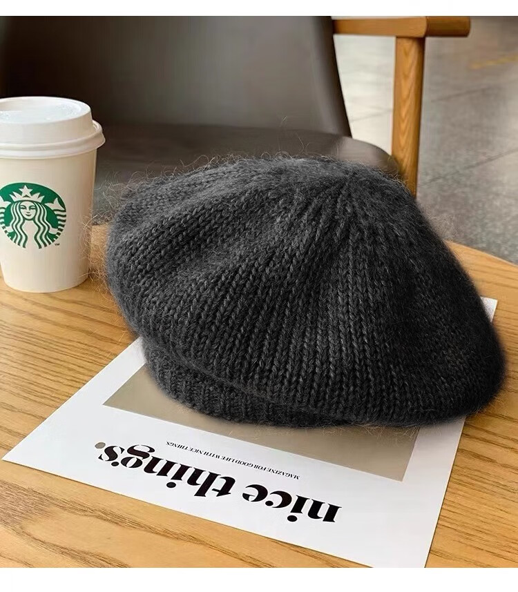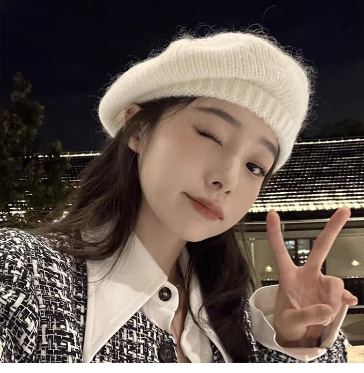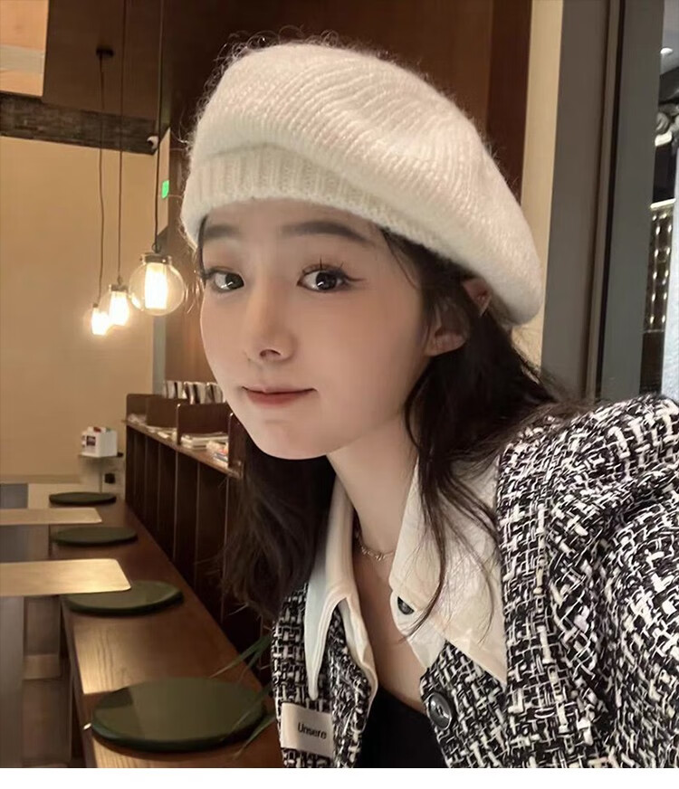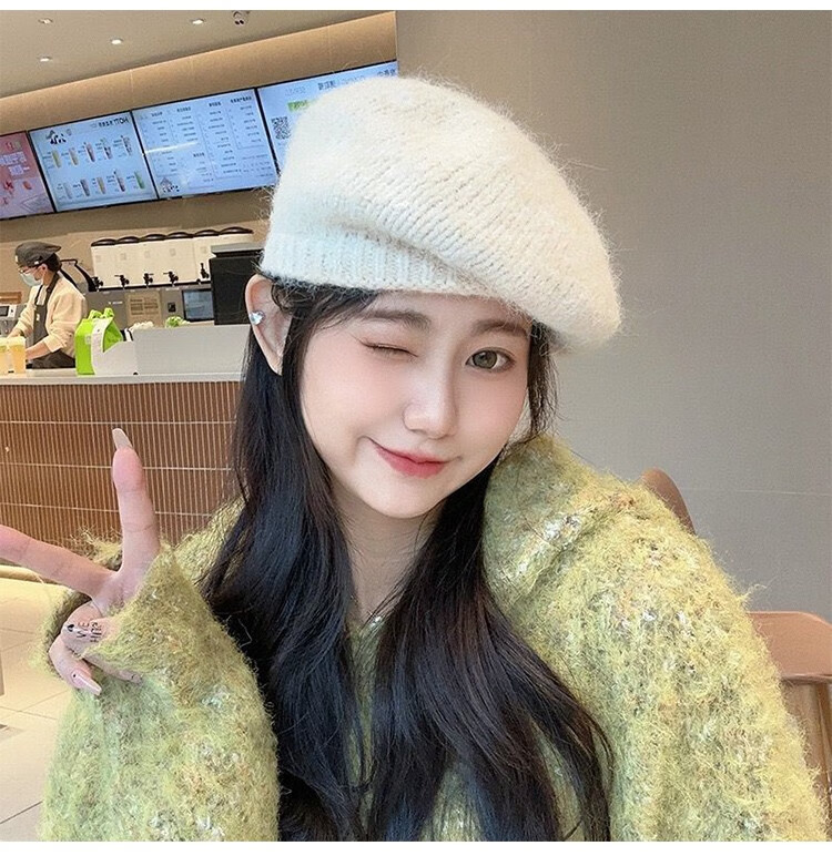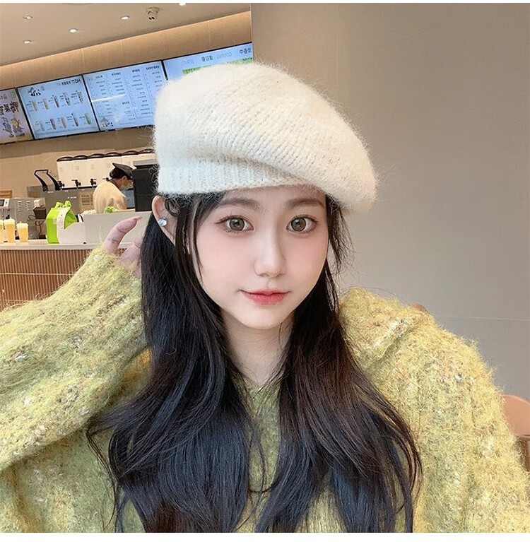啕二啕 white beret women's plush hat winter women's fashion new warm mohair knitted woolen hat painter hat black