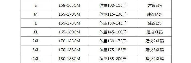 China (cm) 165 / 88-90 170 / 96-98 175 / 108-110 180 / 118-122 185 / 126-130