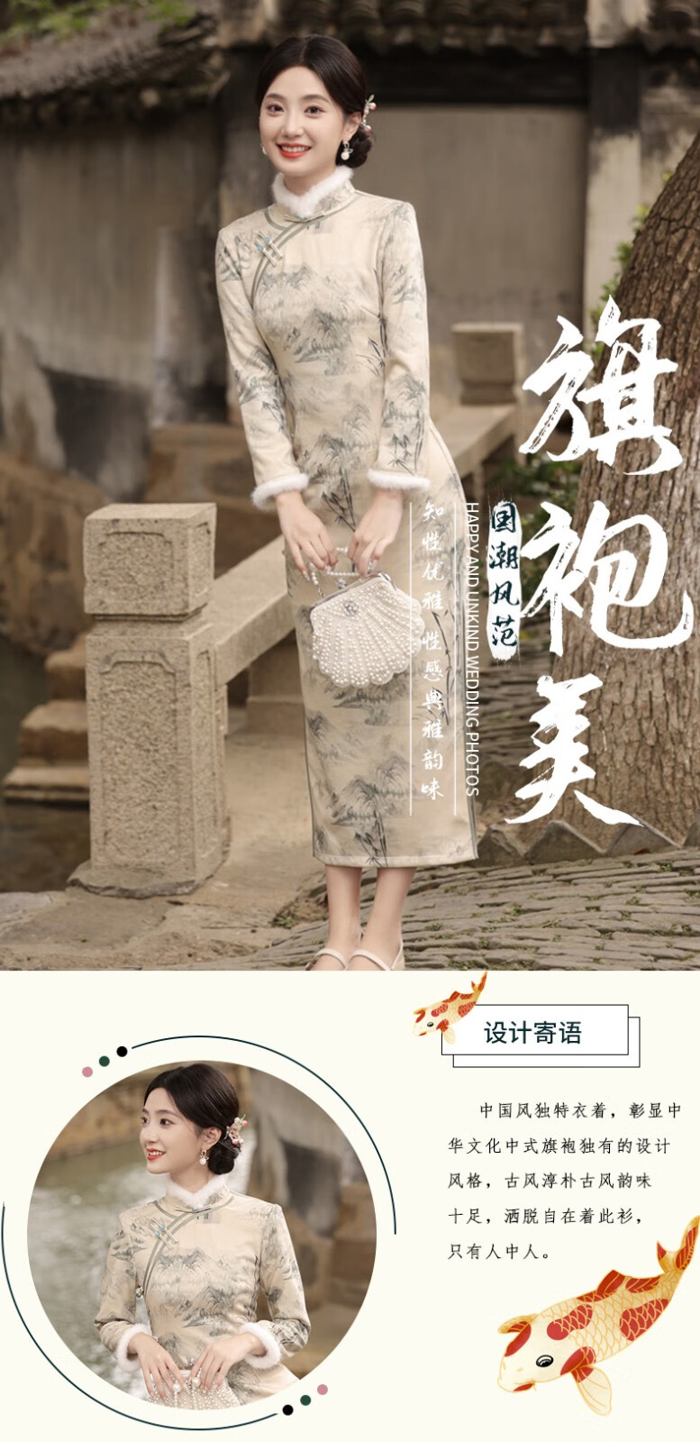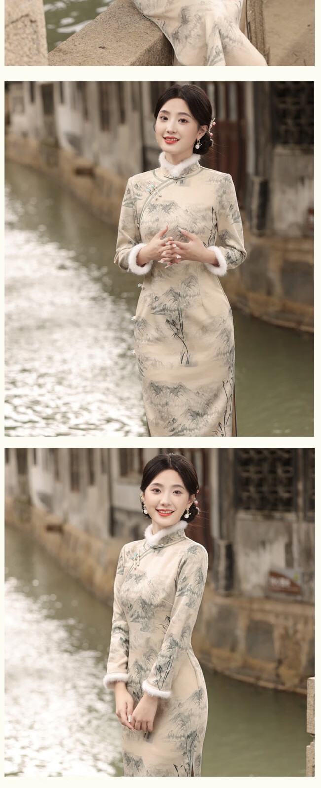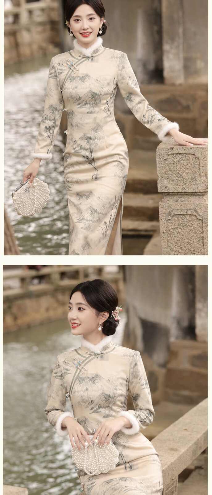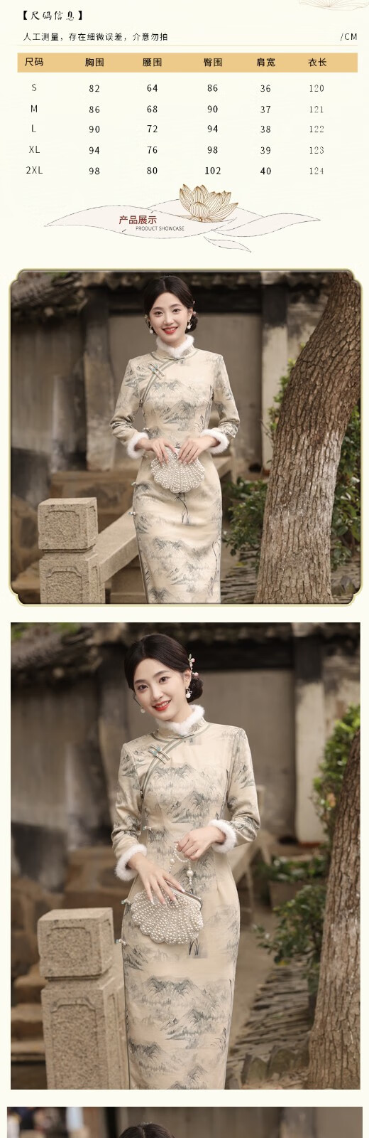 Du Yanzhi's new winter style, thickened and furred, long eight-button side cheongsam, landscape painting Chinese style stand-collar long cheongsam, beige color (velvet style, softer) plus velvet M (160) 95-105Jin Jin is equal to 0.5 kg