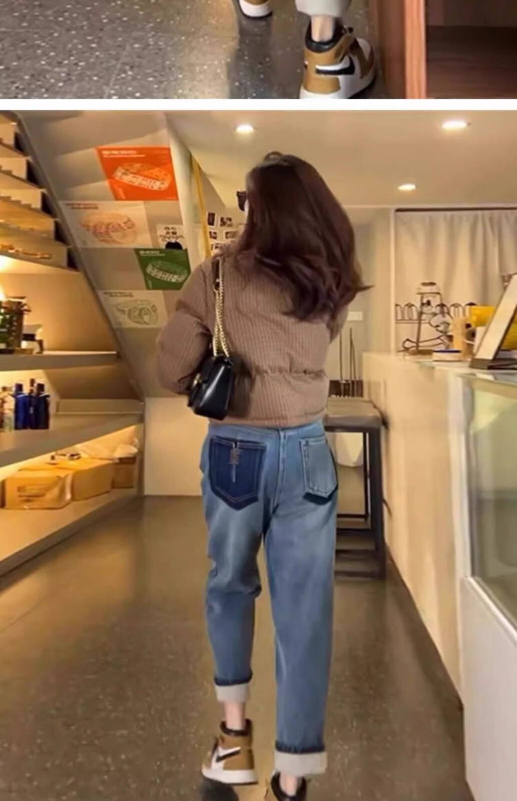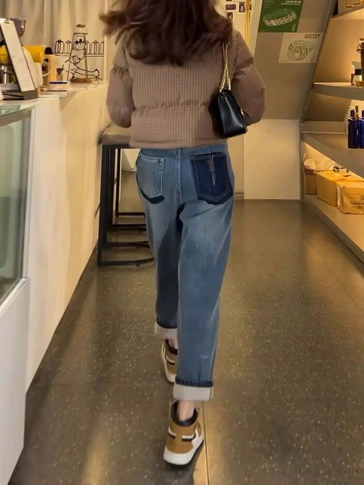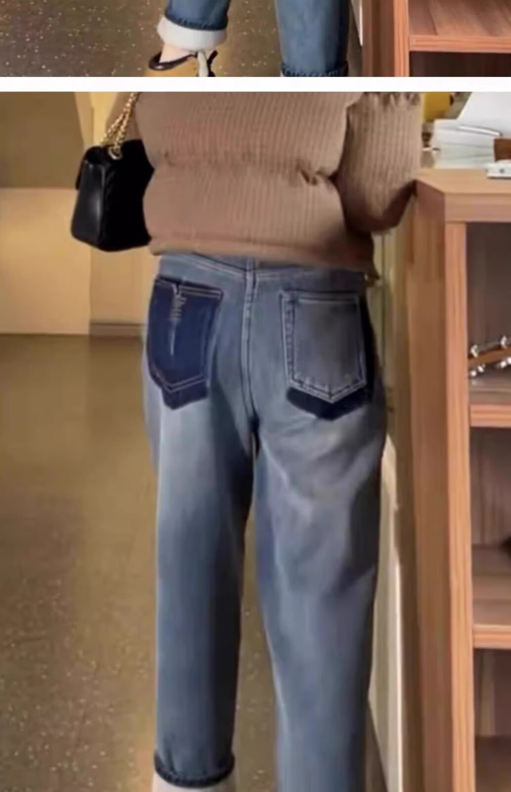 Cotton plus velvet thickened retro straight jeans for women in autumn and winter new high-waisted loose slim harem casual pants retro blue 8668 plus velvet high quality 38 L 105-120Jin Jin is equal to 0.5 kg