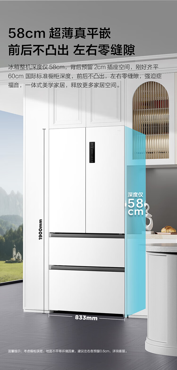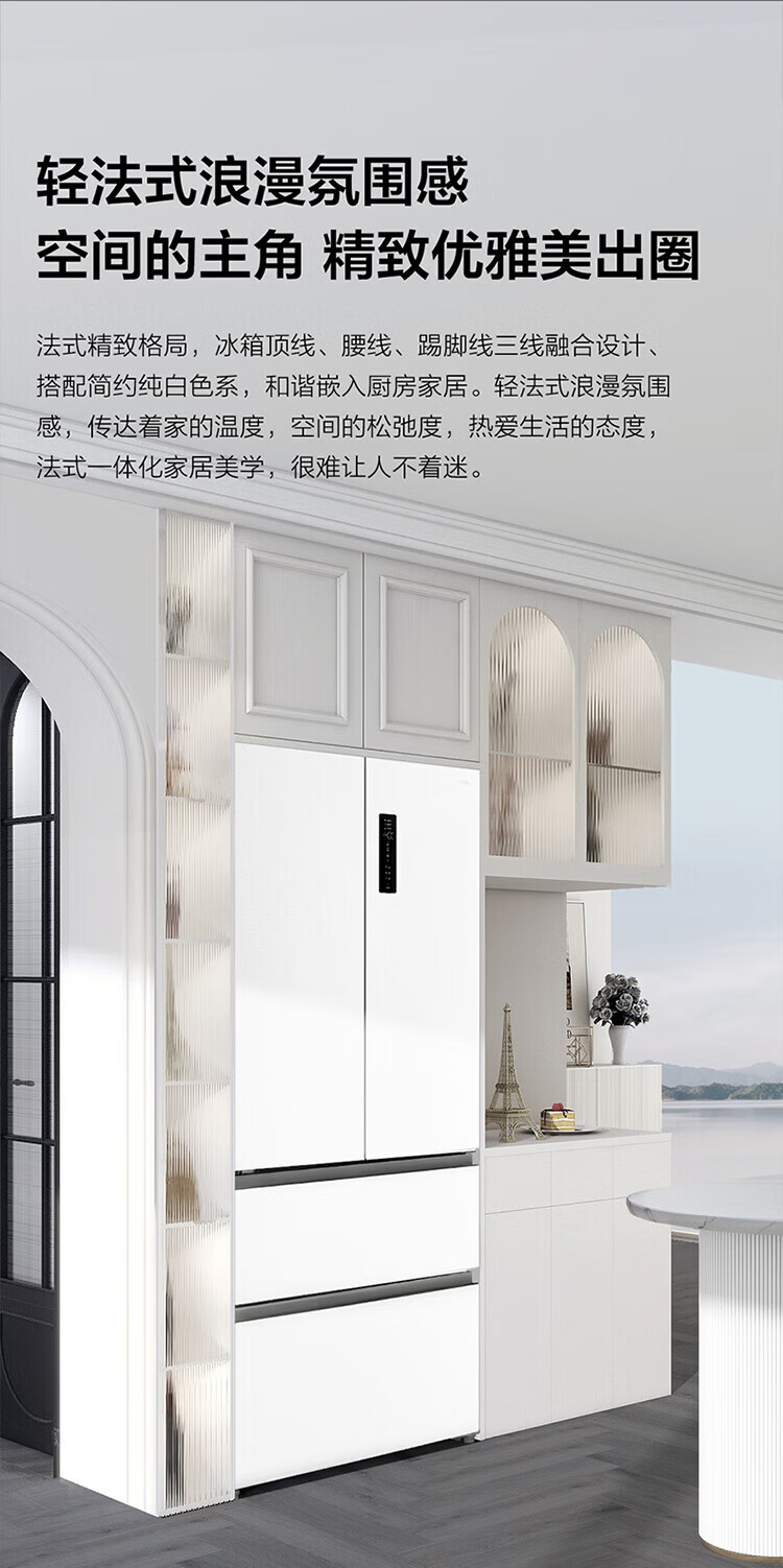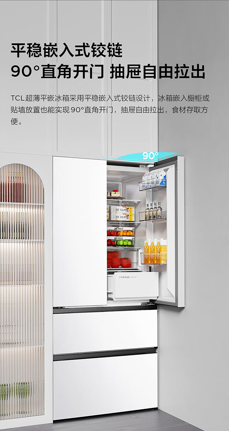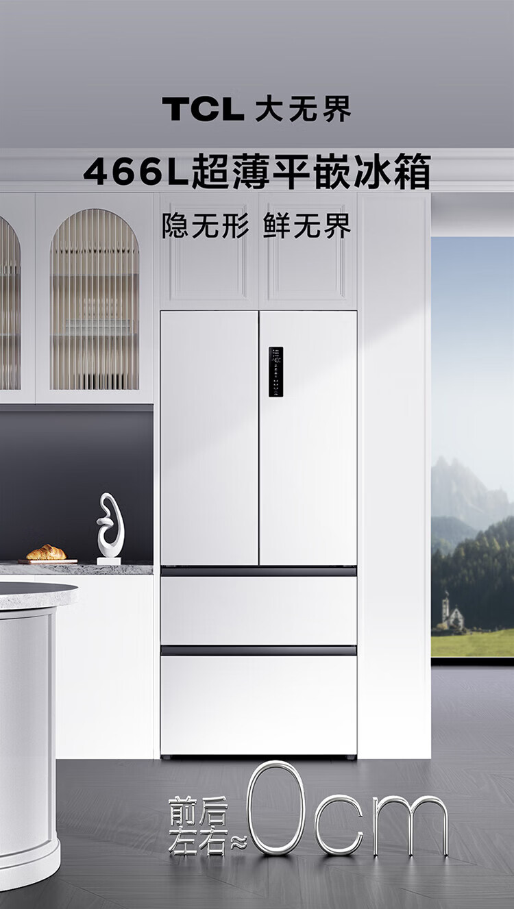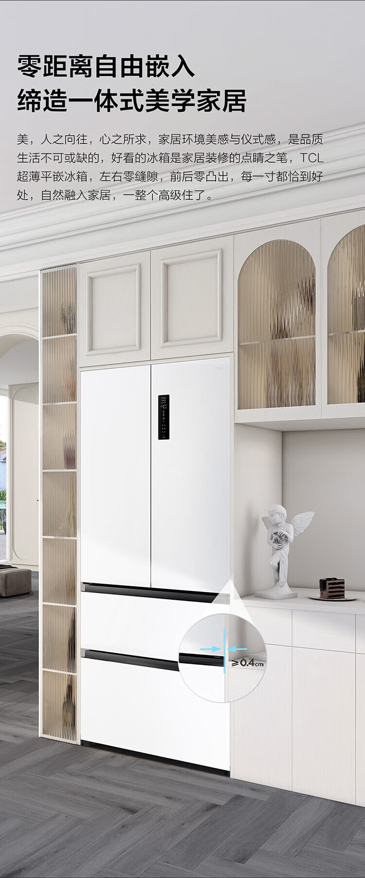 TCL Big Unbounded 466-liter T9 French multi-door four-door 58cm ultra-thin zero-embedded bottom cooling dual-purity refrigerator first-class energy efficiency large-capacity air-cooled household refrigerator R466T9-DQ Rhythm White