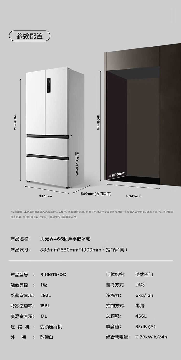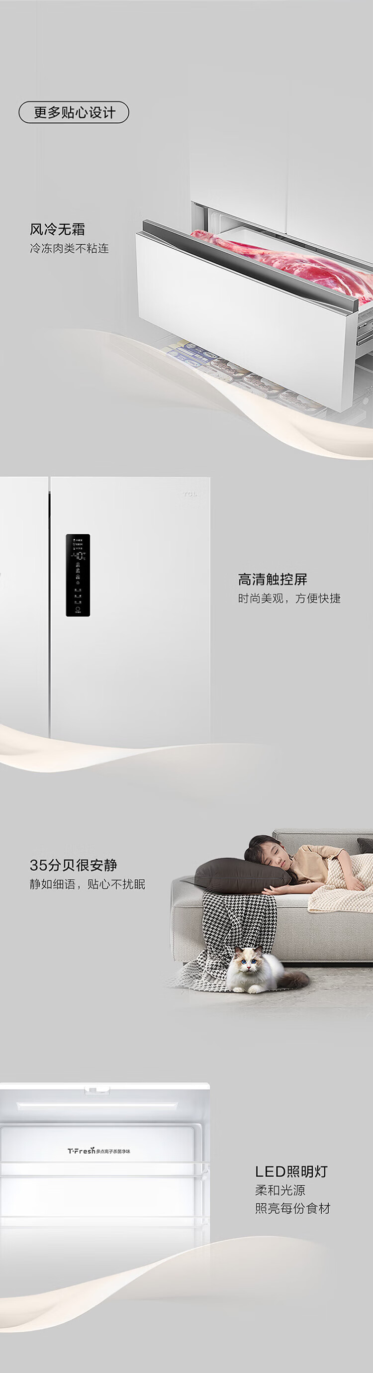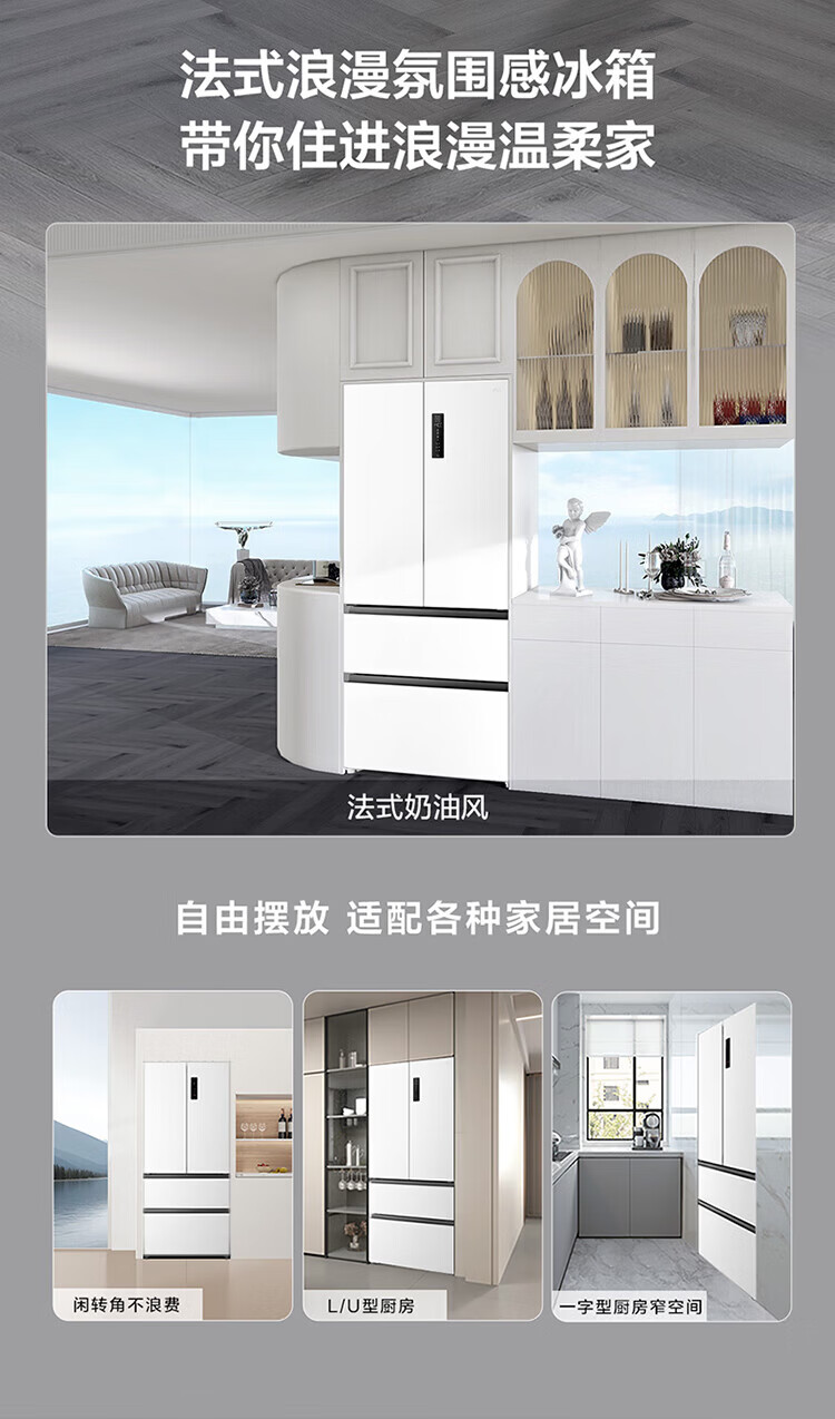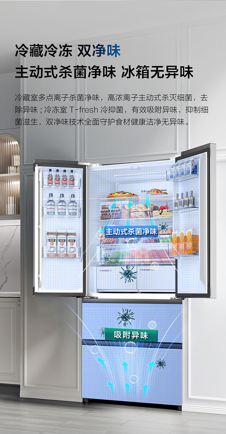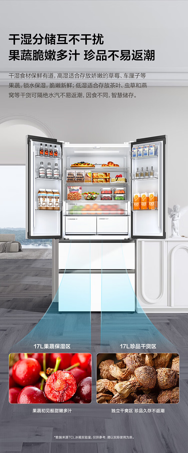 TCL Big Unbounded 466-liter T9 French multi-door four-door 58cm ultra-thin zero-embedded bottom cooling dual-purity refrigerator first-class energy efficiency large-capacity air-cooled household refrigerator R466T9-DQ Rhythm White