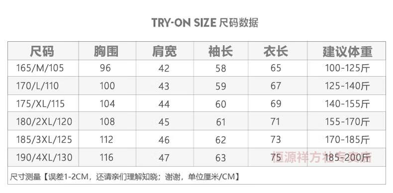 China (cm) 165 / 88-90 170 / 96-98 175 / 108-110 180 / 118-122 185 / 126-130