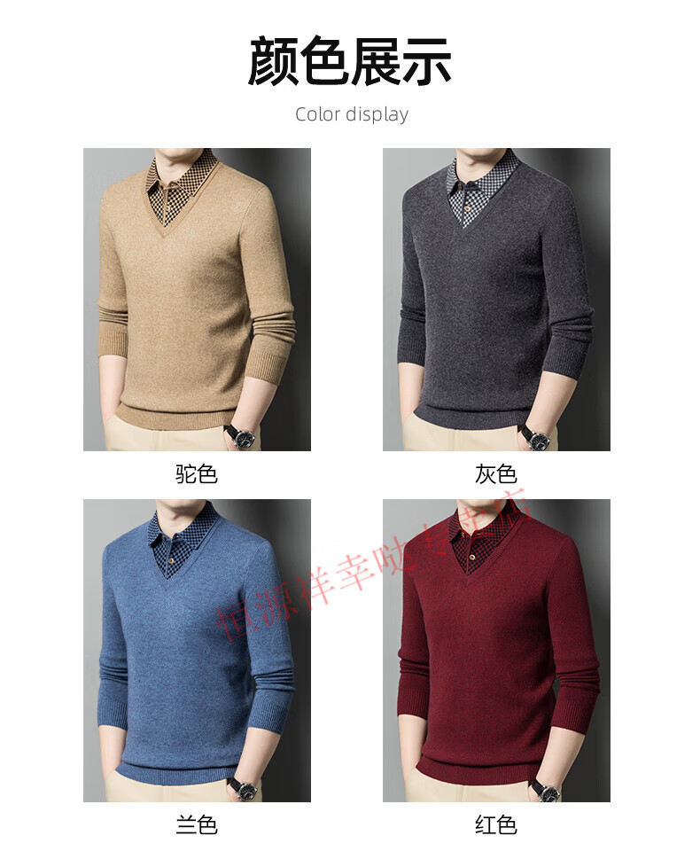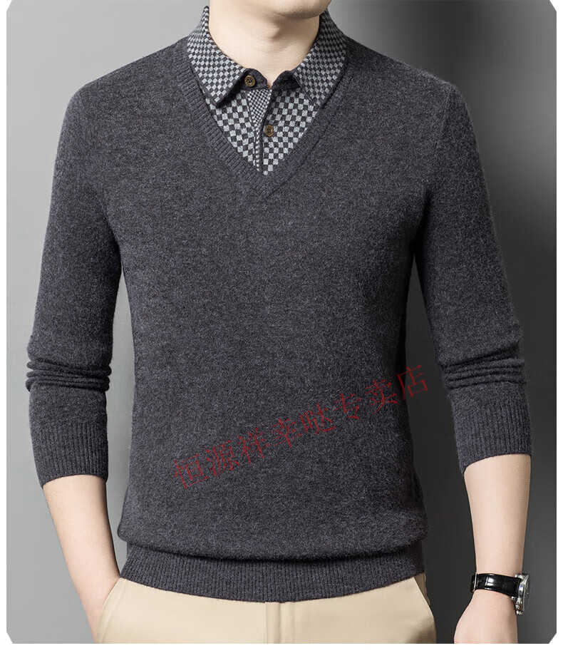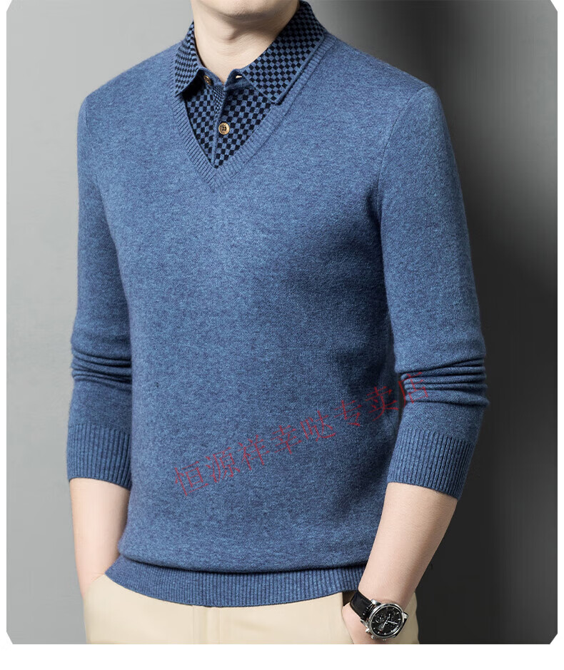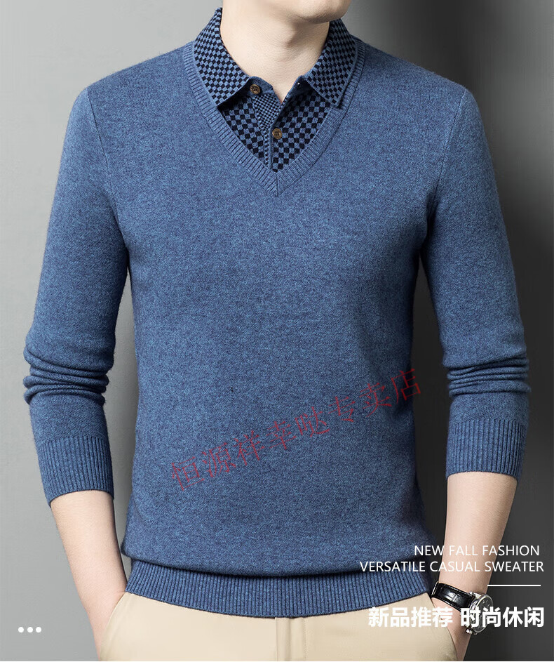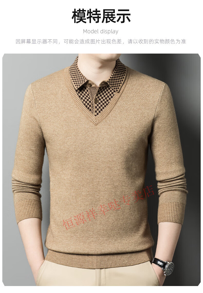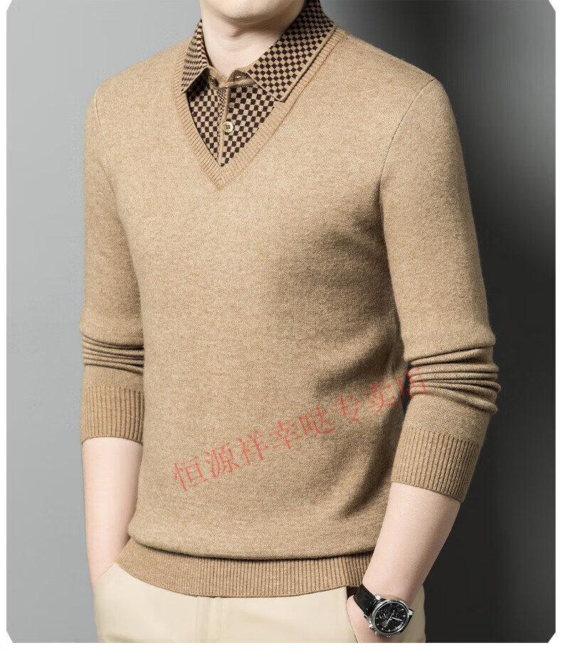 Hengyuanxiang wool sweater for men in autumn and winter long-sleeved solid color fake two-piece thickened warm sweater base sweater camel color pure new 100 selected fine wool