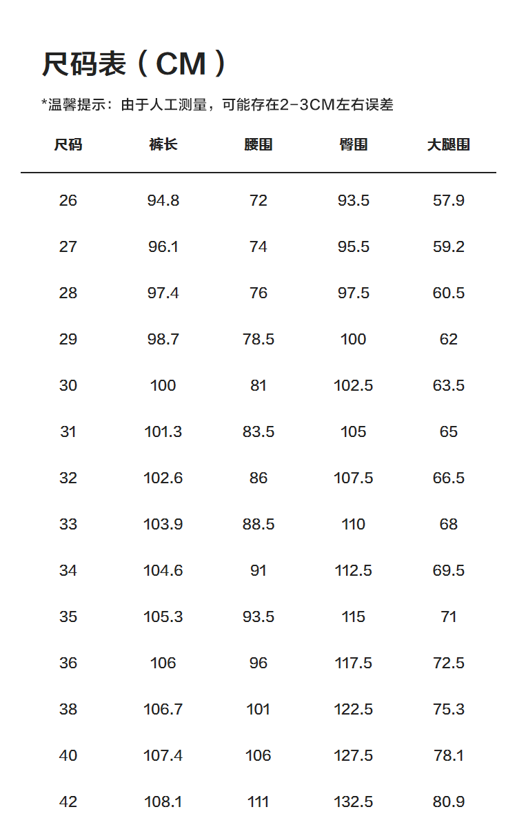 Outseam (cm) 99 cm 101.5 cm 104 cm 106.5 cm 109 cm