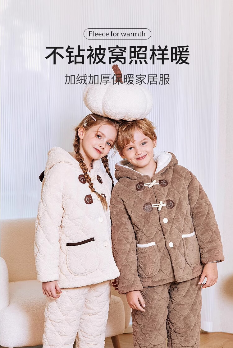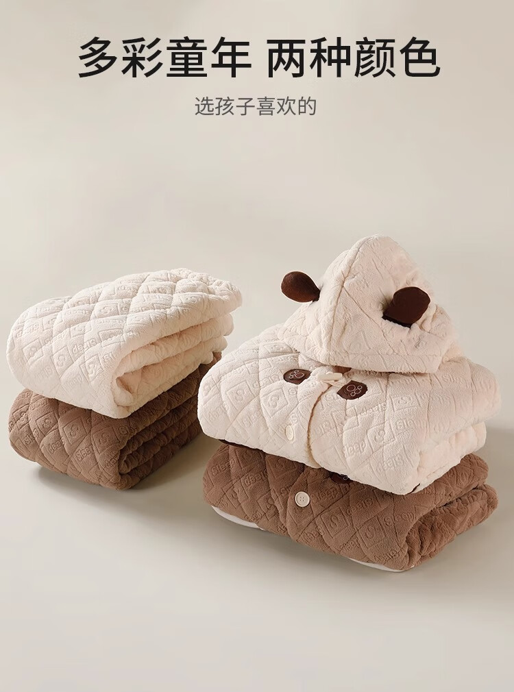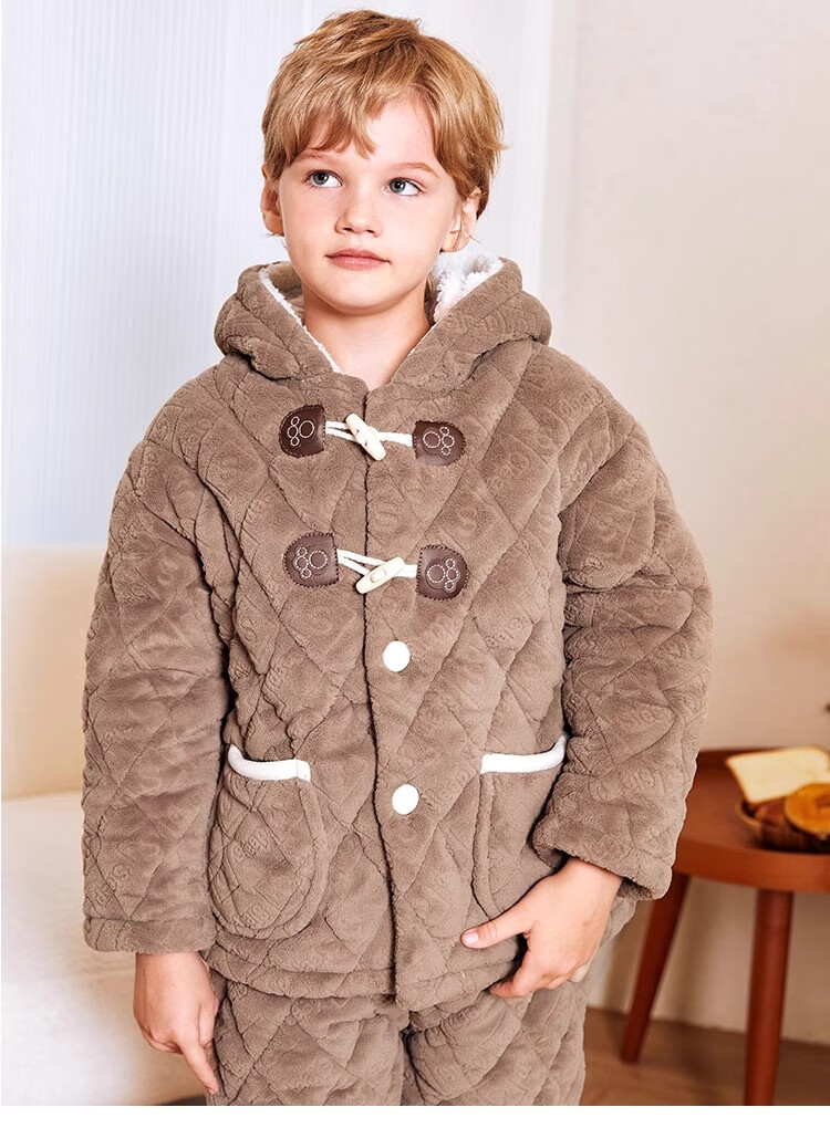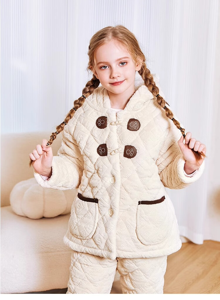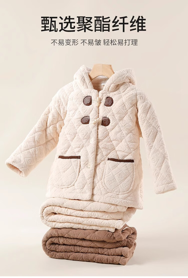 Ying's children's velvet thickened home clothes suit winter style boys and girls autumn and winter hooded outer pajamas beige 140