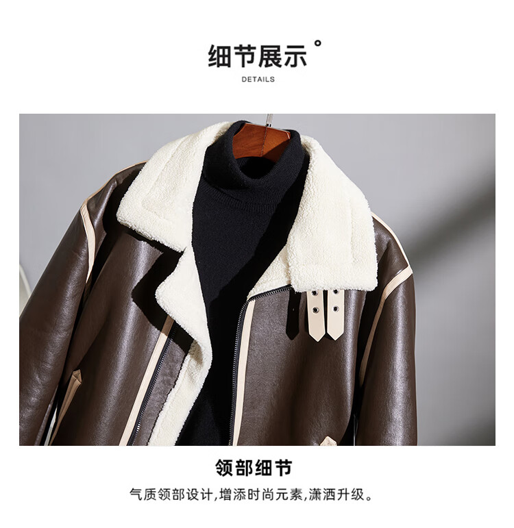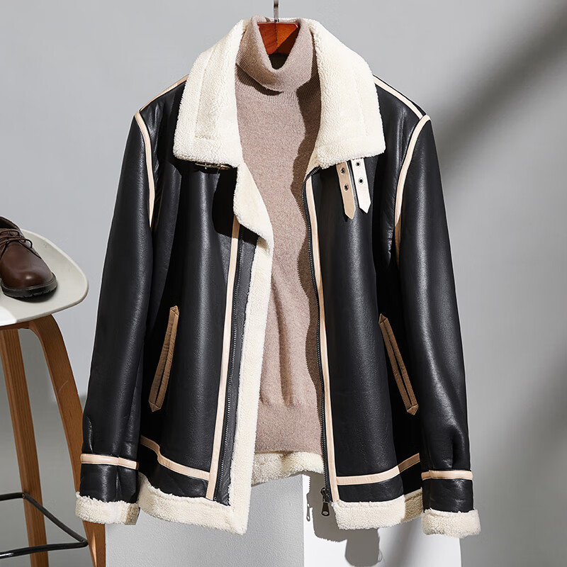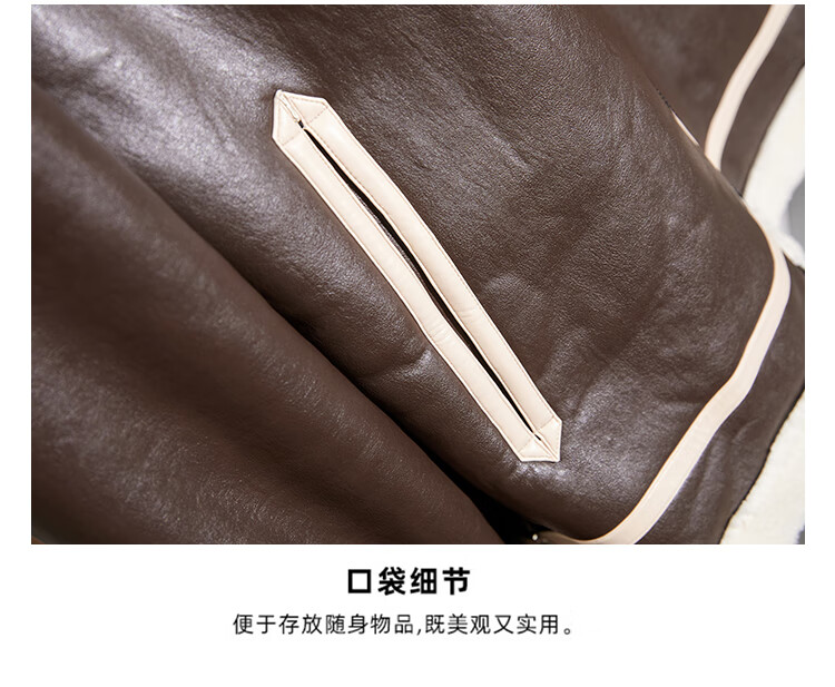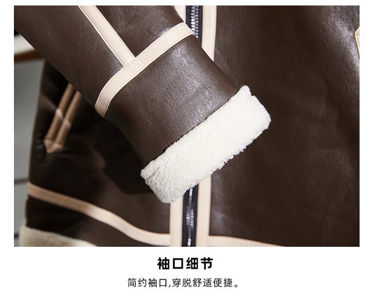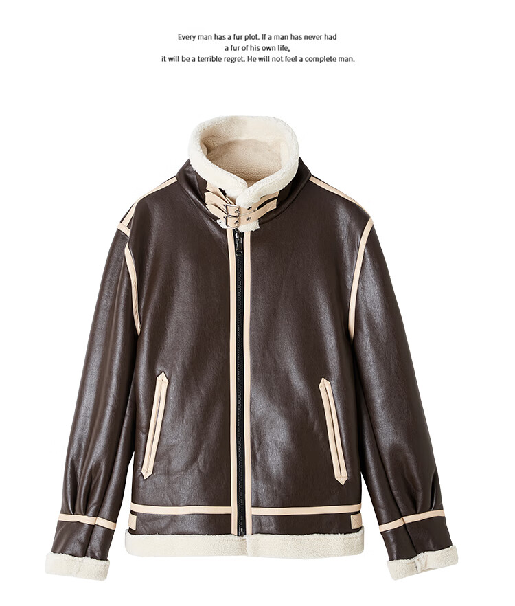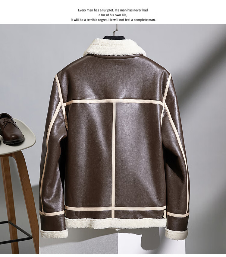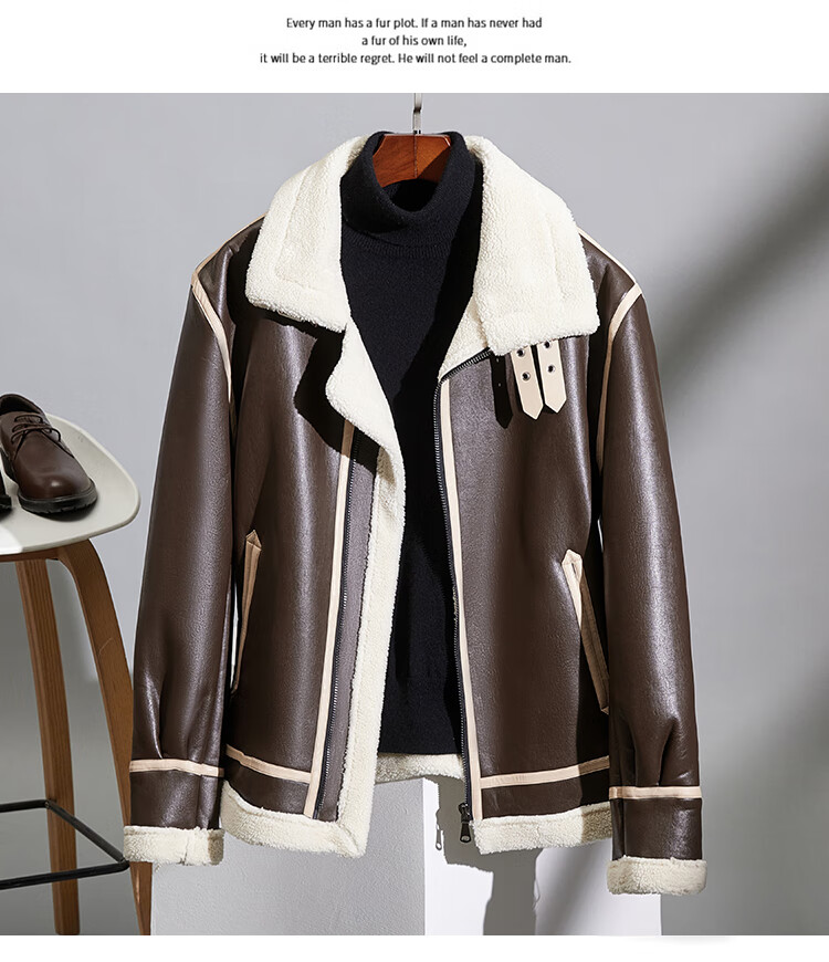 Pierre Cardin fur one-piece men's winter large size velvet thickened leather jacket short motorcycle jacket men's lamb wool jacket brown XL (light business)