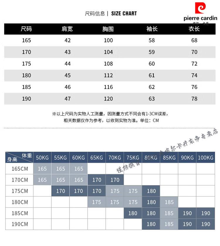 China (cm) 165 / 88-90 170 / 96-98 175 / 108-110 180 / 118-122 185 / 126-130
