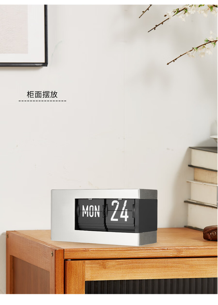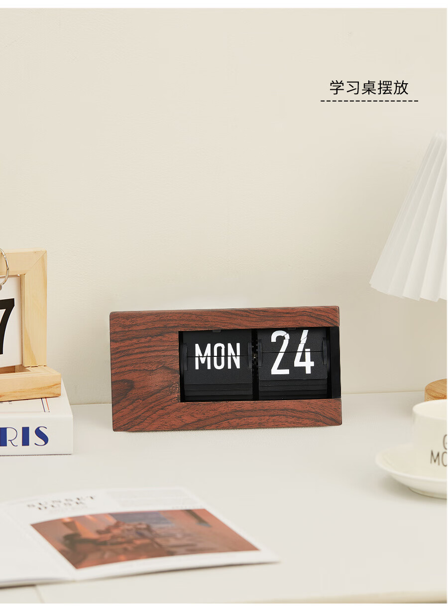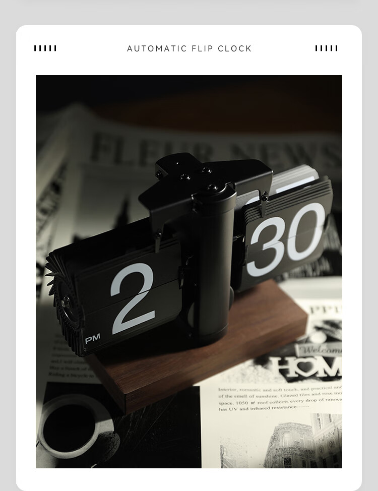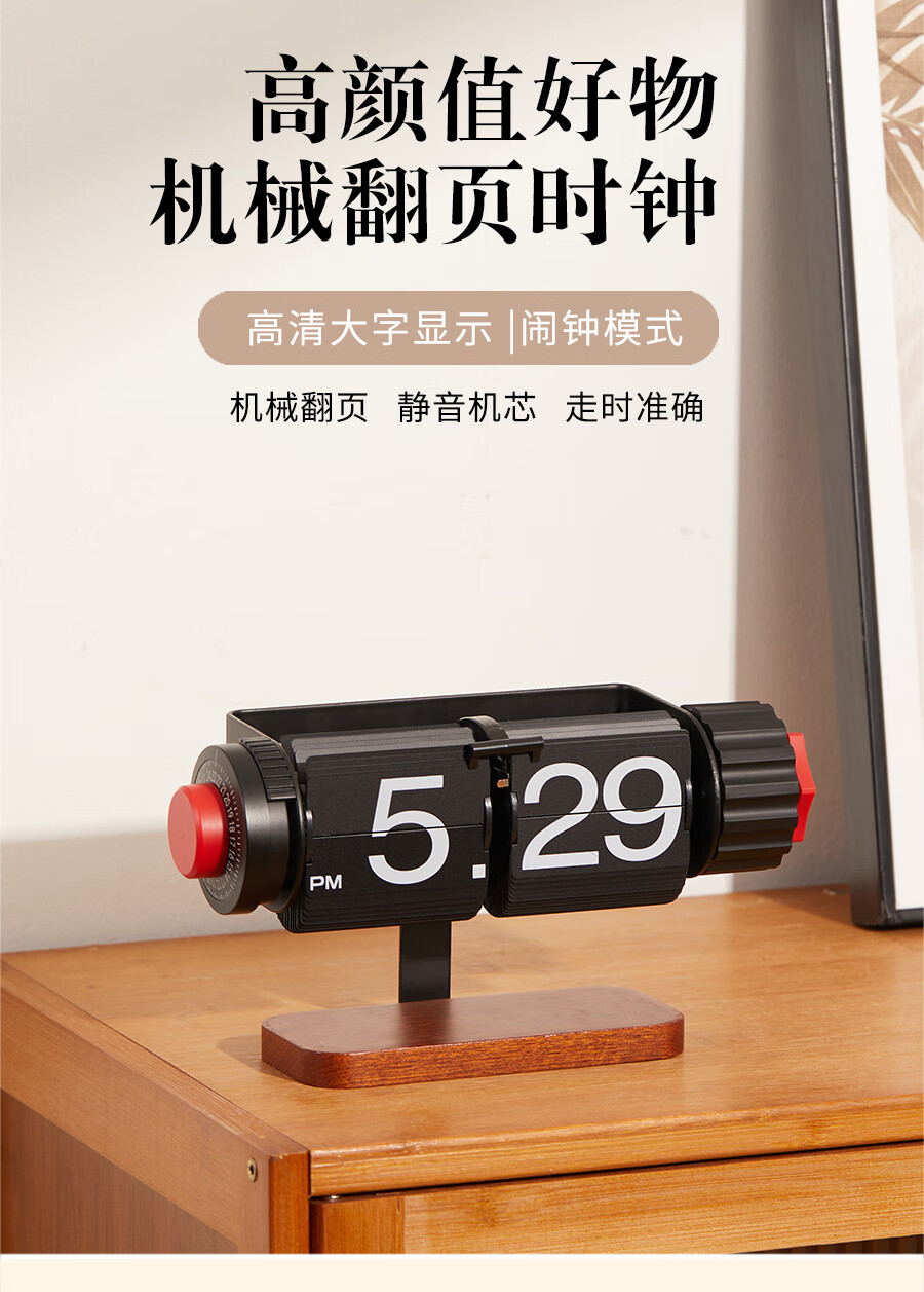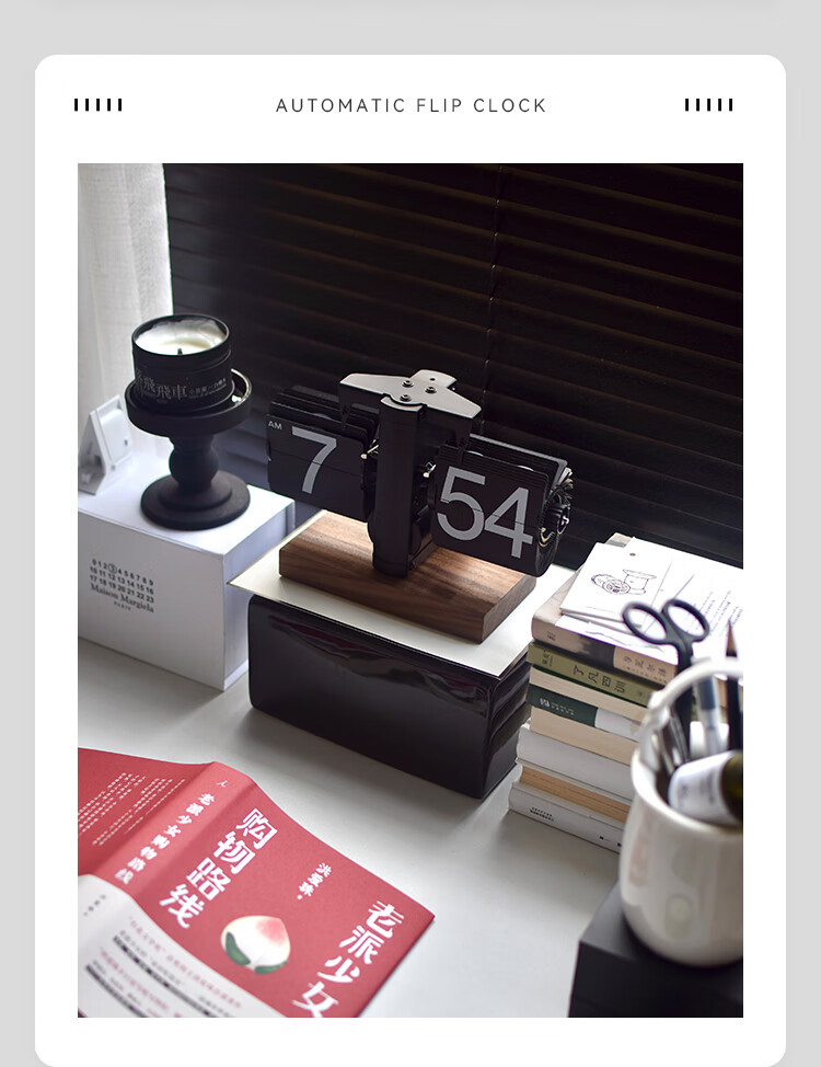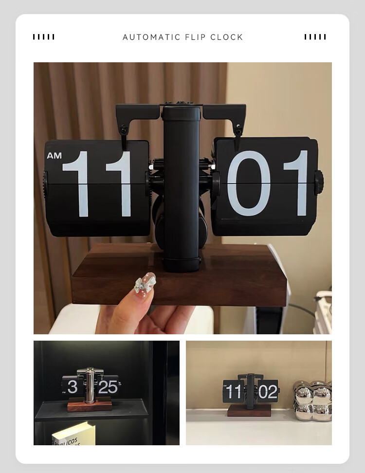 Creative automatic page-turning clock, retro living room ornaments, table clock, modern simple mechanical clock, pendulum clock, home decoration desk clock, 24-hour glossy black, free battery