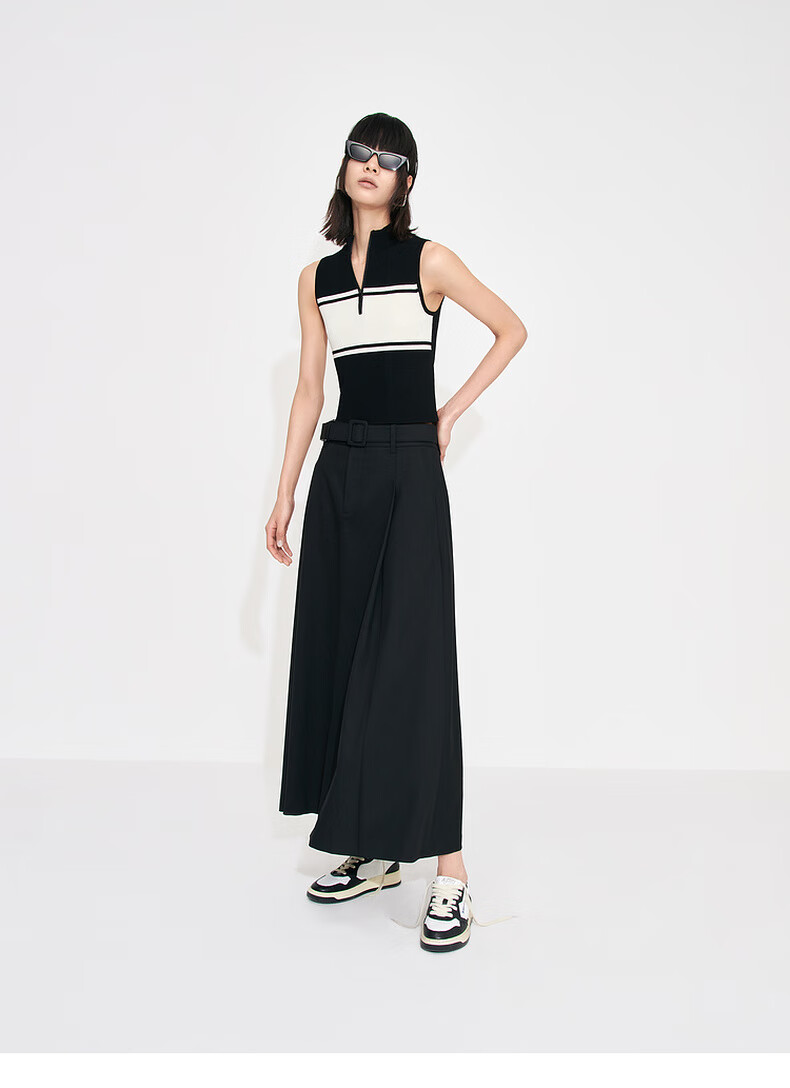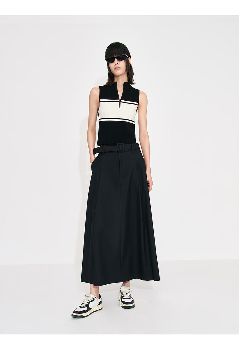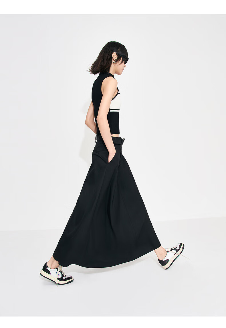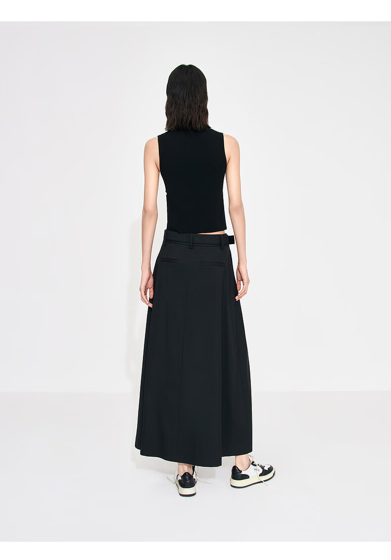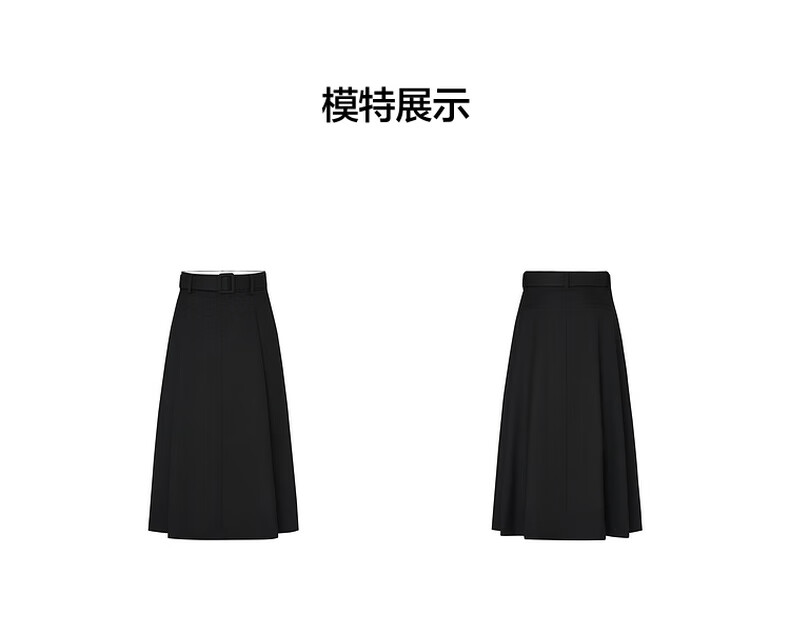 MO&Co. Mid-high waist long pleated loose A-line skirt umbrella skirt (with belt) design skirt Moanke black-2nd batch M 165