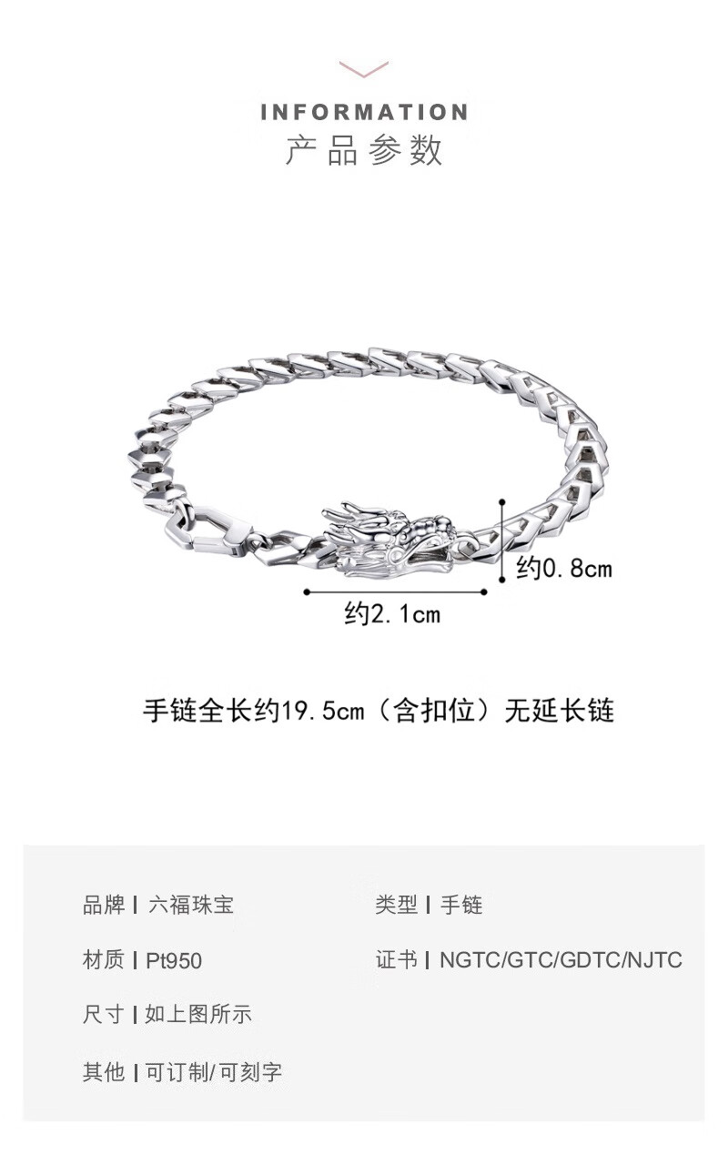 Lukfook Jewelry Platinum 950 Dragon Head Platinum Bracelet Dragon Bone Chain Year of the Dragon Zodiac Men's Price L19TBPB0024 24.50g (including labor cost 2401 yuan)