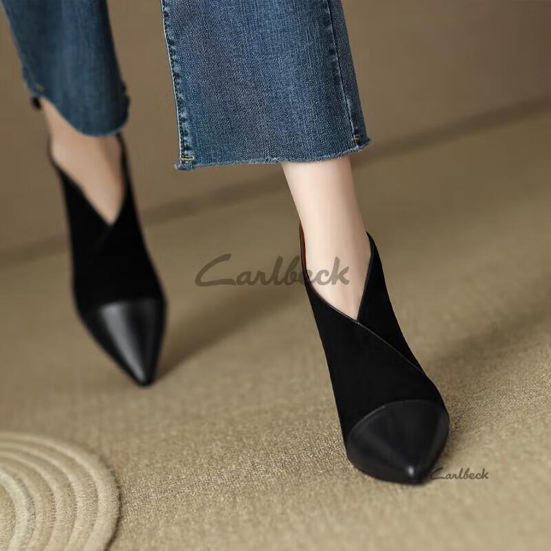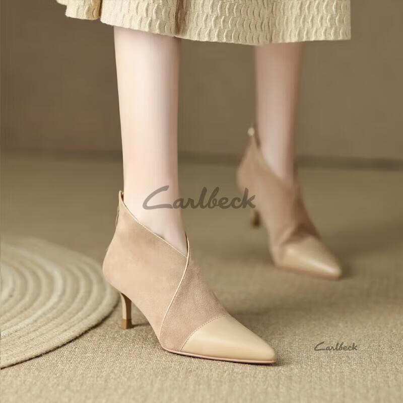 Carl Beck Brand French Small Ankle Boots Women's Stiletto 2023 Autumn and Winter New Women's Shoes Sheepskin Pointed Toe High Heels Boots Women's Short Boots Black 37 Plus Velvet