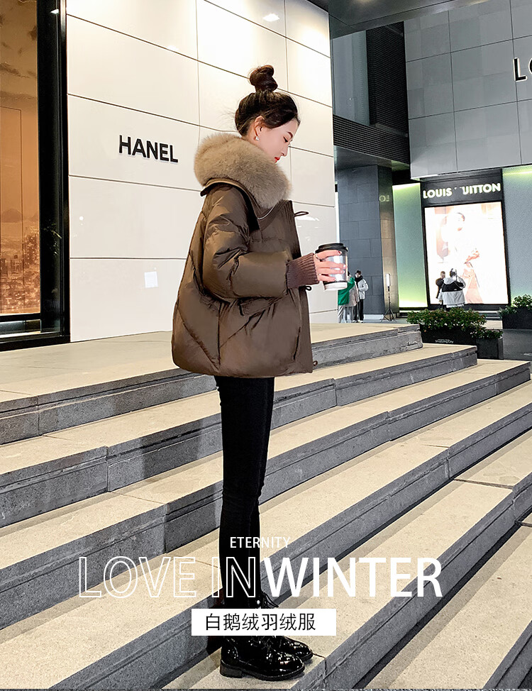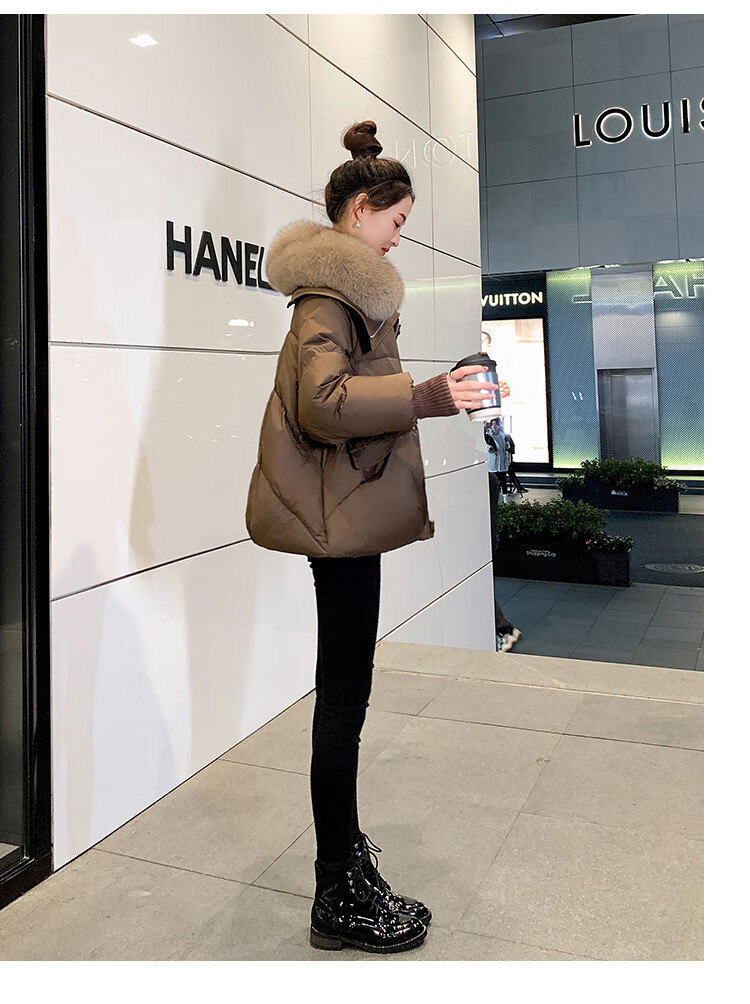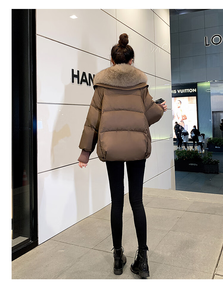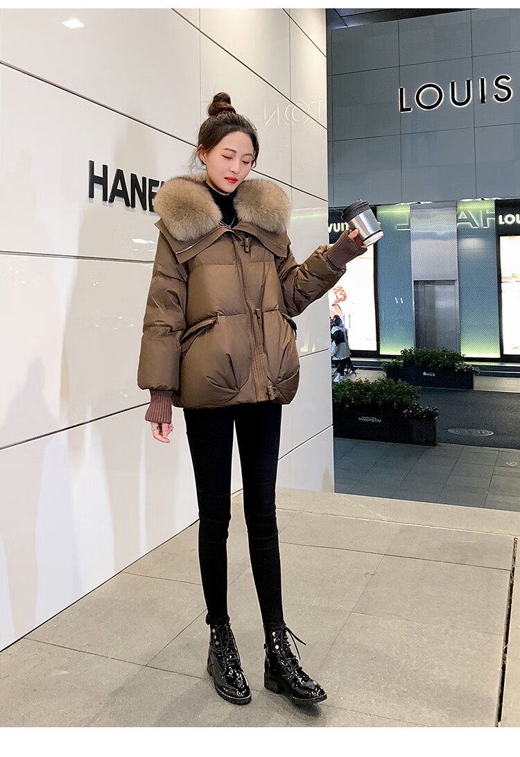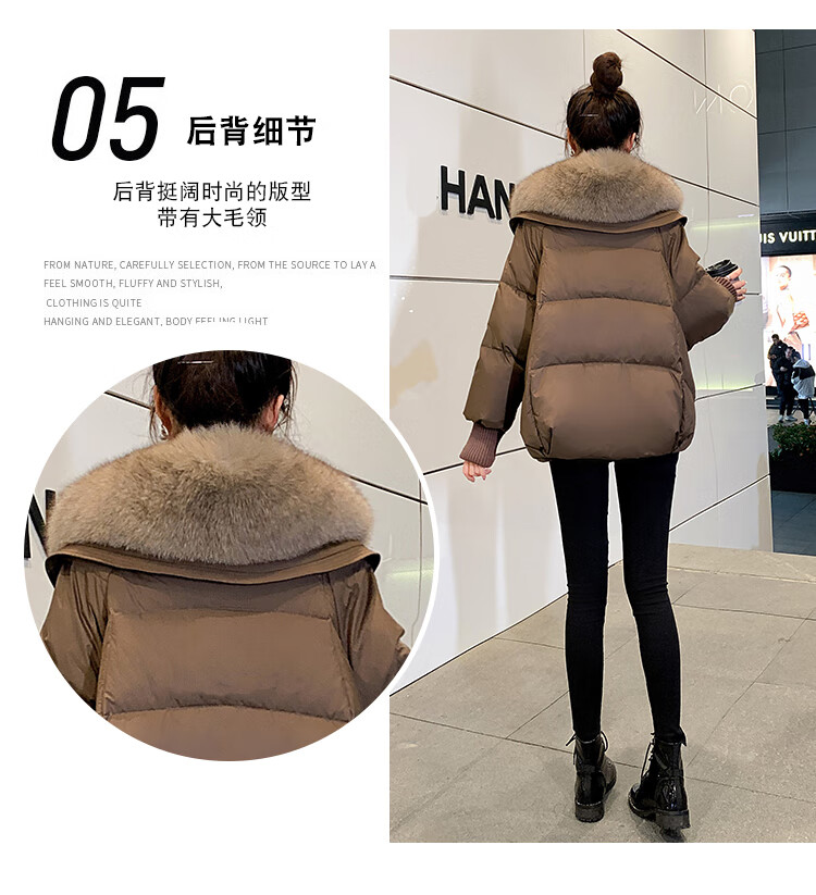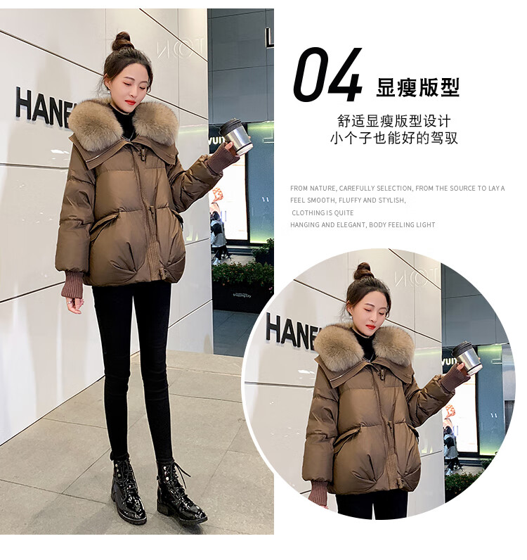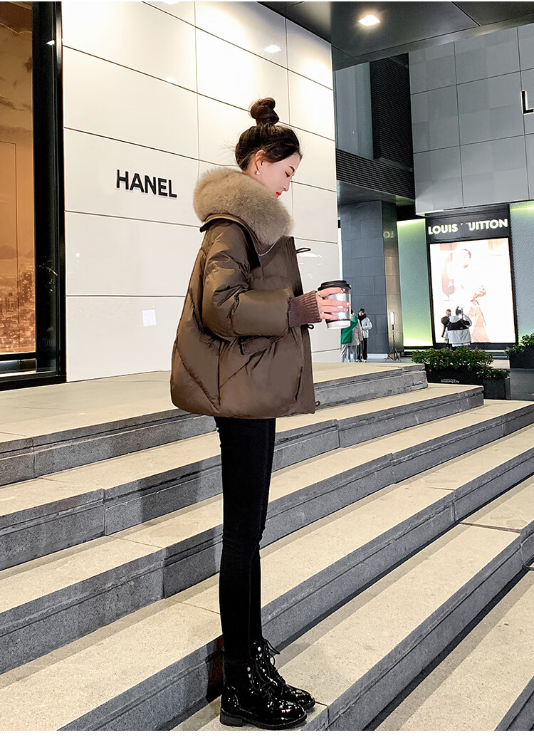 RLAS Chaqueta Corta De Plumas Mujer 2026 Invierno Nuevo Estilo Moda Y Versátil Chaqueta con Cuello De Piel Grande De Plumas De Ganso Blanco para Personas Pequeñas Marrón Lujosa Piel De Zorro S 160