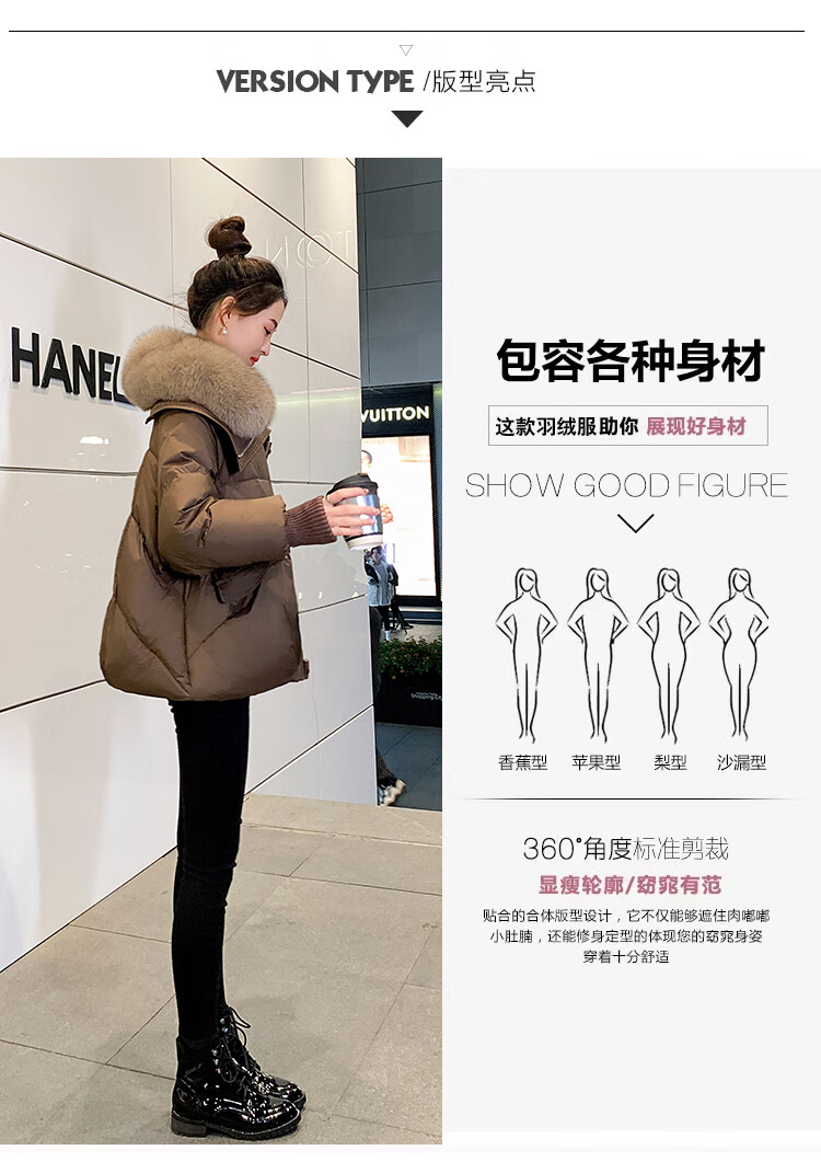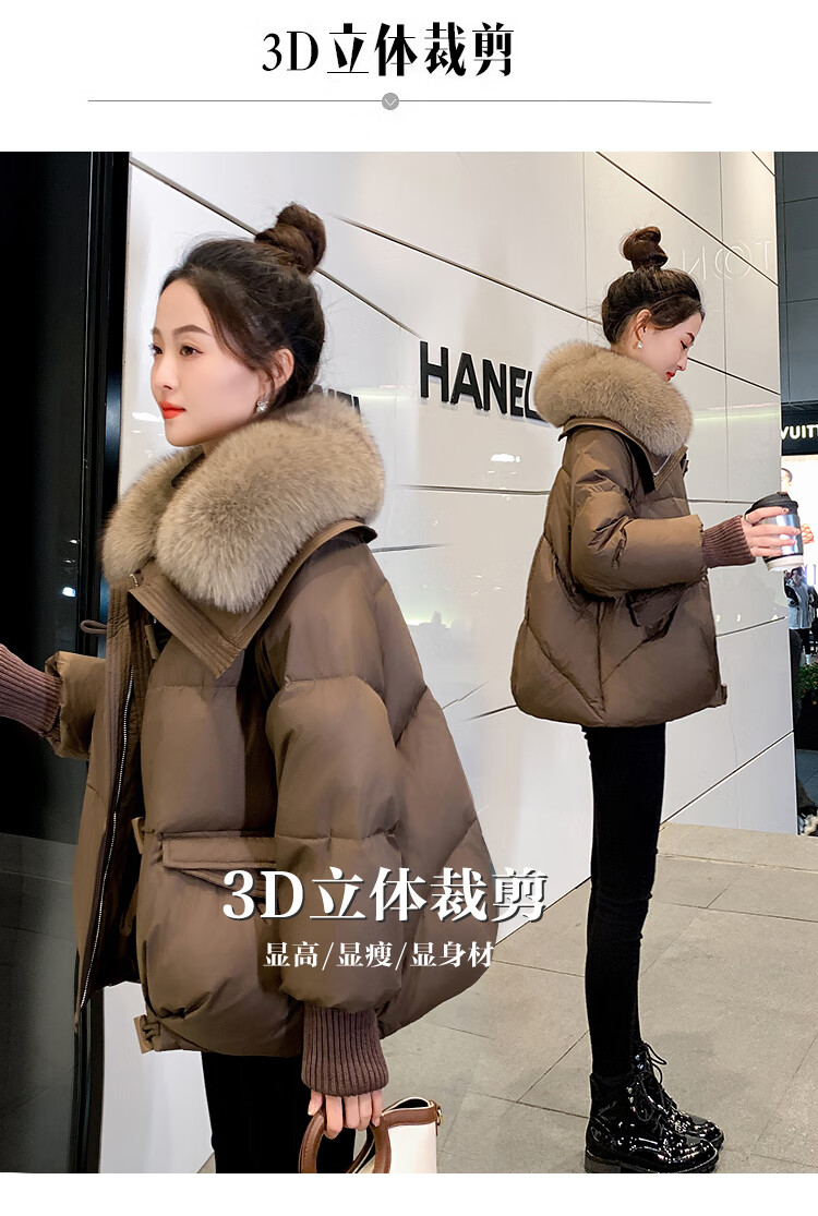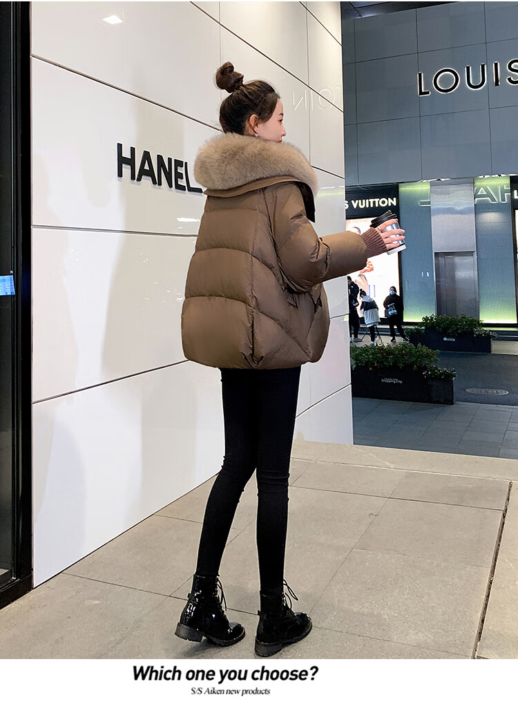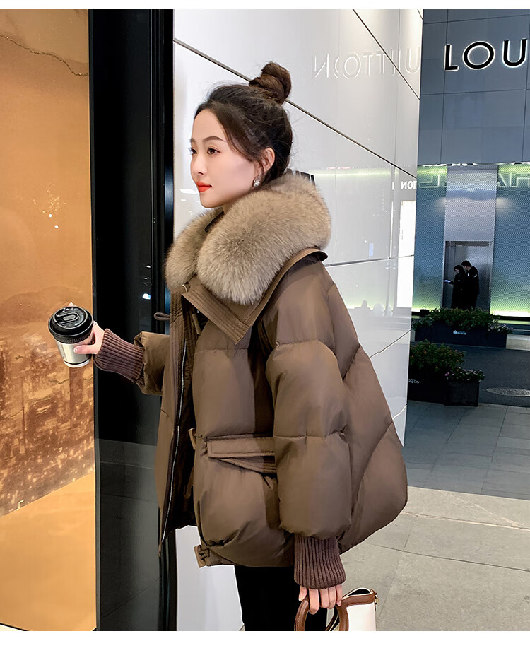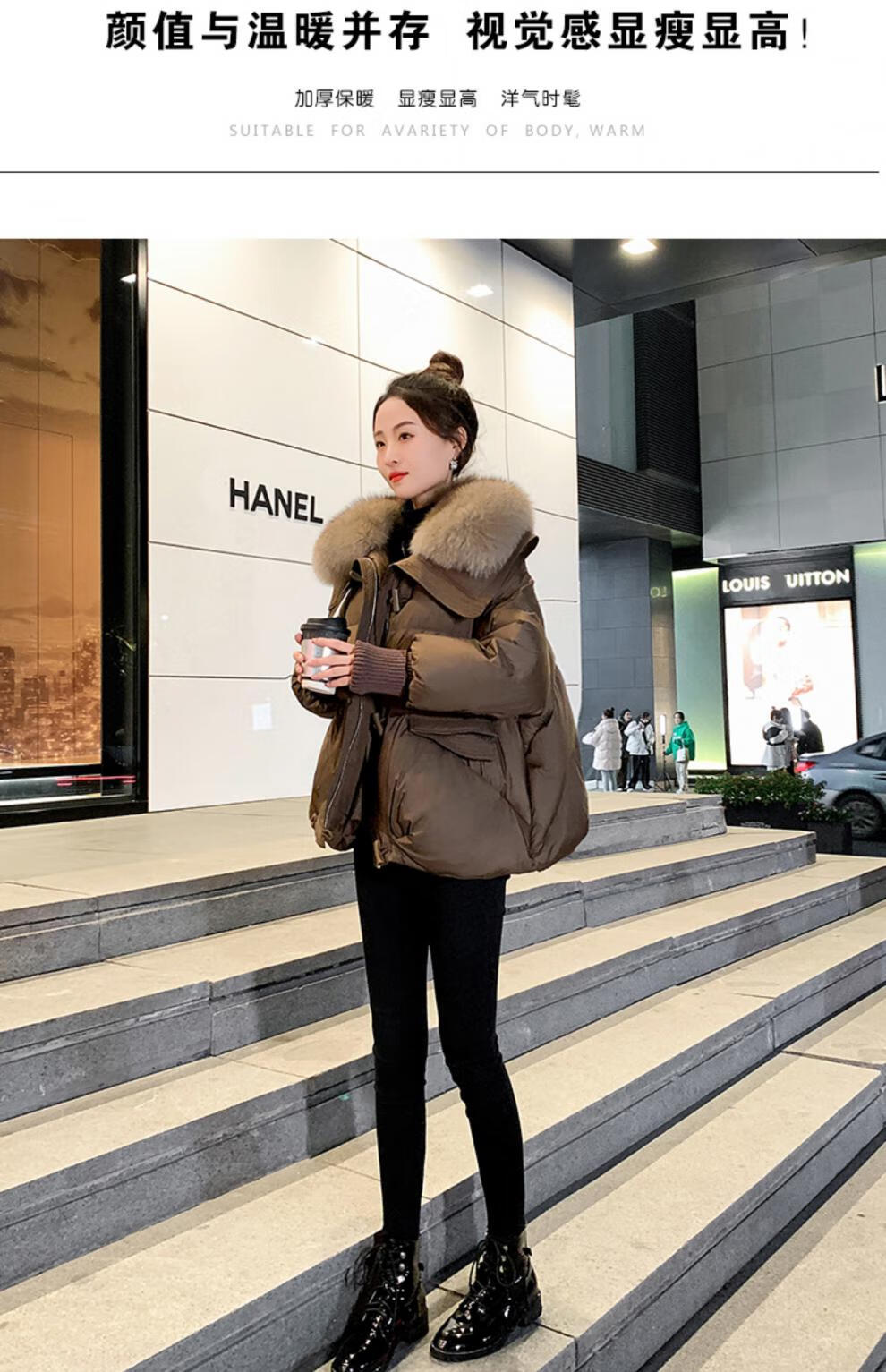 RLAS Chaqueta Corta De Plumas Mujer 2026 Invierno Nuevo Estilo Moda Y Versátil Chaqueta con Cuello De Piel Grande De Plumas De Ganso Blanco para Personas Pequeñas Marrón Lujosa Piel De Zorro S 160