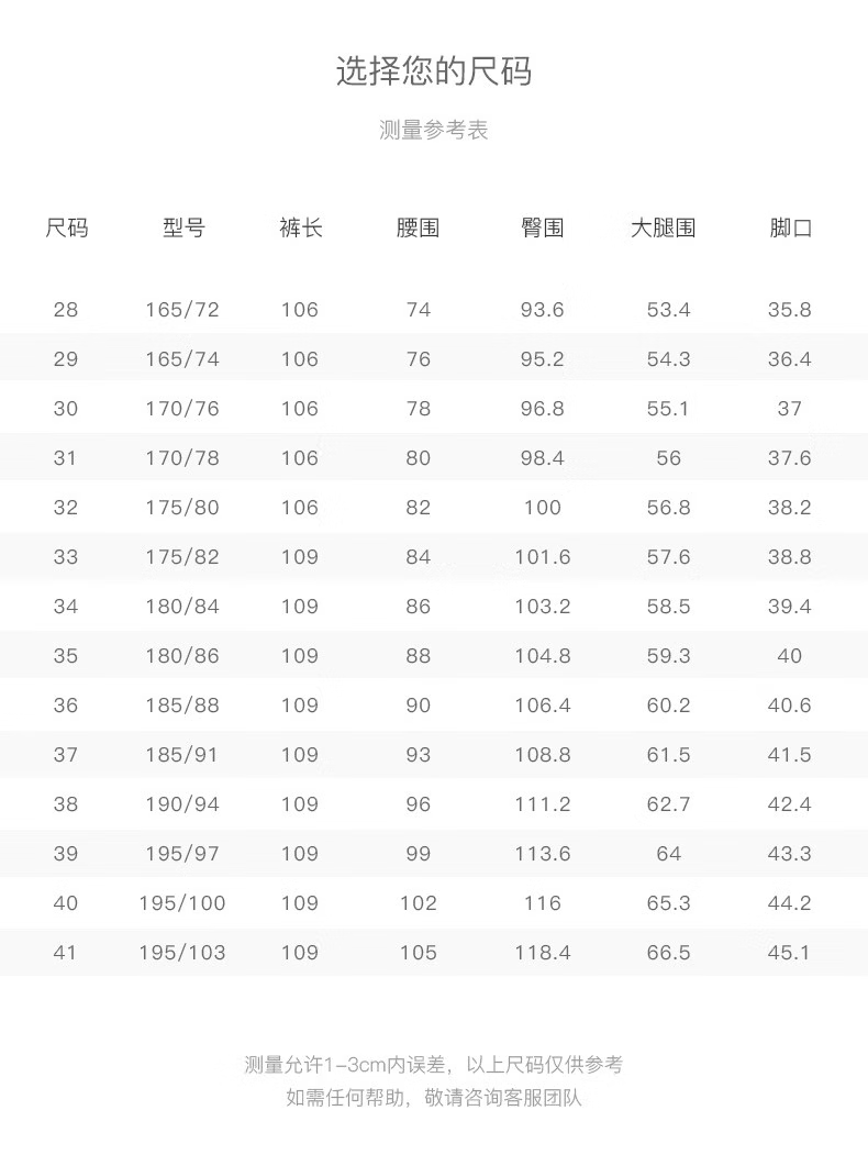 Outseam (cm) 99 cm 101.5 cm 104 cm 106.5 cm 109 cm