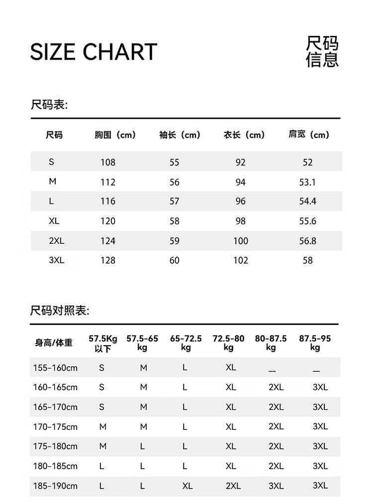 China (cm) 165 / 88-90 170 / 96-98 175 / 108-110 180 / 118-122 185 / 126-130