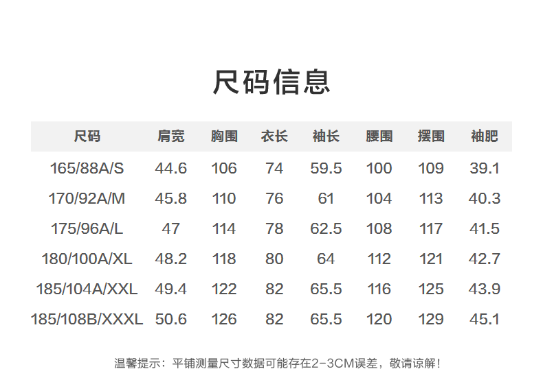 China (cm) 165 / 88-90 170 / 96-98 175 / 108-110 180 / 118-122 185 / 126-130