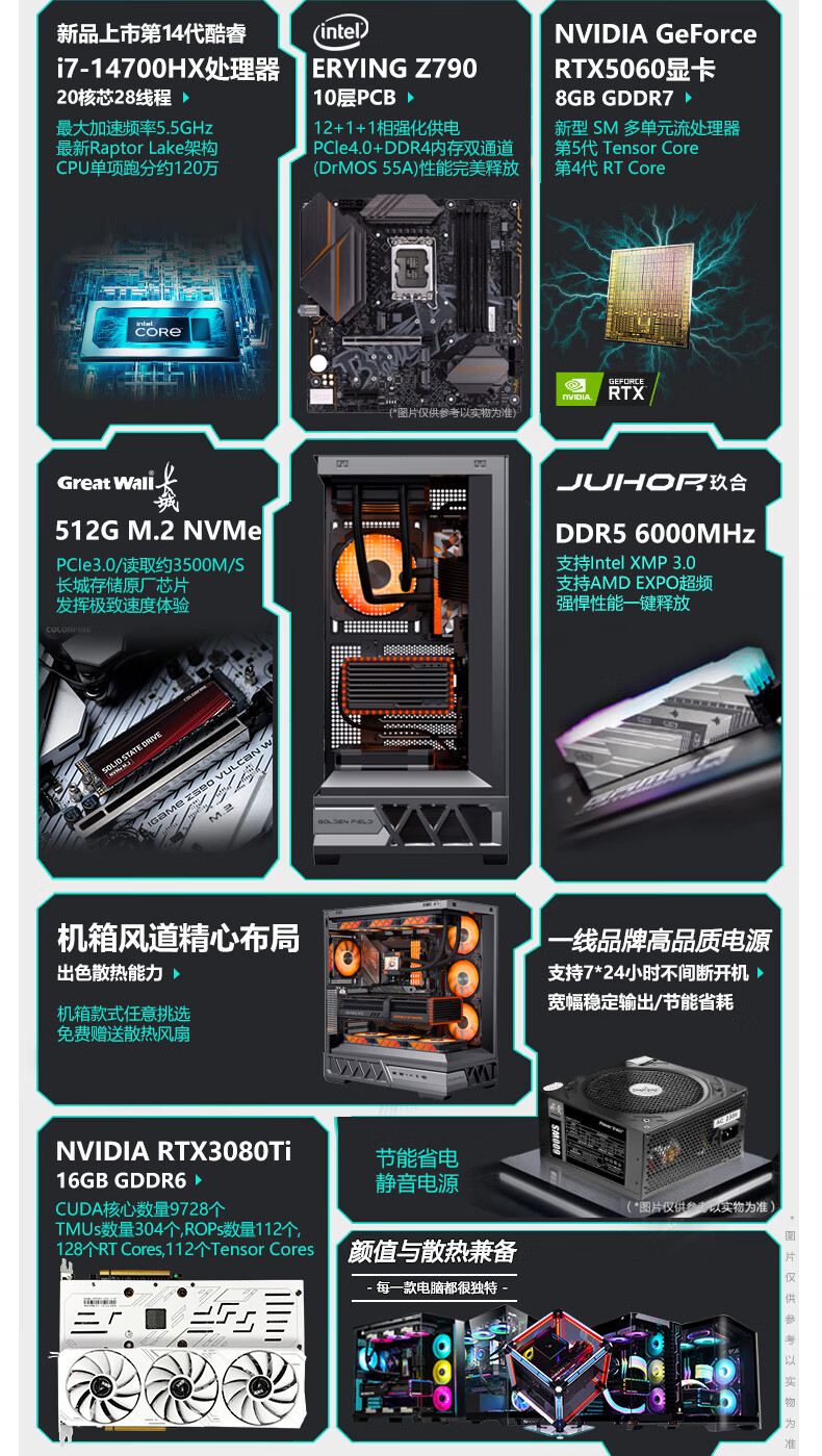 Colorful 14th generation new product Intel i9 14900/i7 14700KF+RTX3060/3080 16G/RTX50 series independent display DDR5 desktop computer game live assembly host configuration 2丨20-core 14th generation Core i7/high-end design/professional multi-drive 14th generation new product launched + processor supports overclocking/high-frequency DDR5 memory