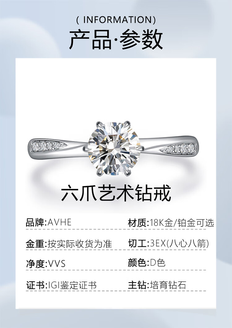 AVHE 18K gold PT950 platinum cultured diamond six-claw art ladies ring asking for wedding gift Chinese Valentine's Day IGI certificate platinum diamond ring + 1 carat diamond (D/VVS/3EX/N)