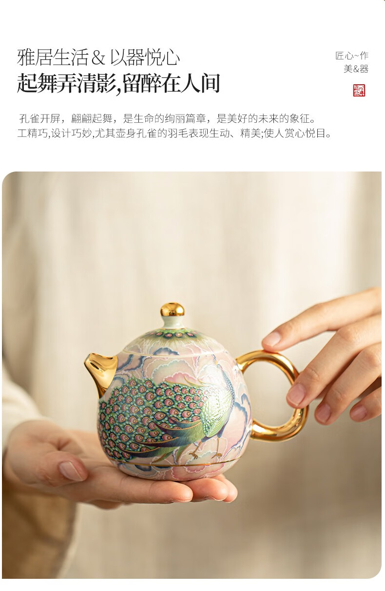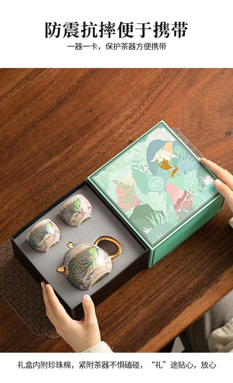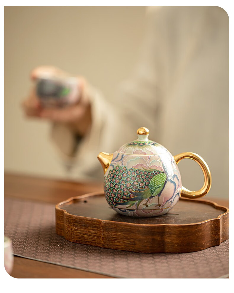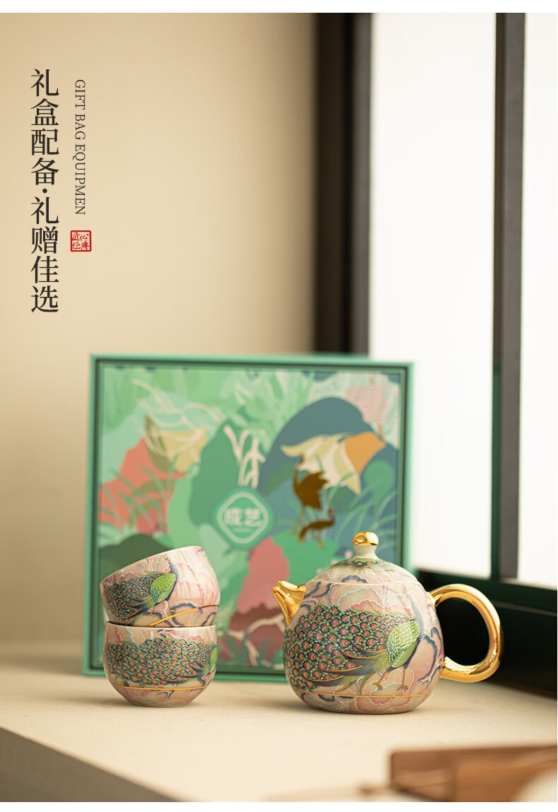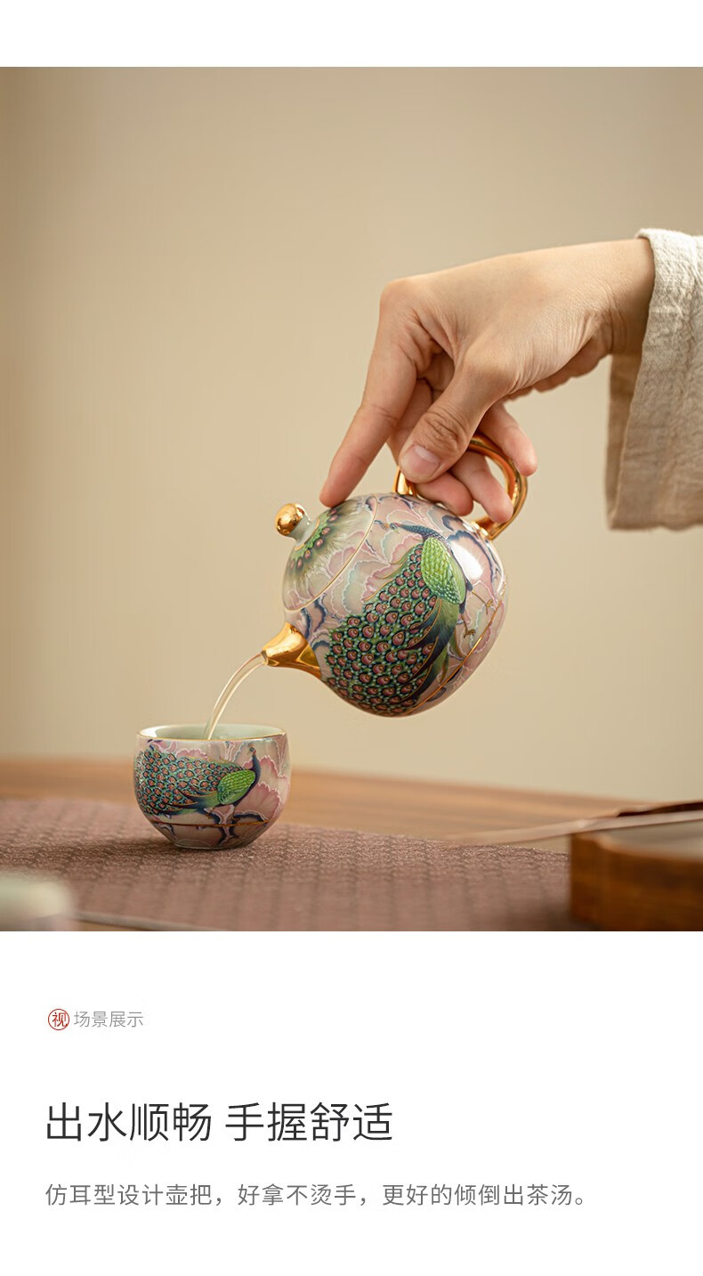 Pottery feather enamel color national trend peacock kung fu tea set one pot two cups household teapot ceramic small set tea set tea set national trend peacock rhyme Longdan teapot 3 pieces