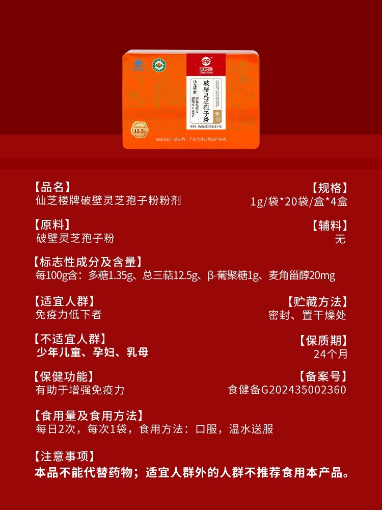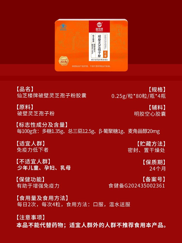 仙芝楼破壁灵芝孢子粉胶囊有助于增强免疫力中老年人保健术后康复送礼品 孢子粉1g/袋*6袋【3天试用量】