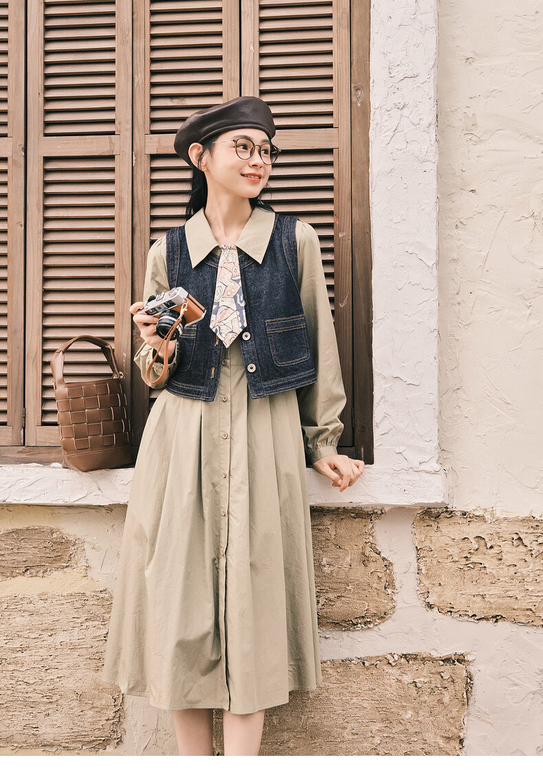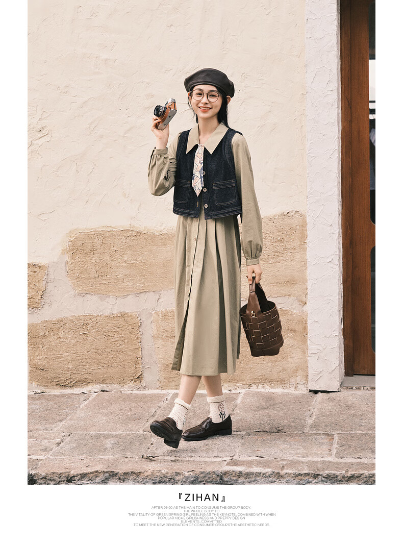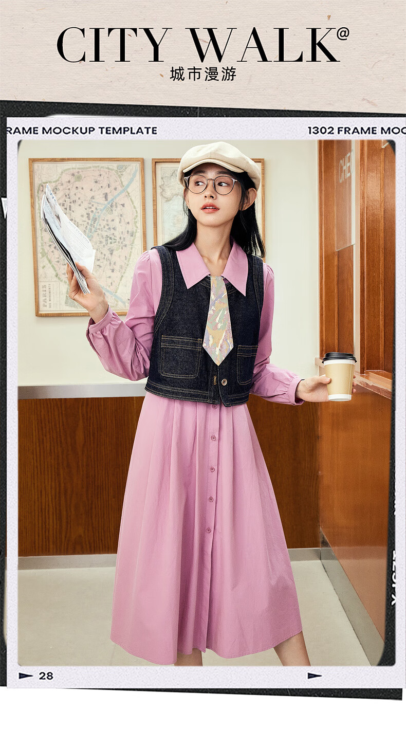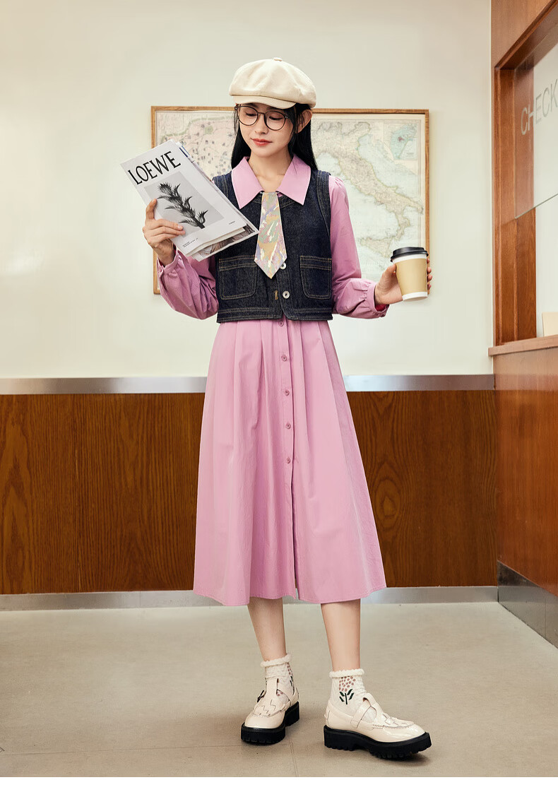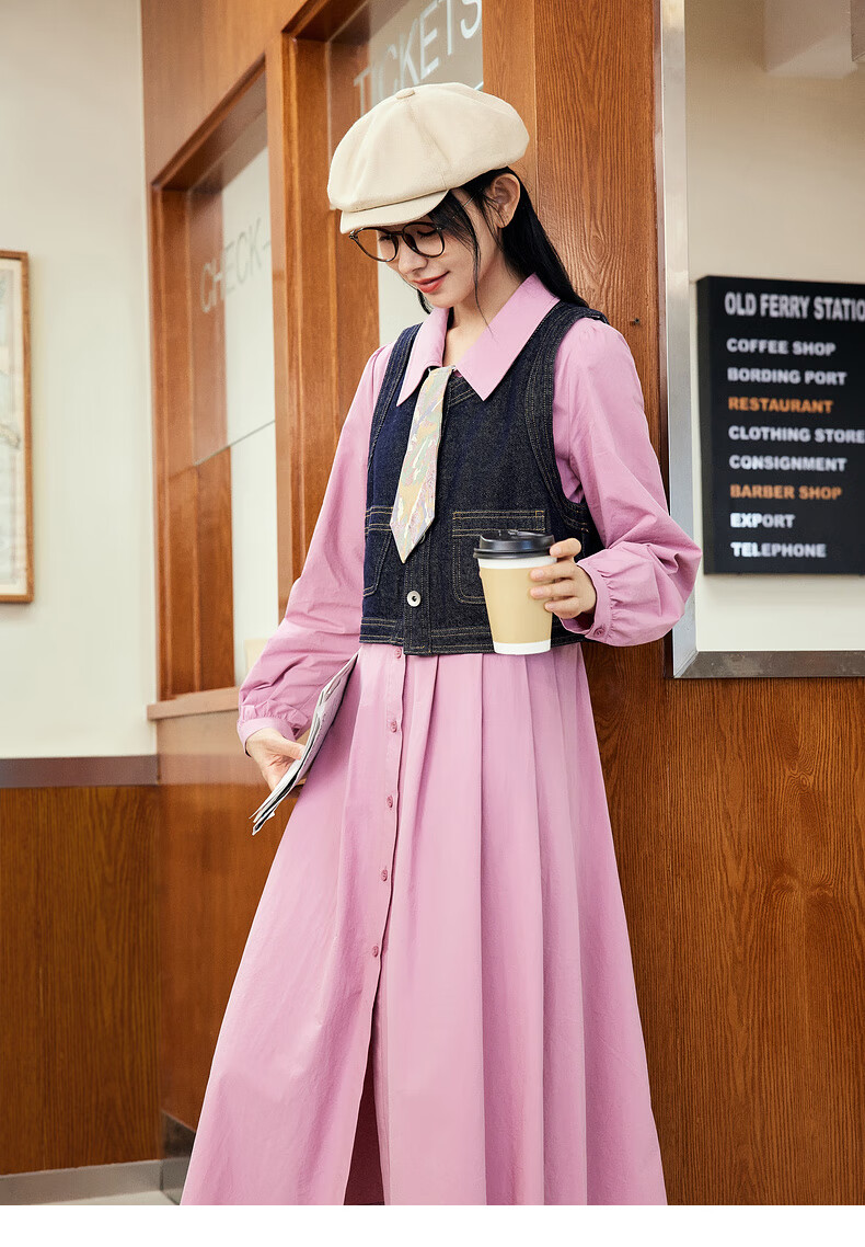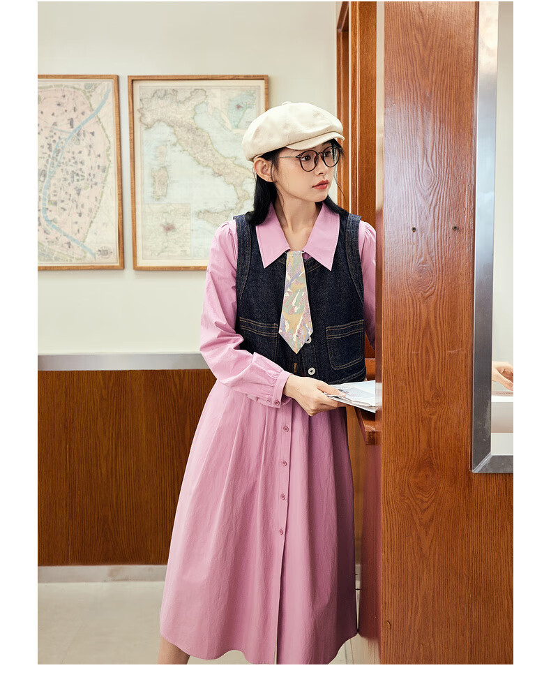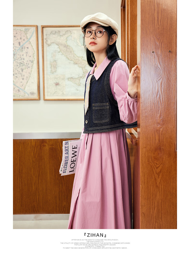 Zihan (ZIHAN) Zihan retro denim vest + pink mid-length shirt dress fashion suit spring raspberry pink XS
