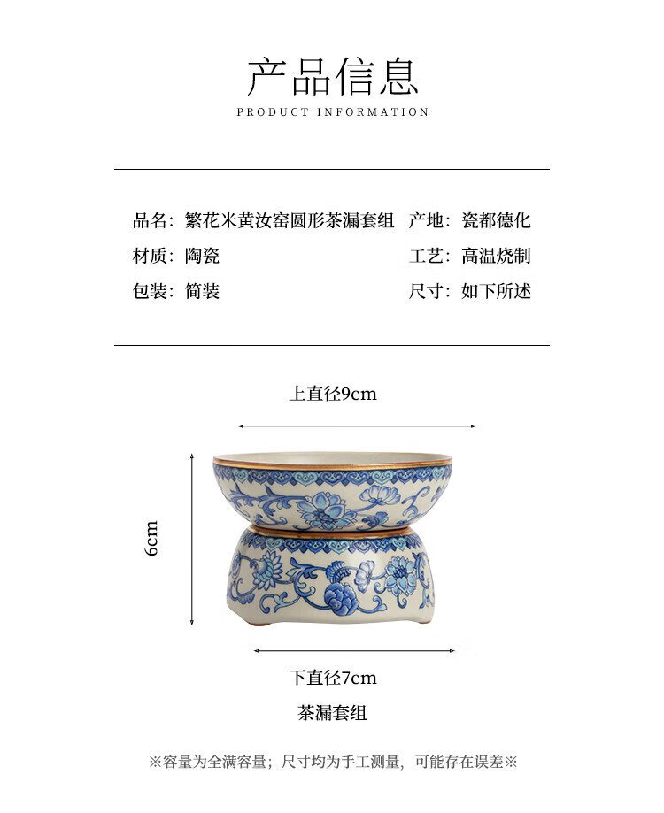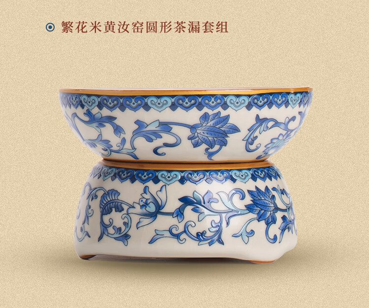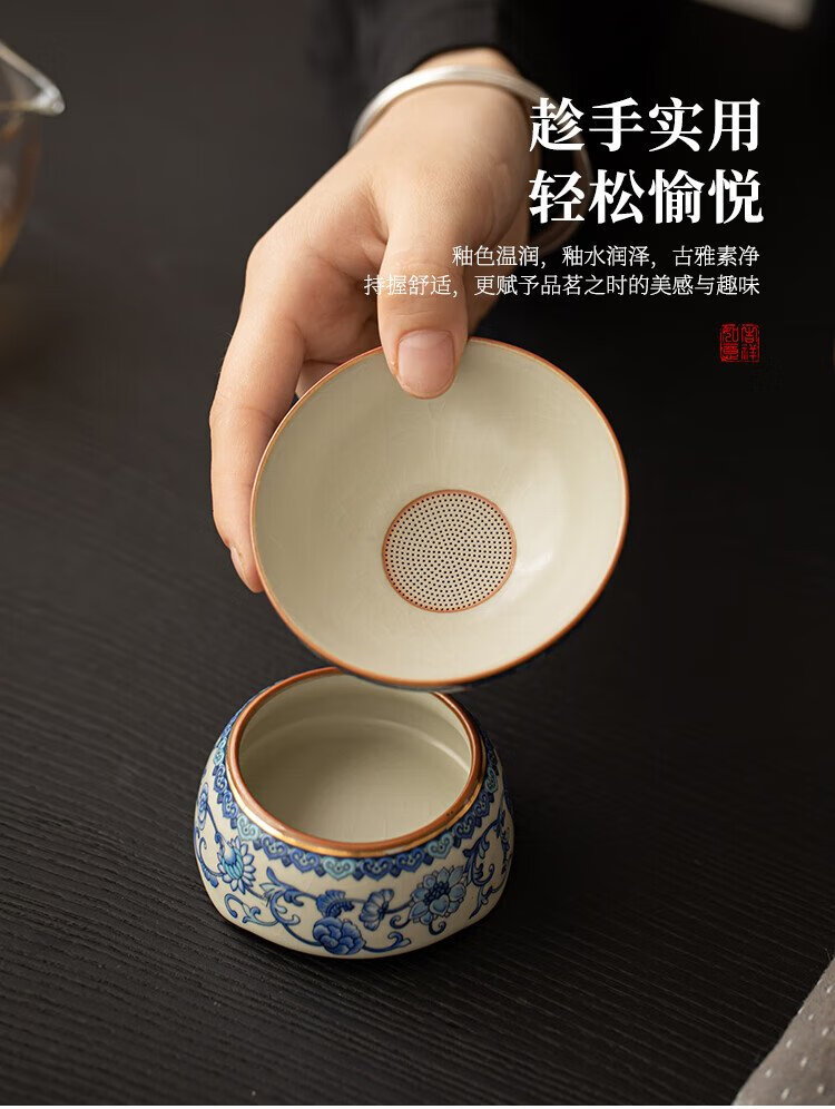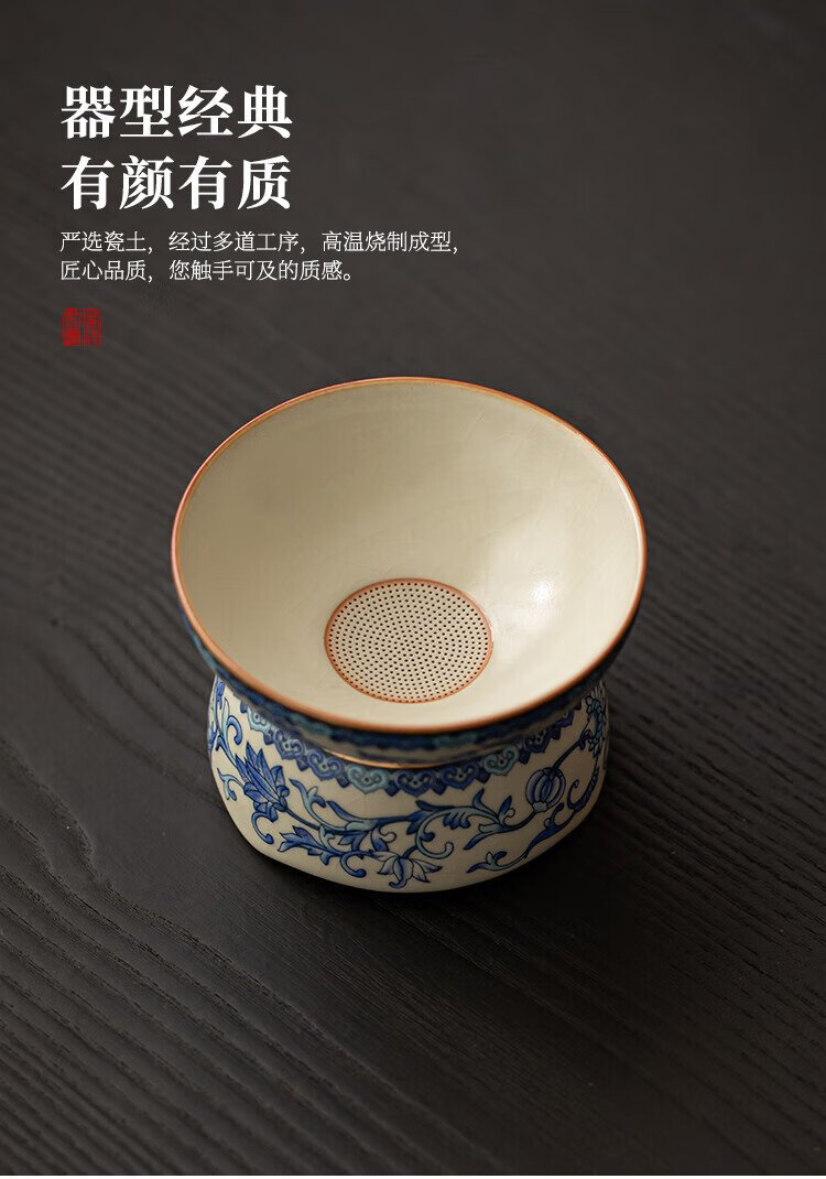Xi Yuanji Blue and White Ru Kiln Tea Strainer Integrated Tea Strainer Tea Making Artifact Tea Separator with Full Flower Painting Gold Enamel Flower Beige Ru Kiln Round Tea Strainer Set + Male Cup