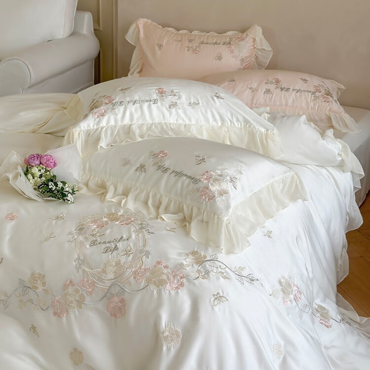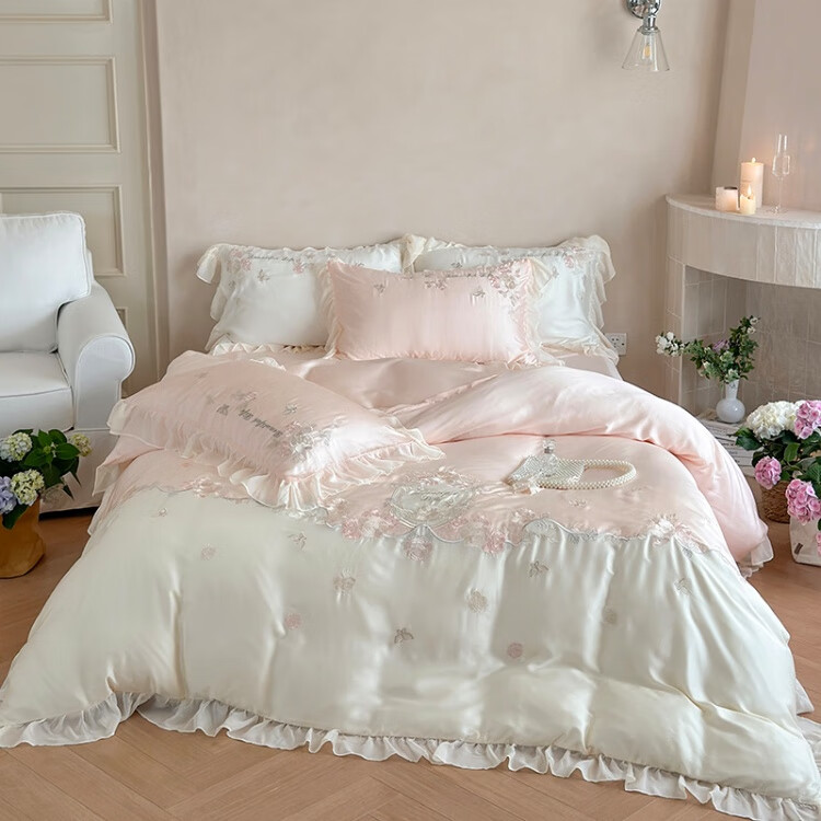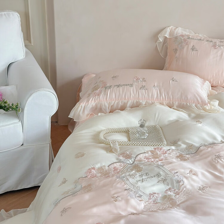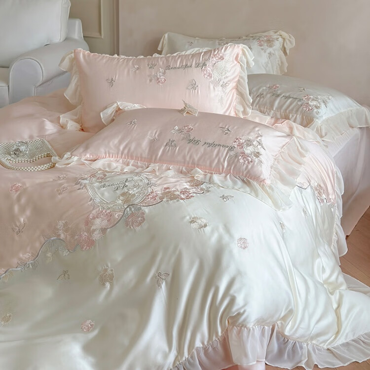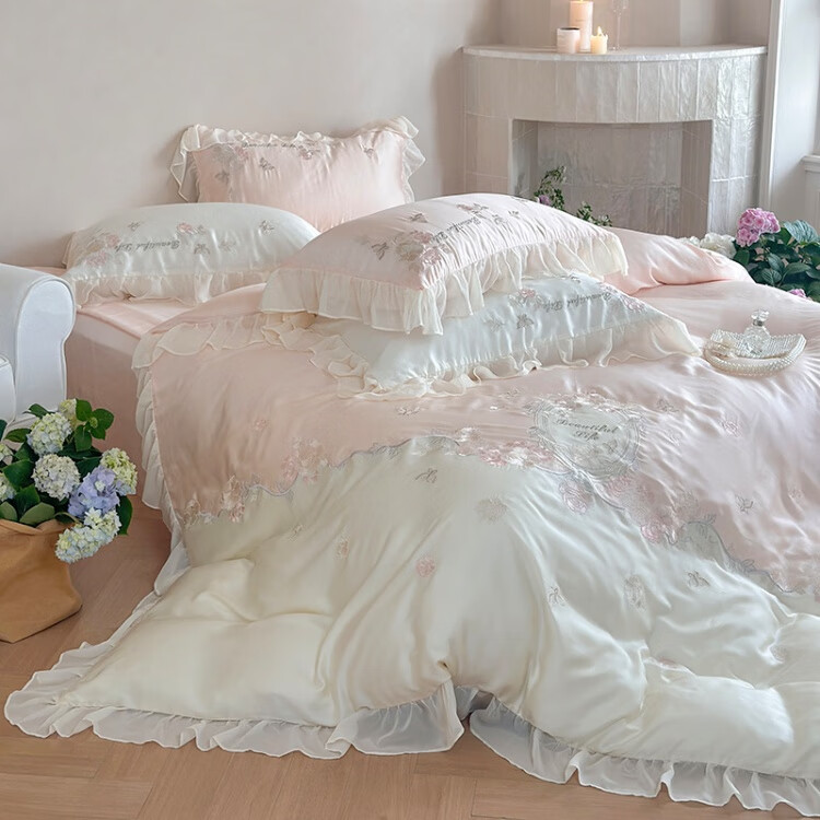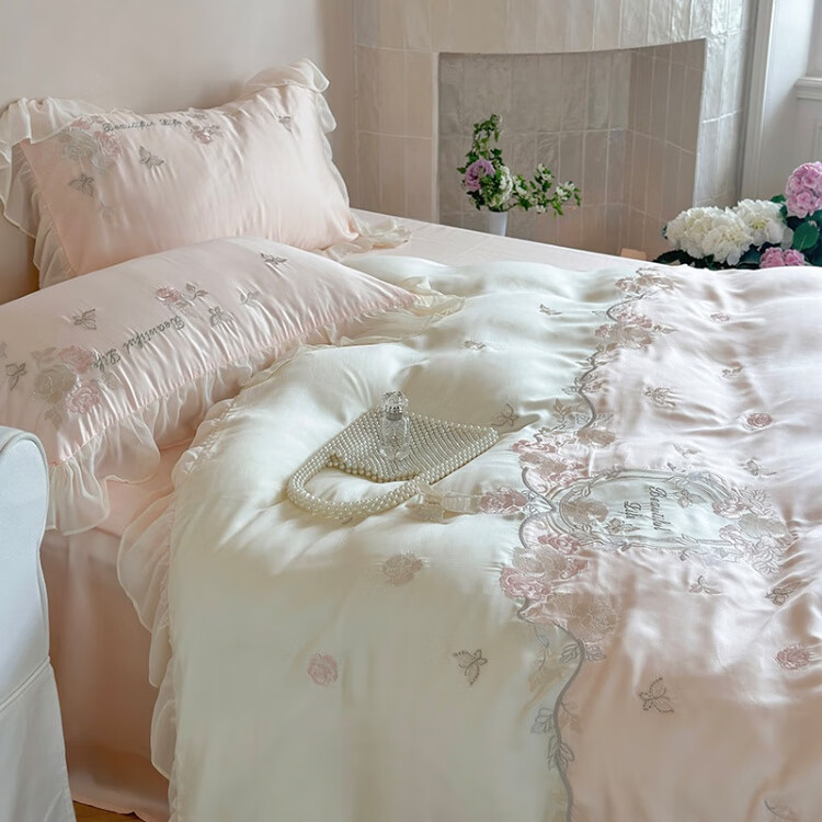 Mercury series light luxury French cotton four-season new 200-count cotton bed four-piece set princess style embroidered flower bedding quilt cover Miu-cotton-romanticism-pink Category A maternal and infant grade bed sheet 1.8 meters suitable for quilt core 200*230