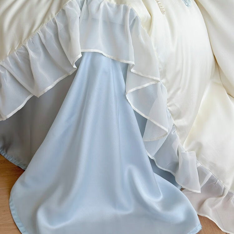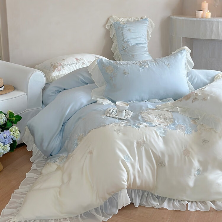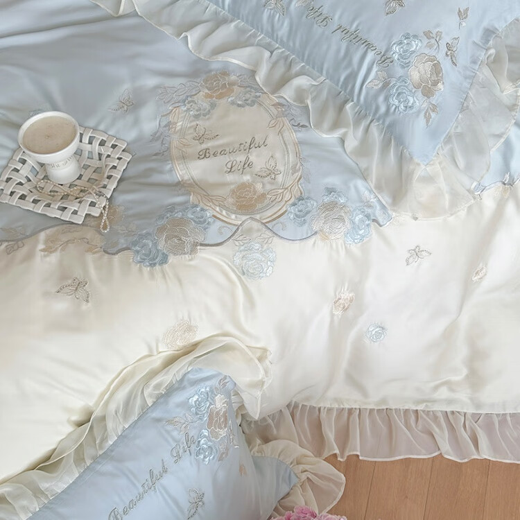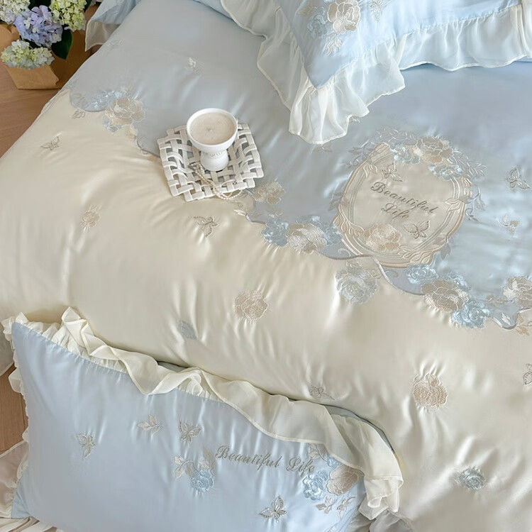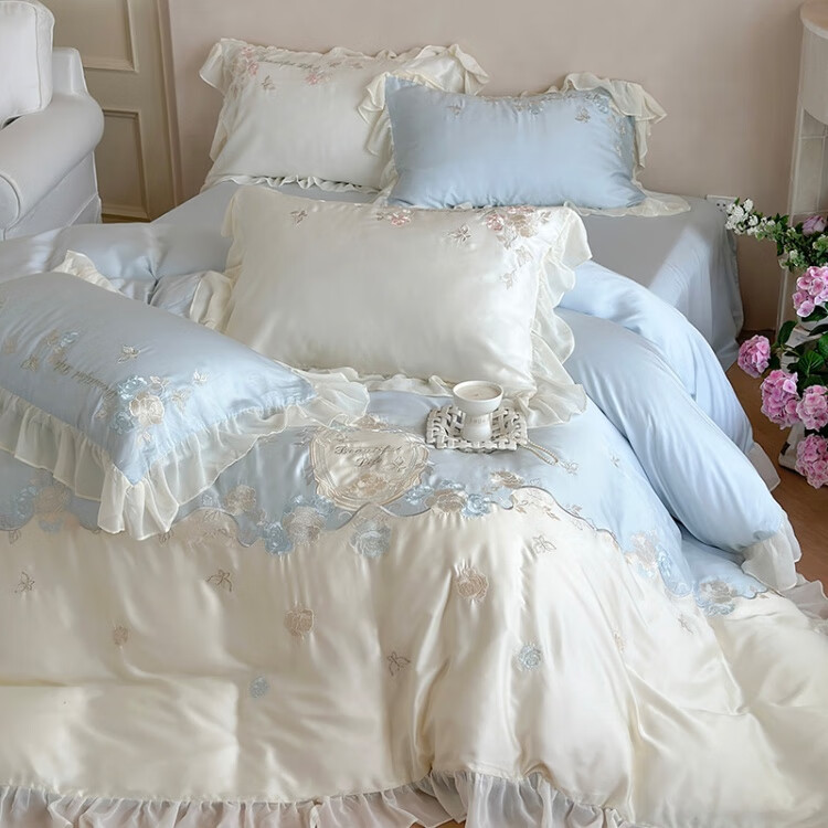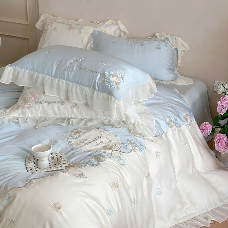 Mercury series light luxury French cotton four-season new 200-count cotton bed four-piece set princess style embroidered flower bedding quilt cover Miu-cotton-romanticism-pink Category A maternal and infant grade bed sheet 1.8 meters suitable for quilt core 200*230