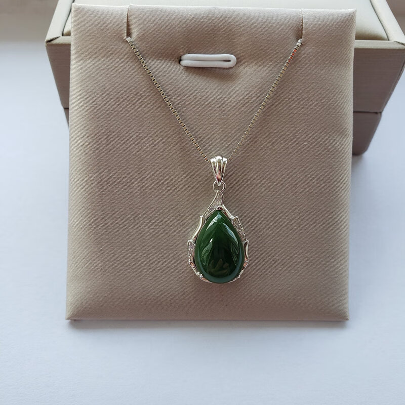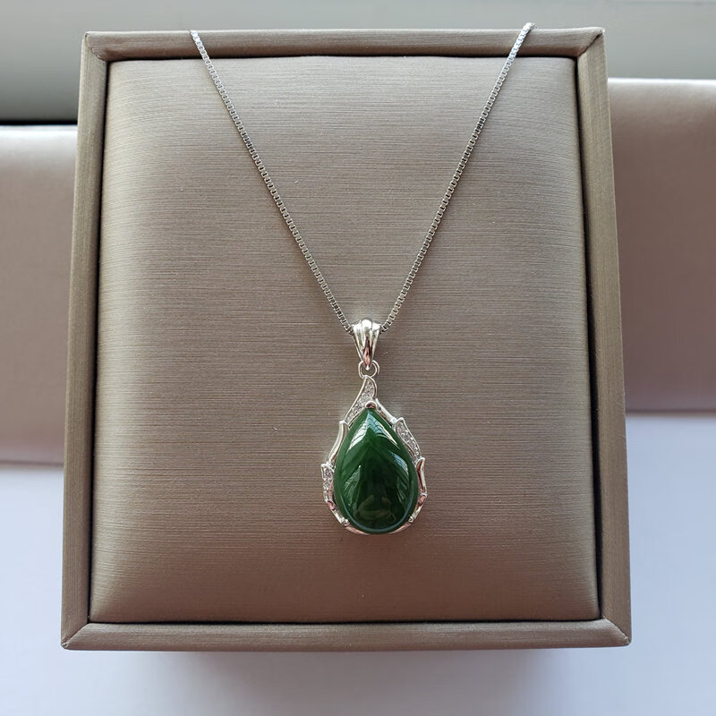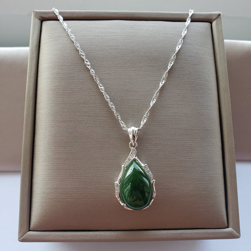 Muju's mother's 50-60th birthday gift Silver Hotan Jasper Pendant Necklace Women's Silver Inlaid Jade Clavicle Chain Silver Jewelry Mother Water Wave Chain + Pendant
