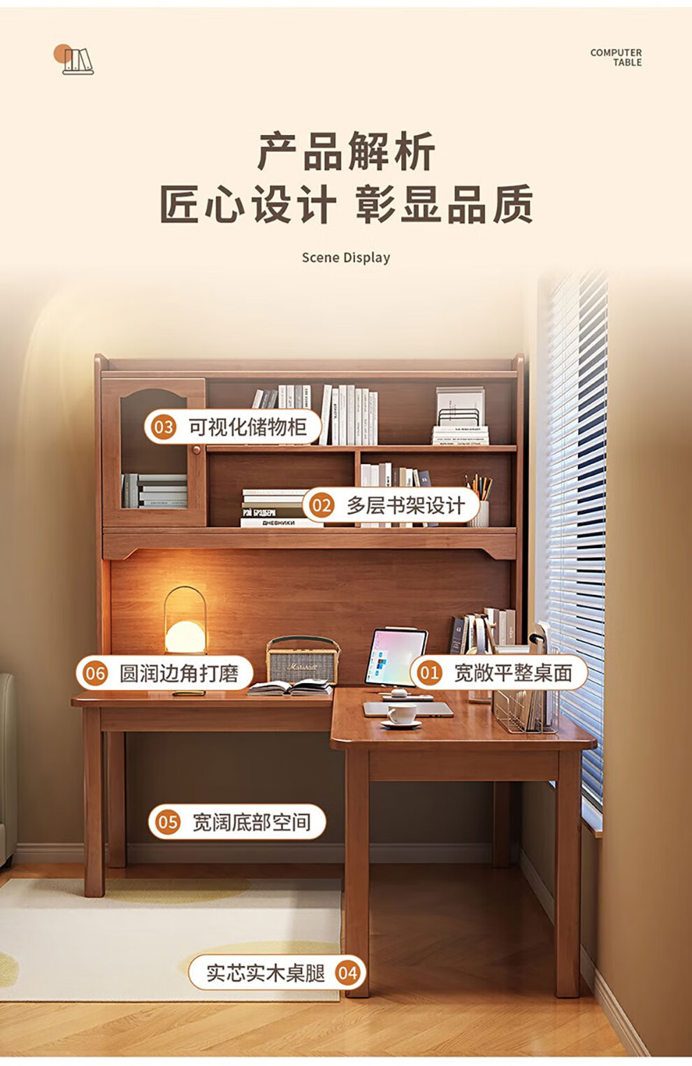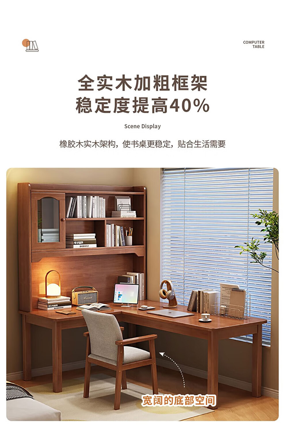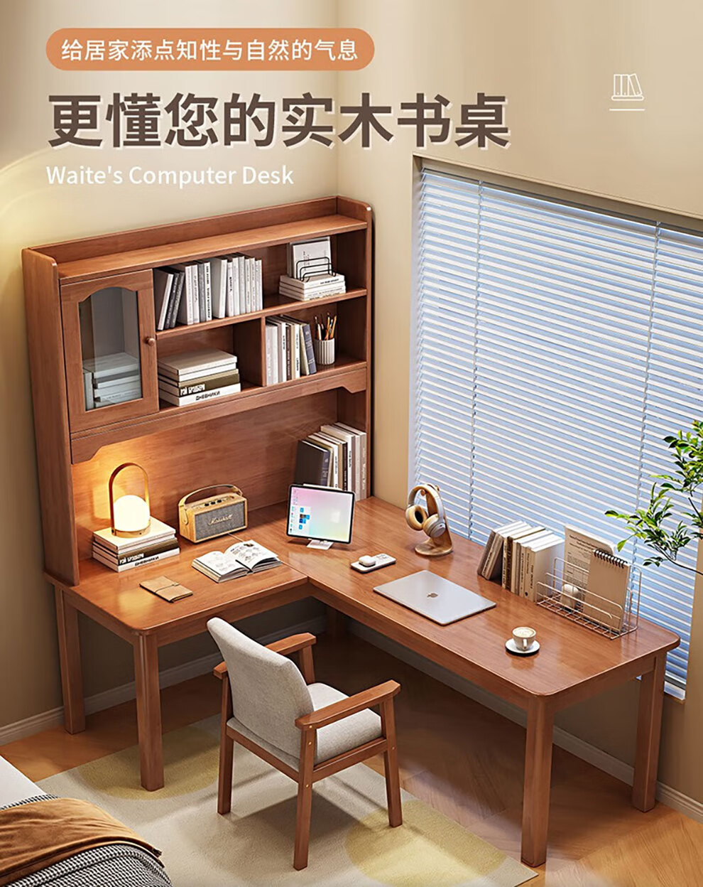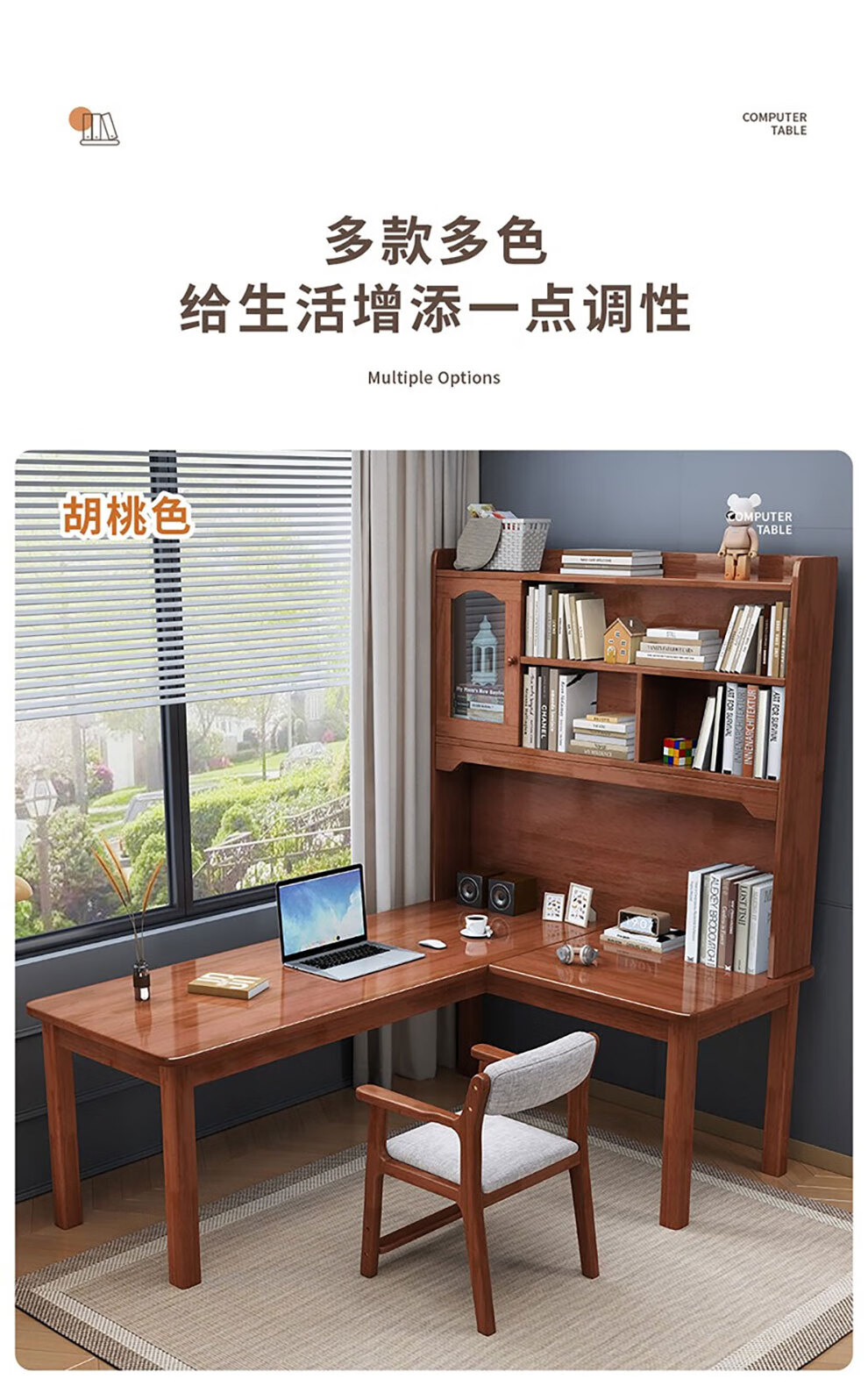 Fengyeqingqing Nordic solid wood corner desk computer desk bookshelf combination bedroom corner study table L-shaped office writing desk solid wood single table (walnut color) 1.6 meters