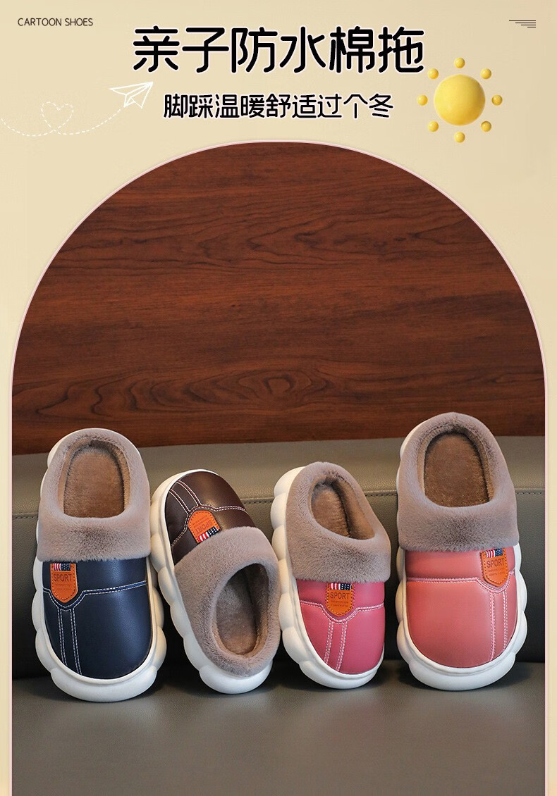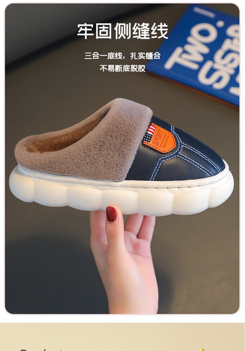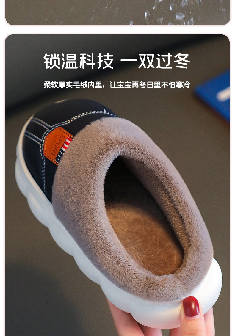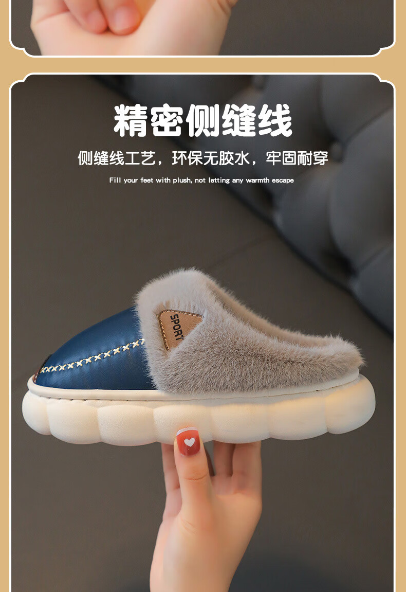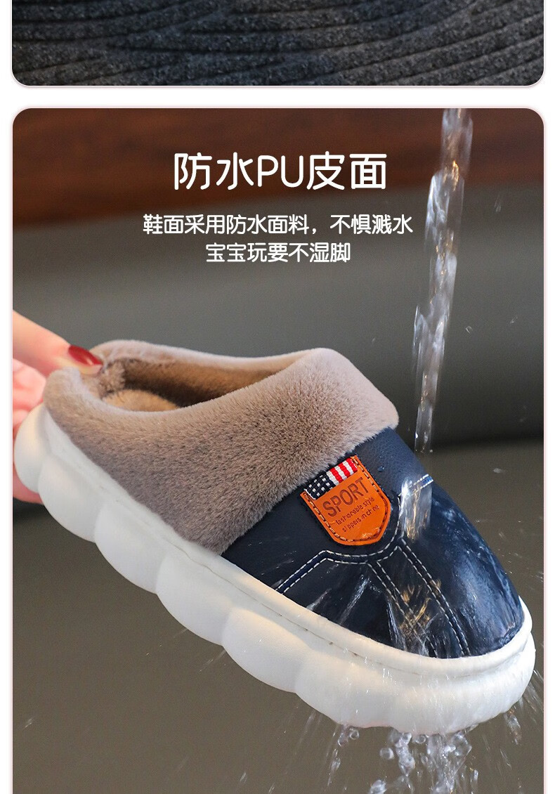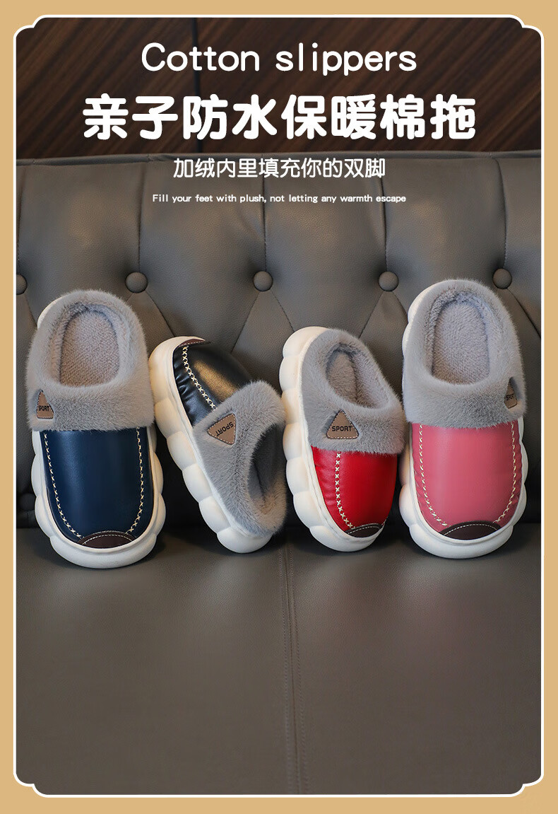 Yiai children's cotton slippers winter boys and girls pu leather waterproof soft sole non-slip parent-child indoor warm plush cotton slippers blue heel 36-37 (one size smaller) inner length 22.5